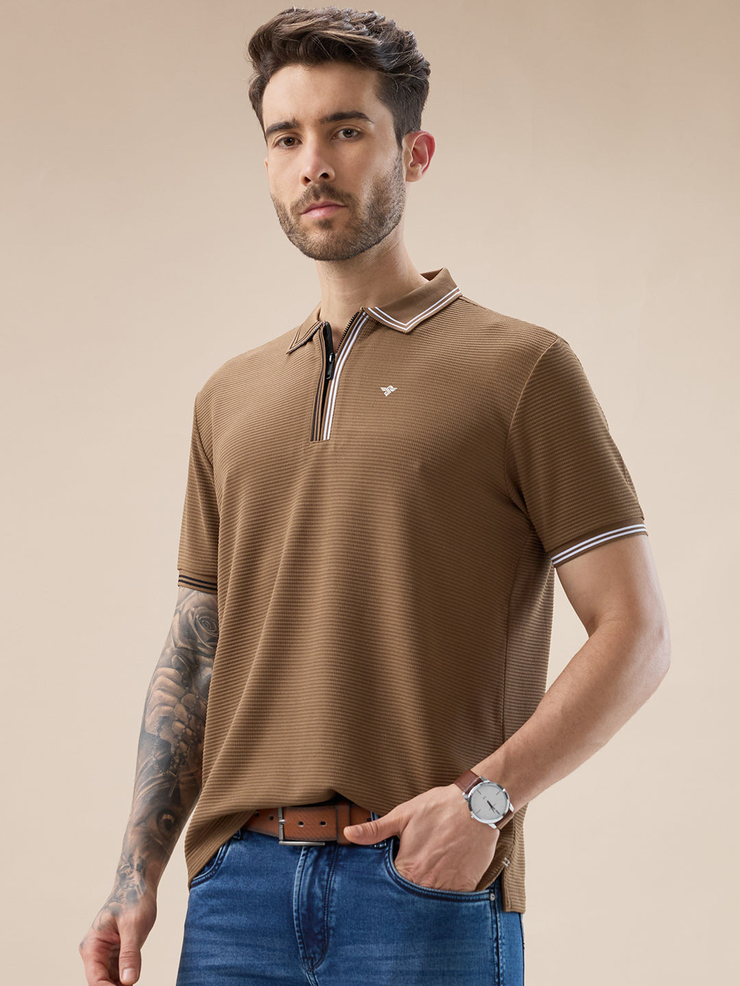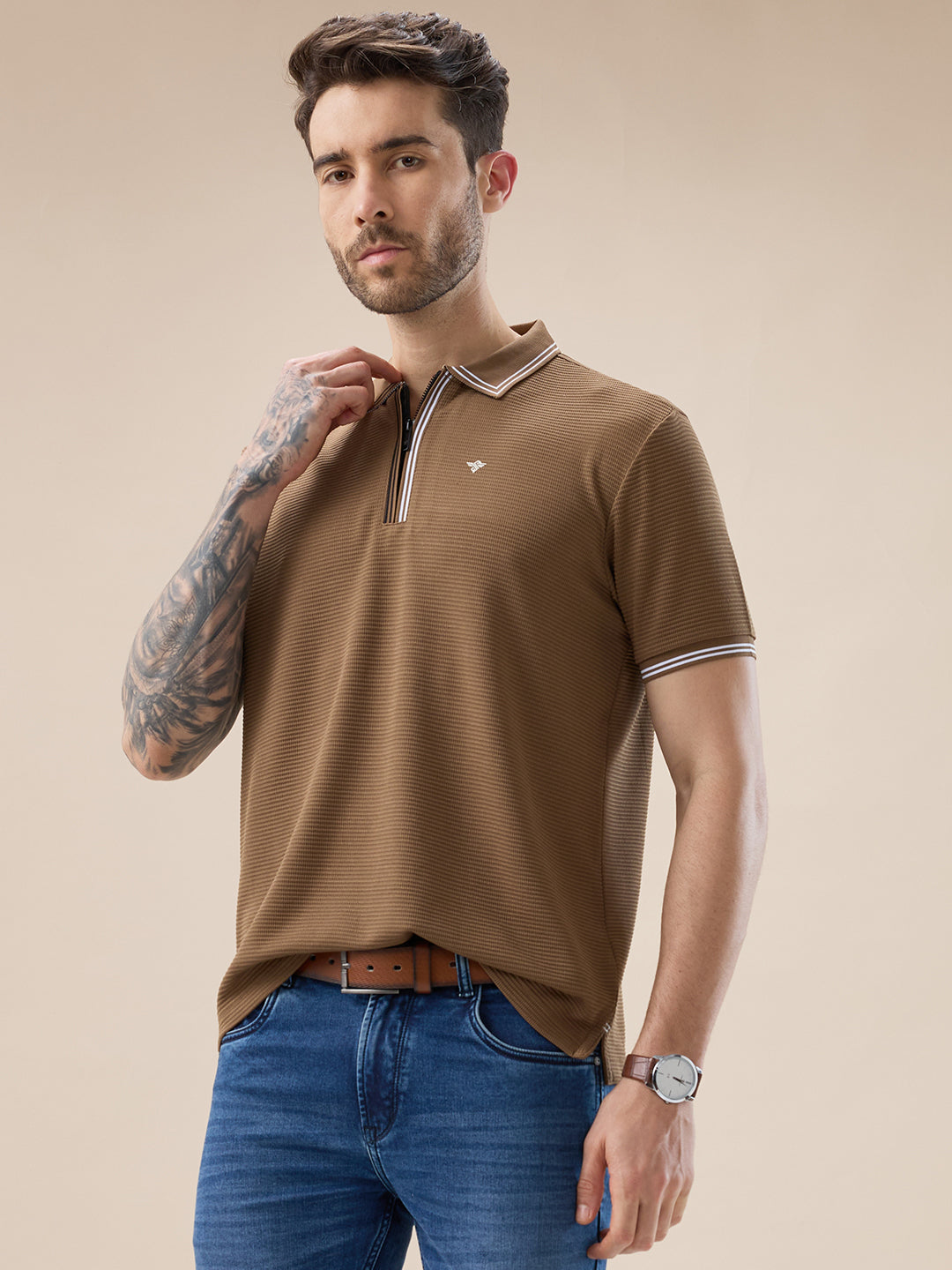 BROWN Men's Solid Textured Half Sleeves Polo Tshirt With Haf zipper and tipping Details