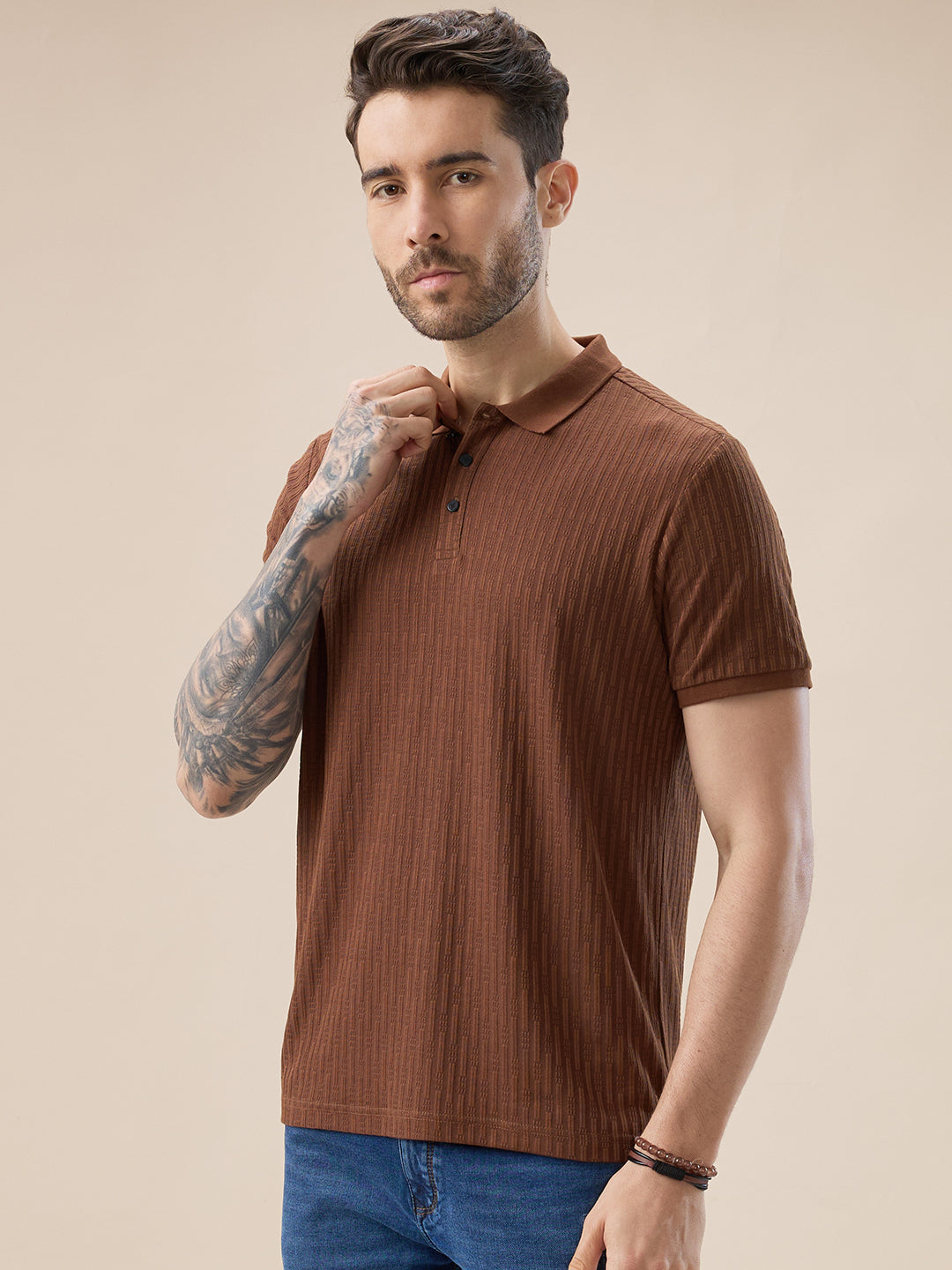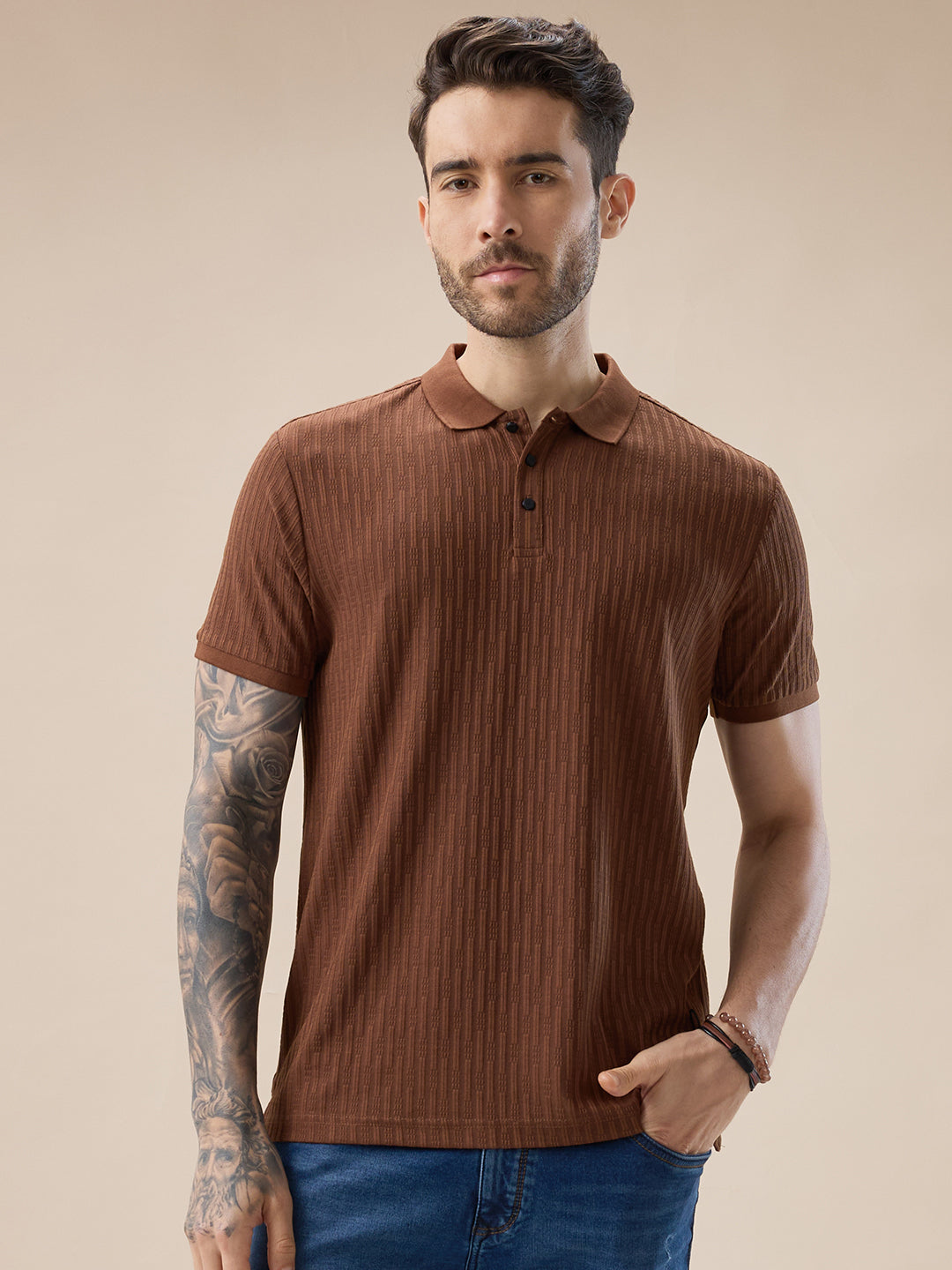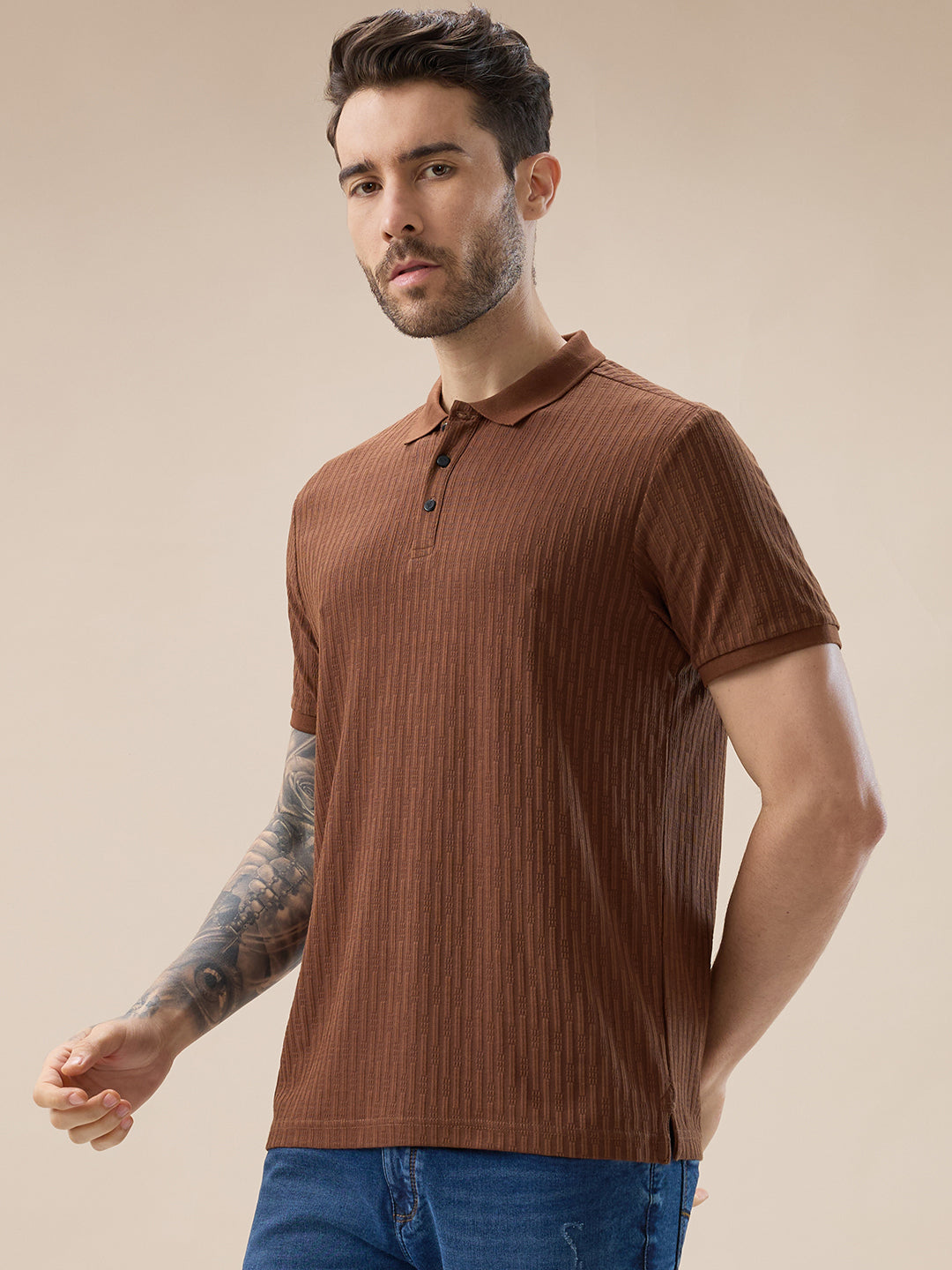 BROWN Men's Solid Striped Textured Half Sleeves Regular Fit Polo T-shirt