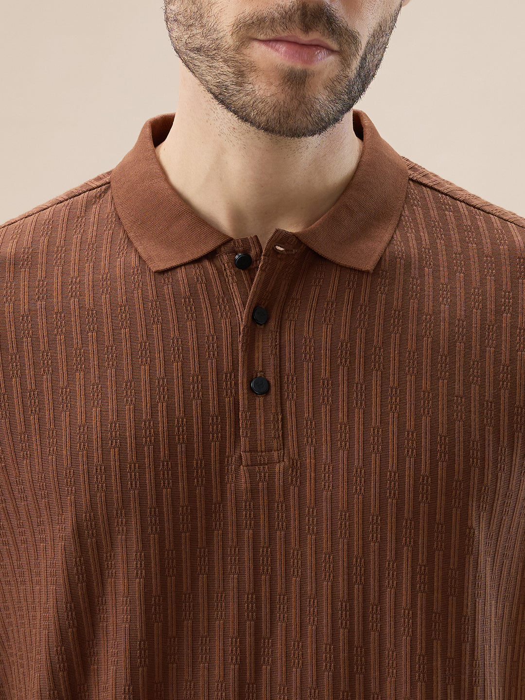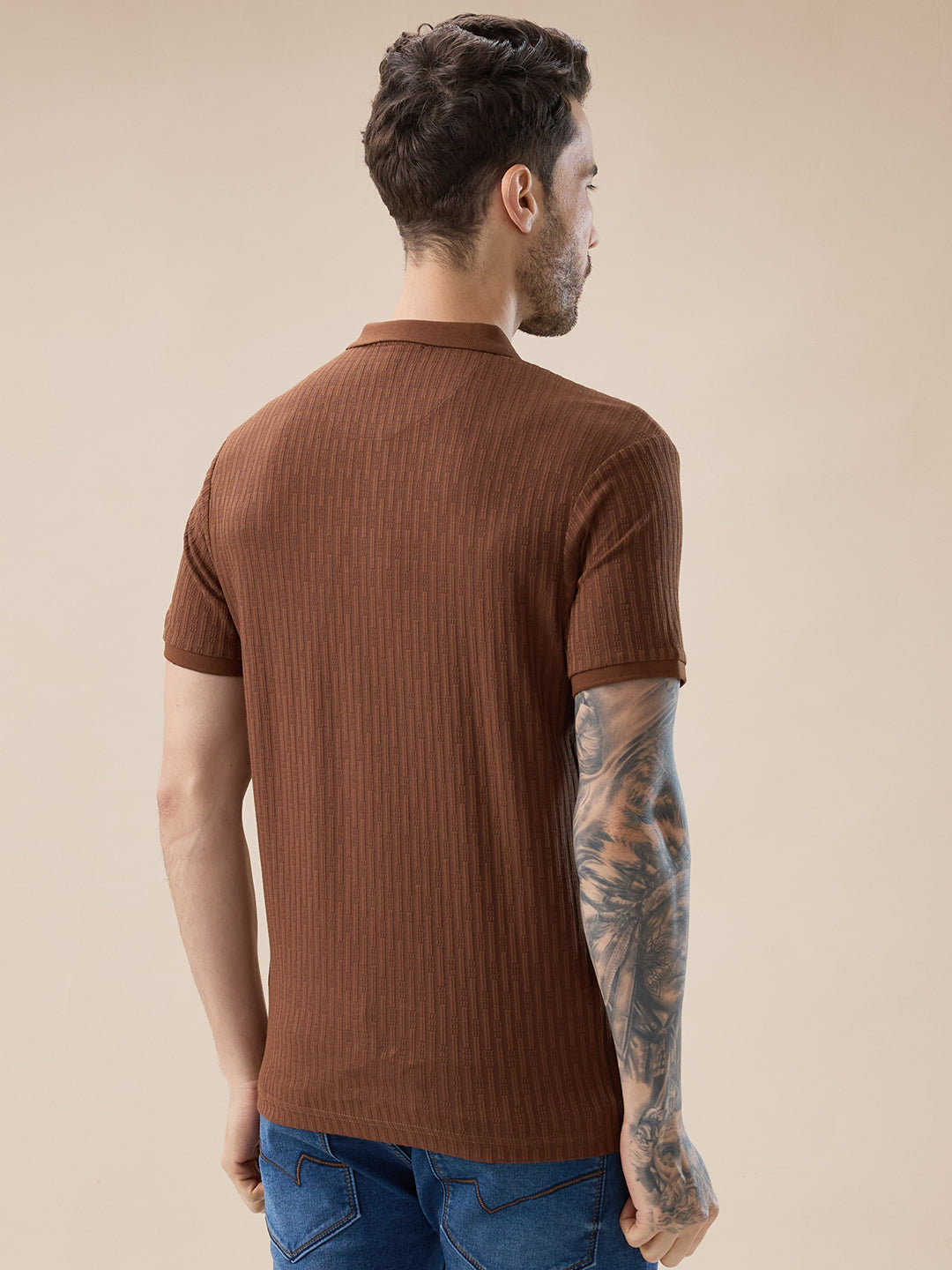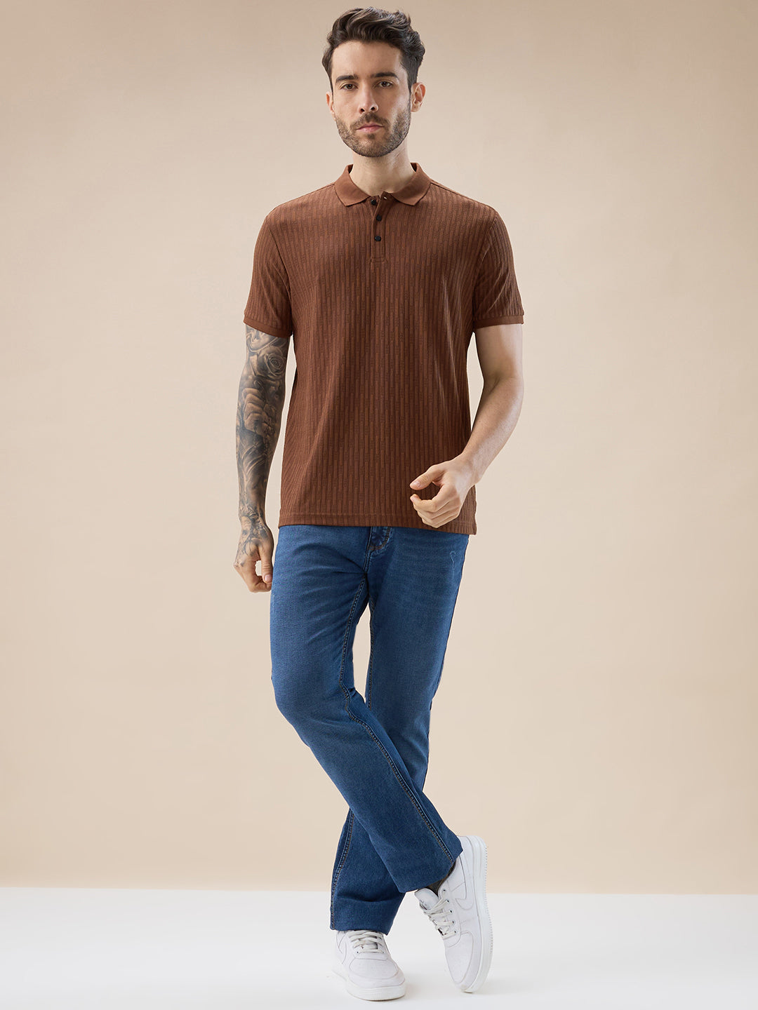 BROWN Men's Solid Striped Textured Half Sleeves Regular Fit Polo T-shirt