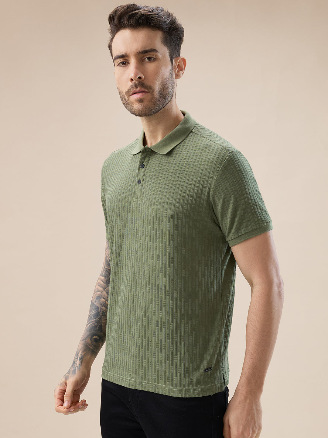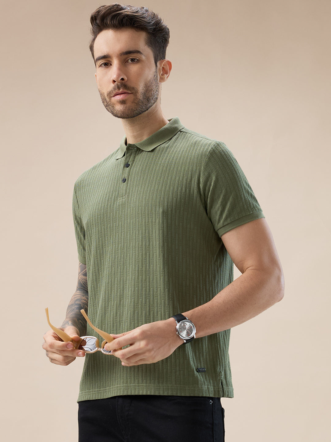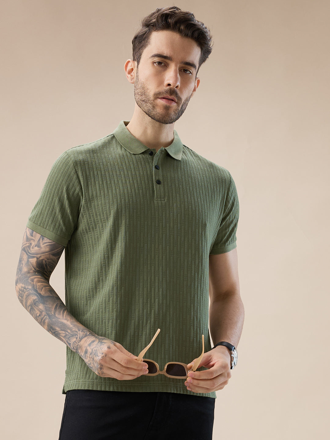 LT.OLIVE Men's Solid Striped Textured Half Sleeves Regular Fit Polo T-shirt