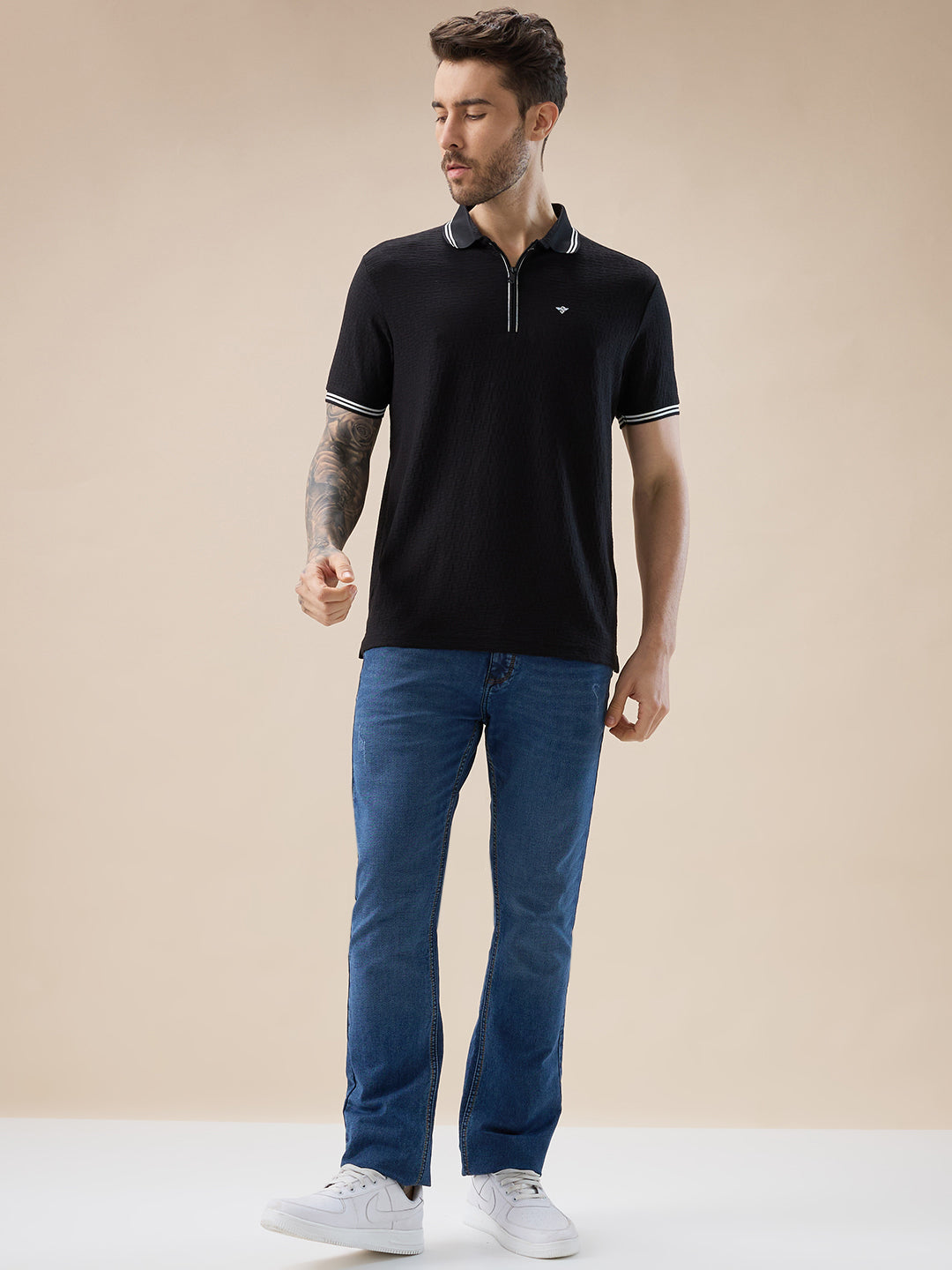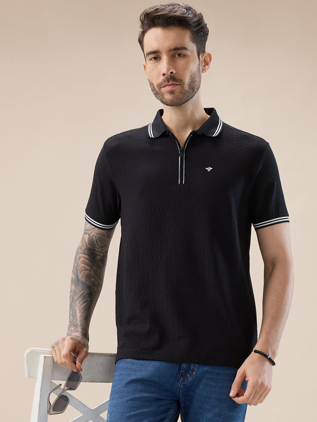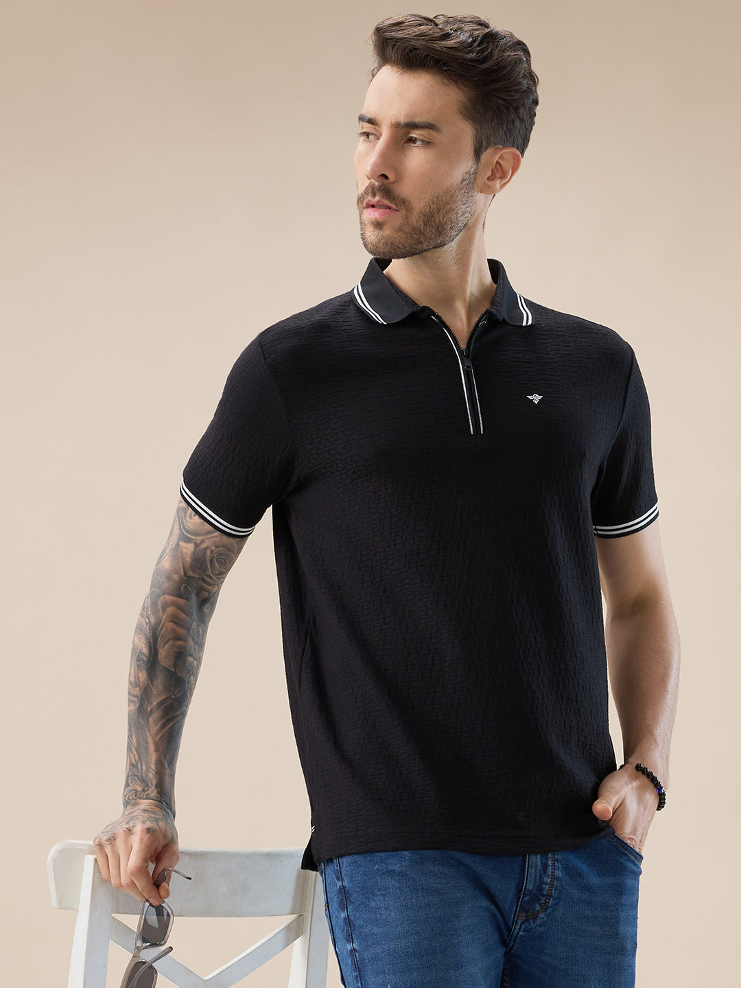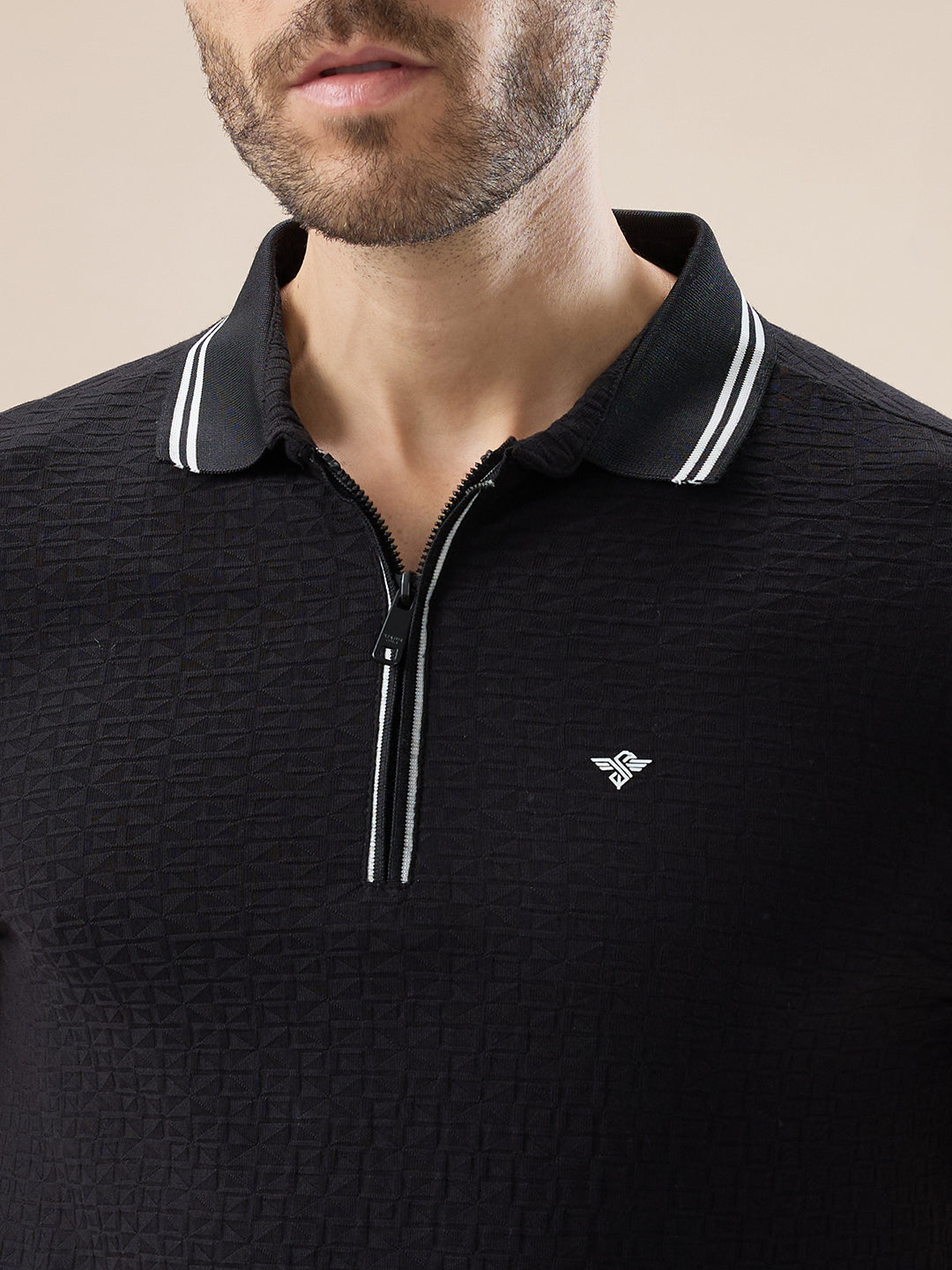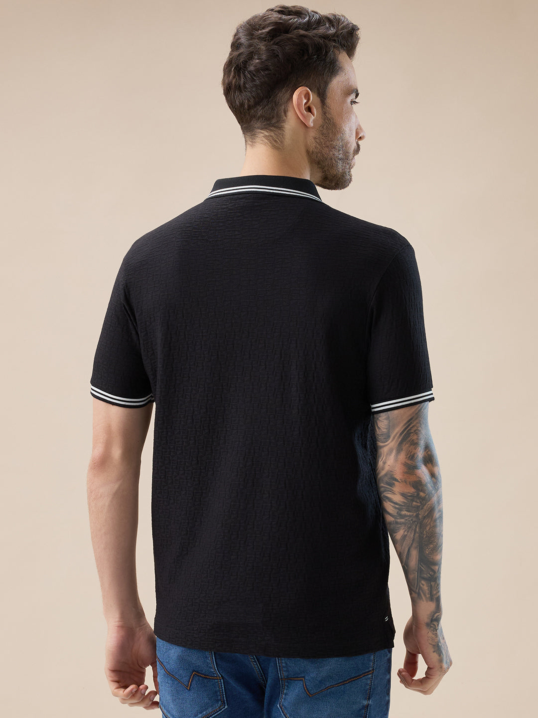 BLACK Men's Solid Textured Half Sleeves Polo Tshirt With Haf zipper and tipping Details