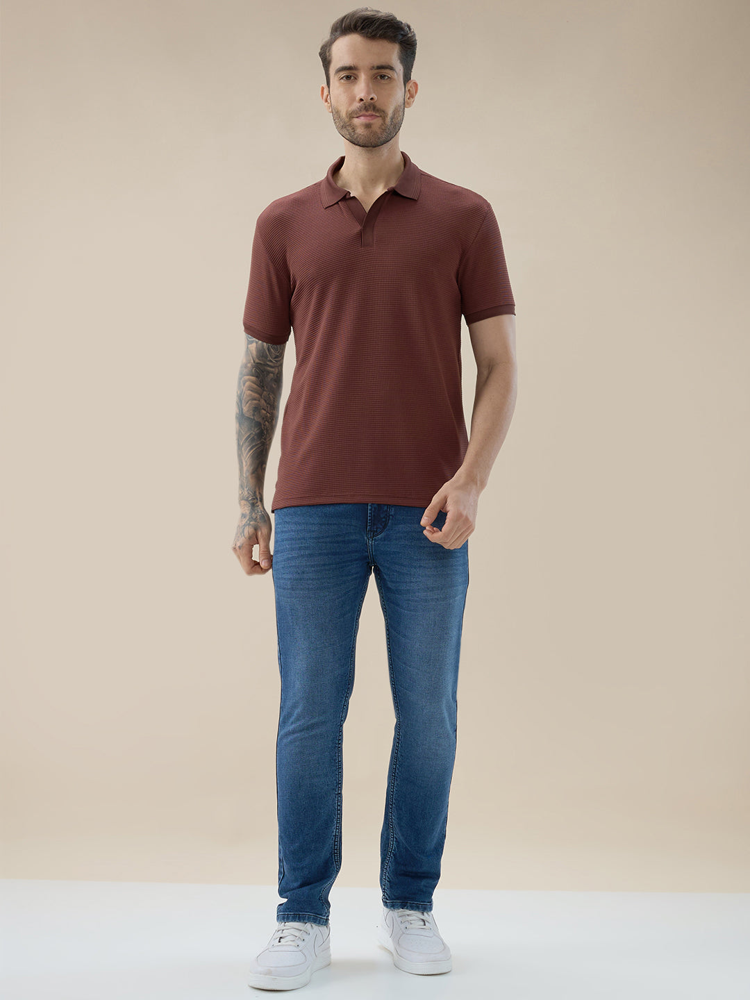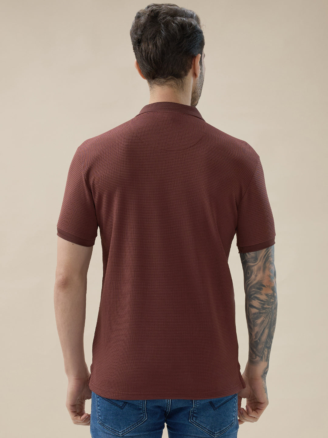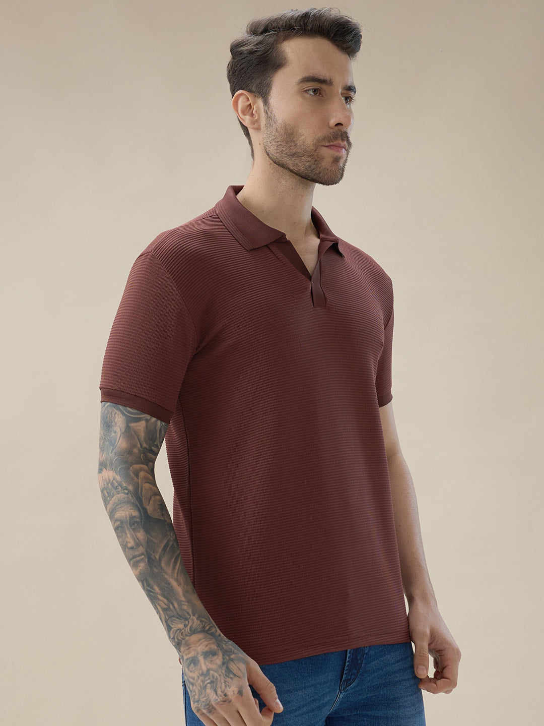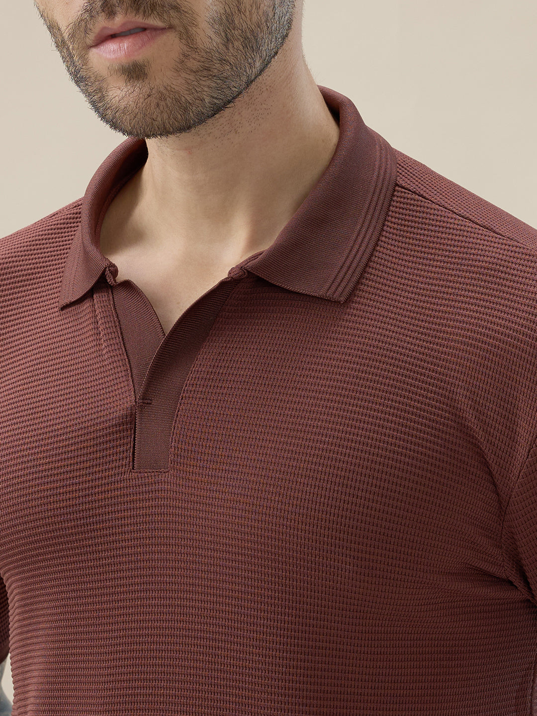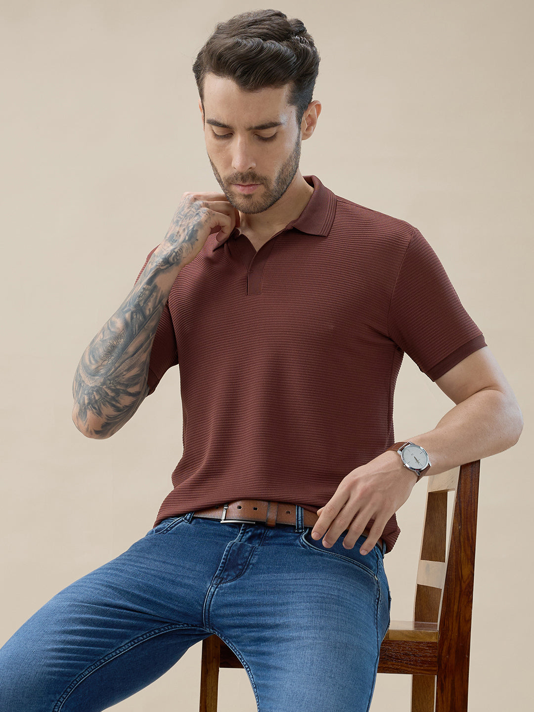 COFFEE Men’s Solid Textured Regular Fit Half Sleeve Polo T-Shirt with No-Button Placket