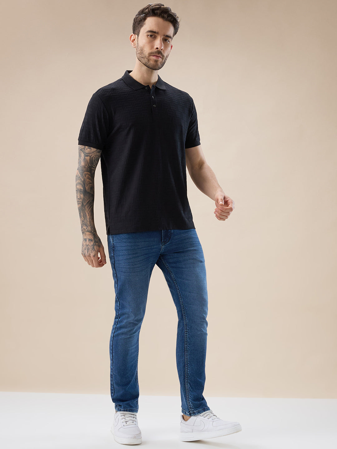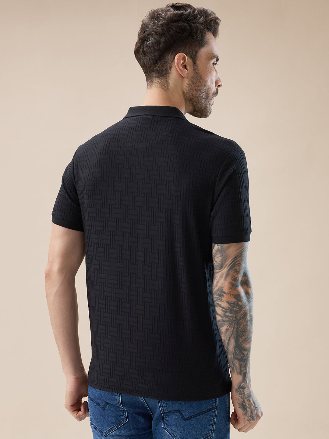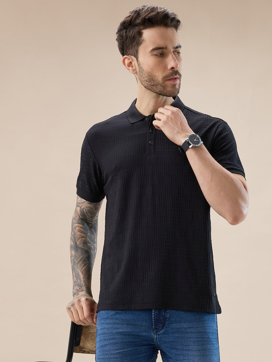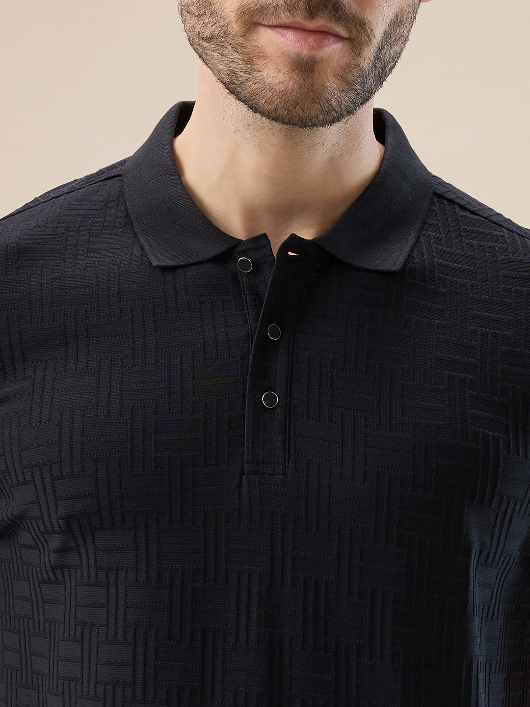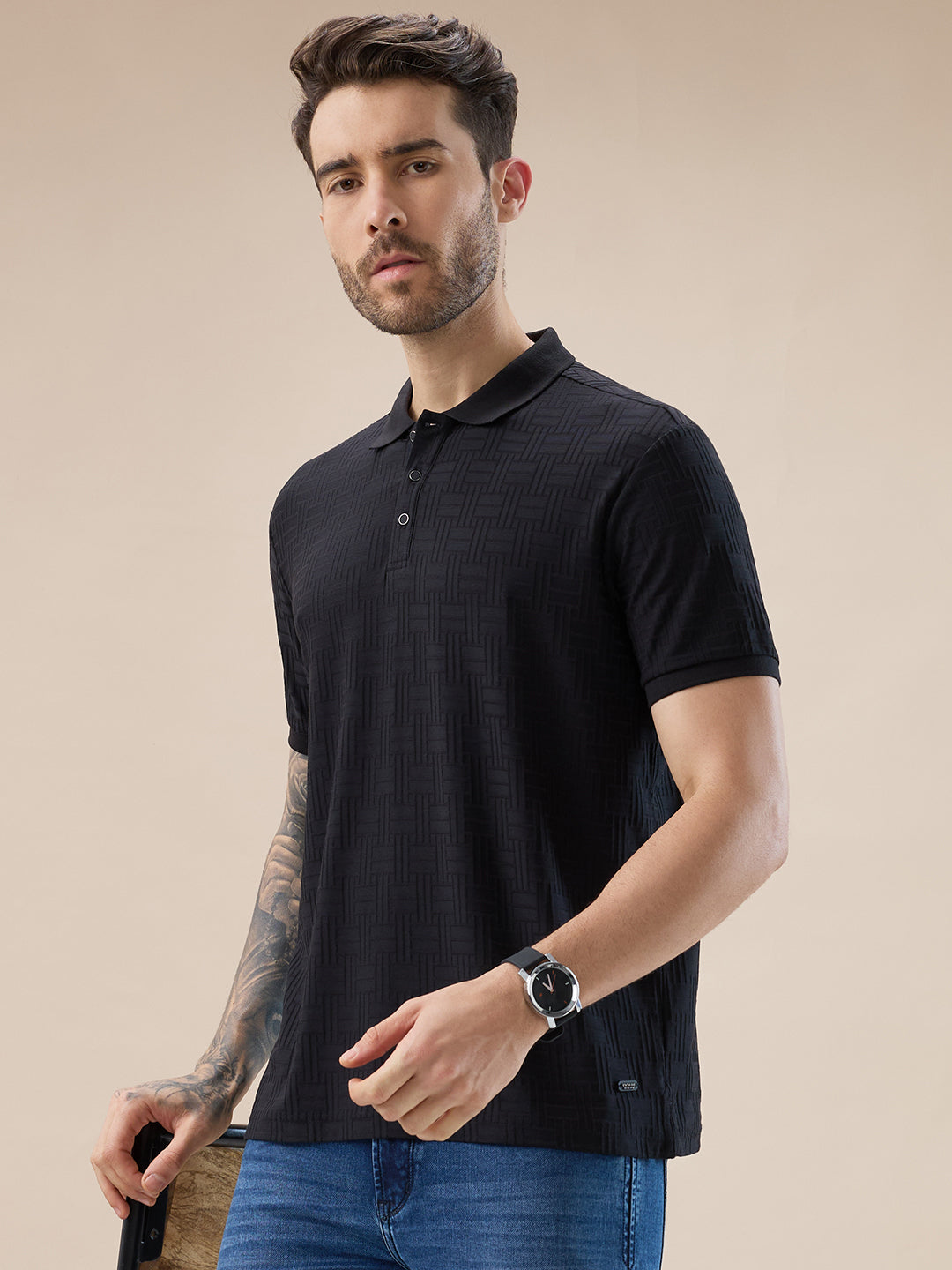 BLACK Men's Solid Textured Half Sleeves Polo T-shirt
