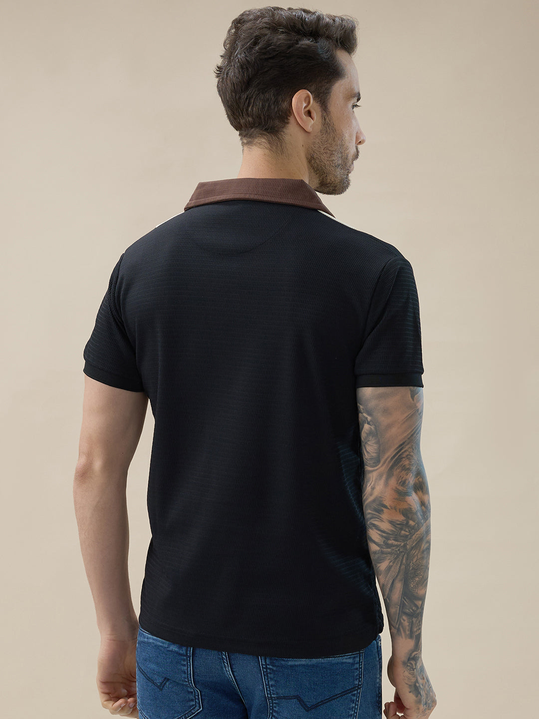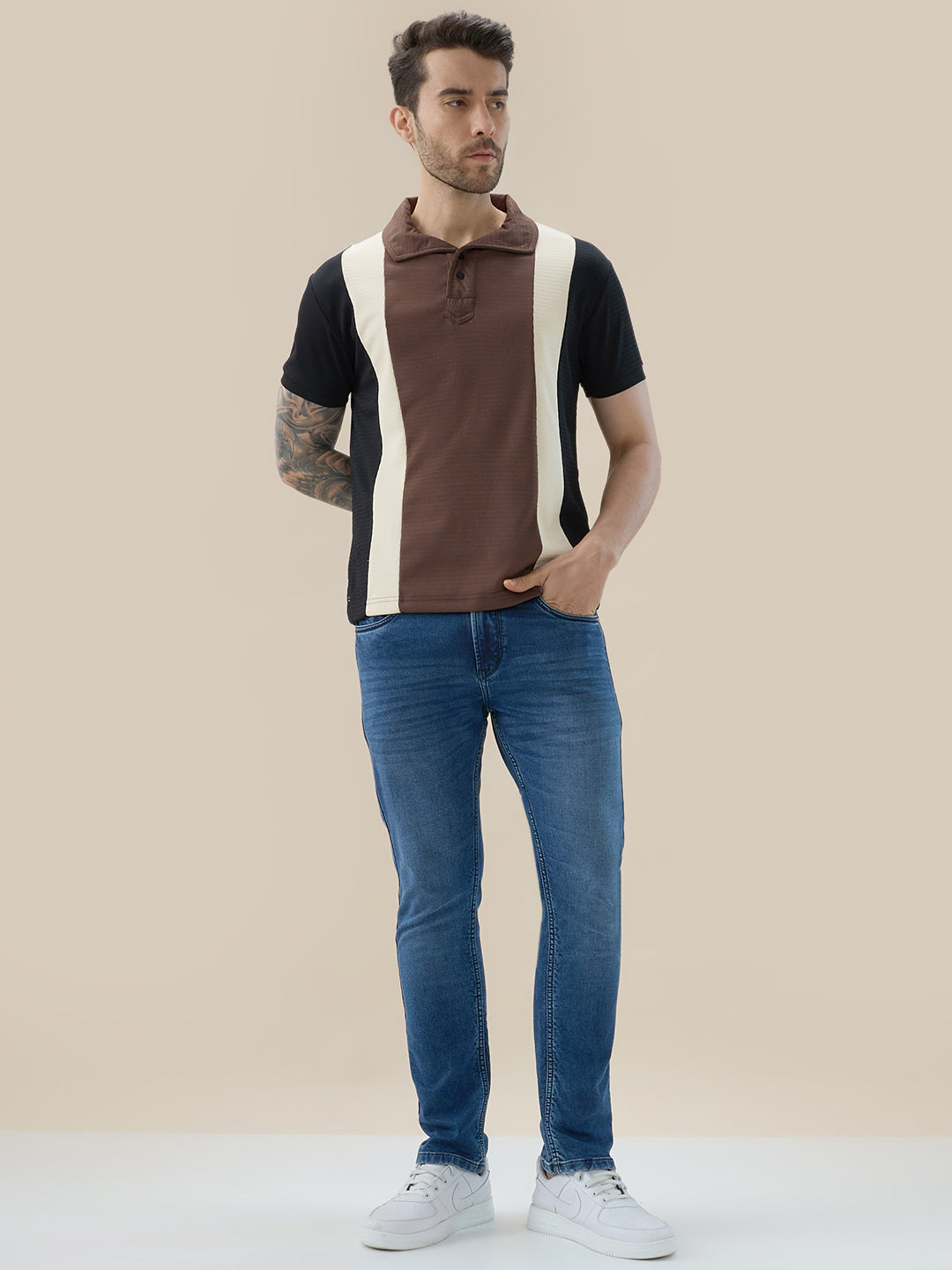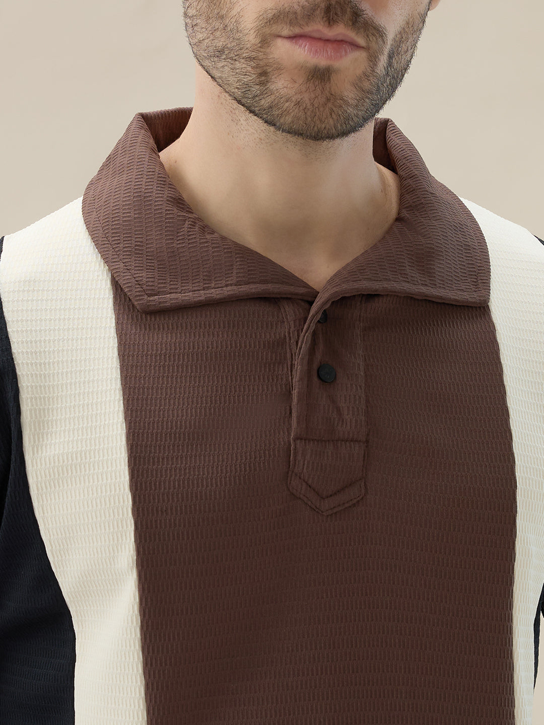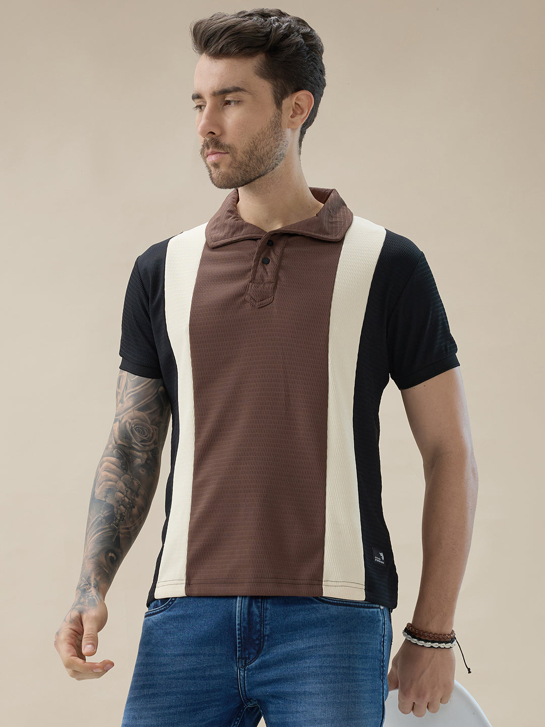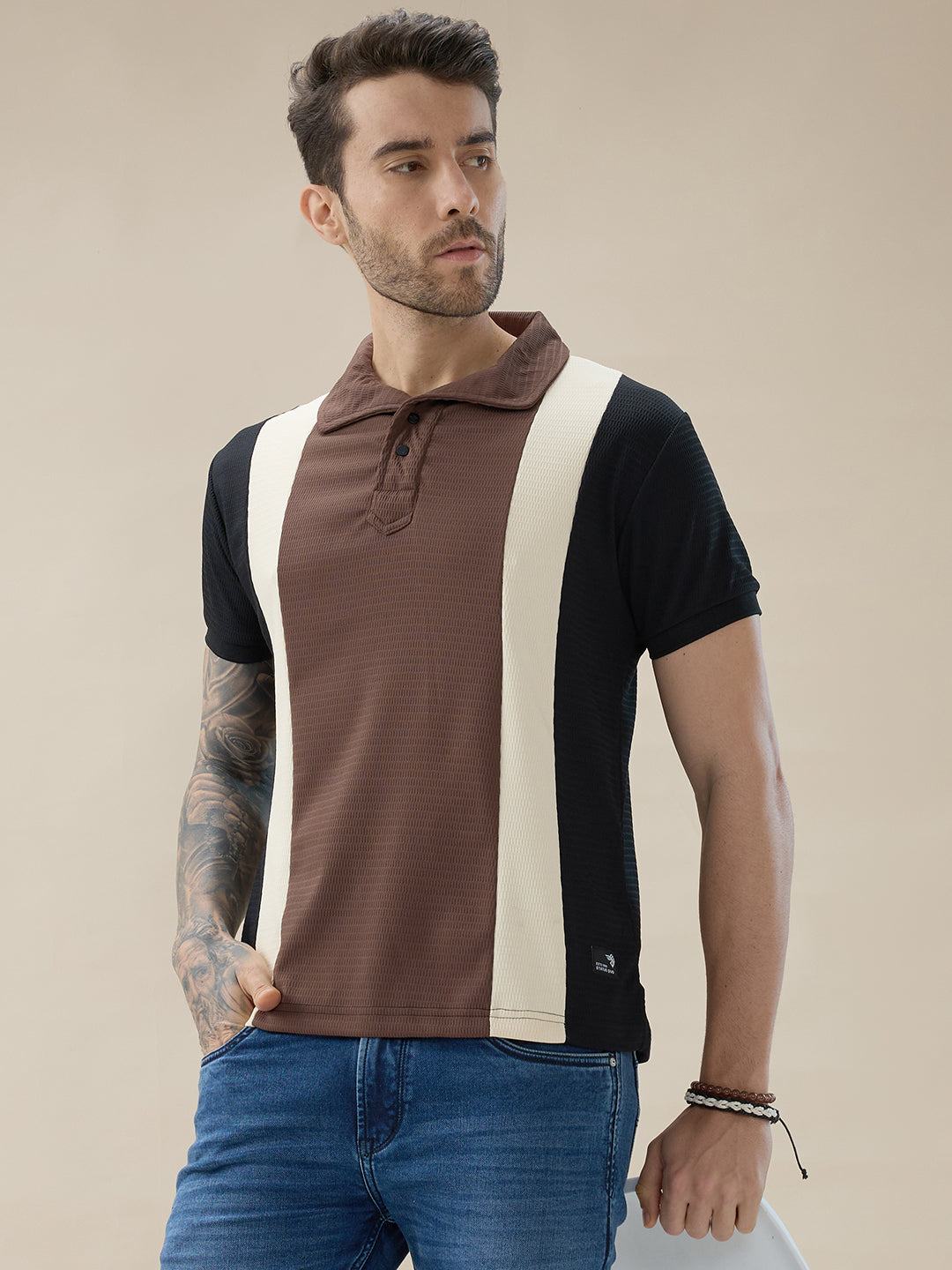 BROWN Men's Colorblocked Textured Half Sleeve Regular Fit Polo T Shirt with Button Closur
