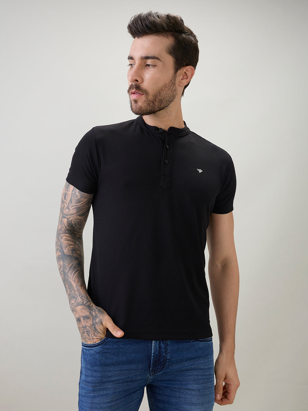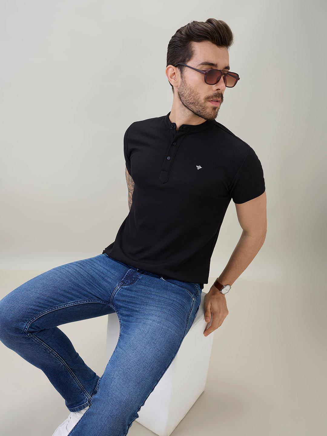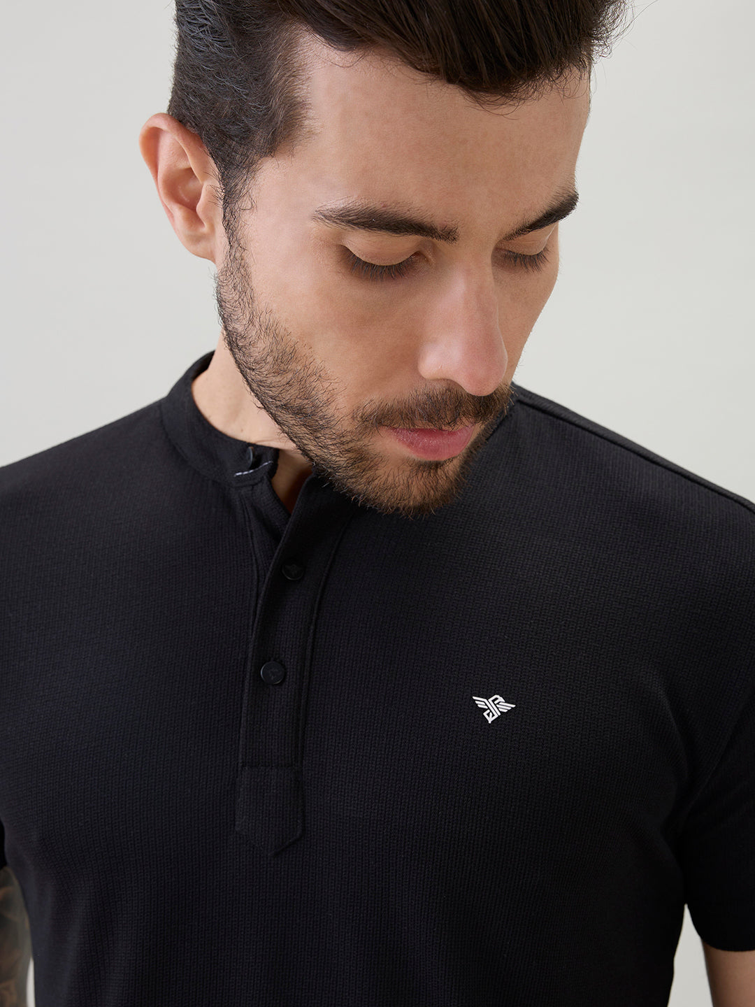 BLACK Men's Regular Fit Henley T-Shirt Half Slevees with Button Closure and Logo