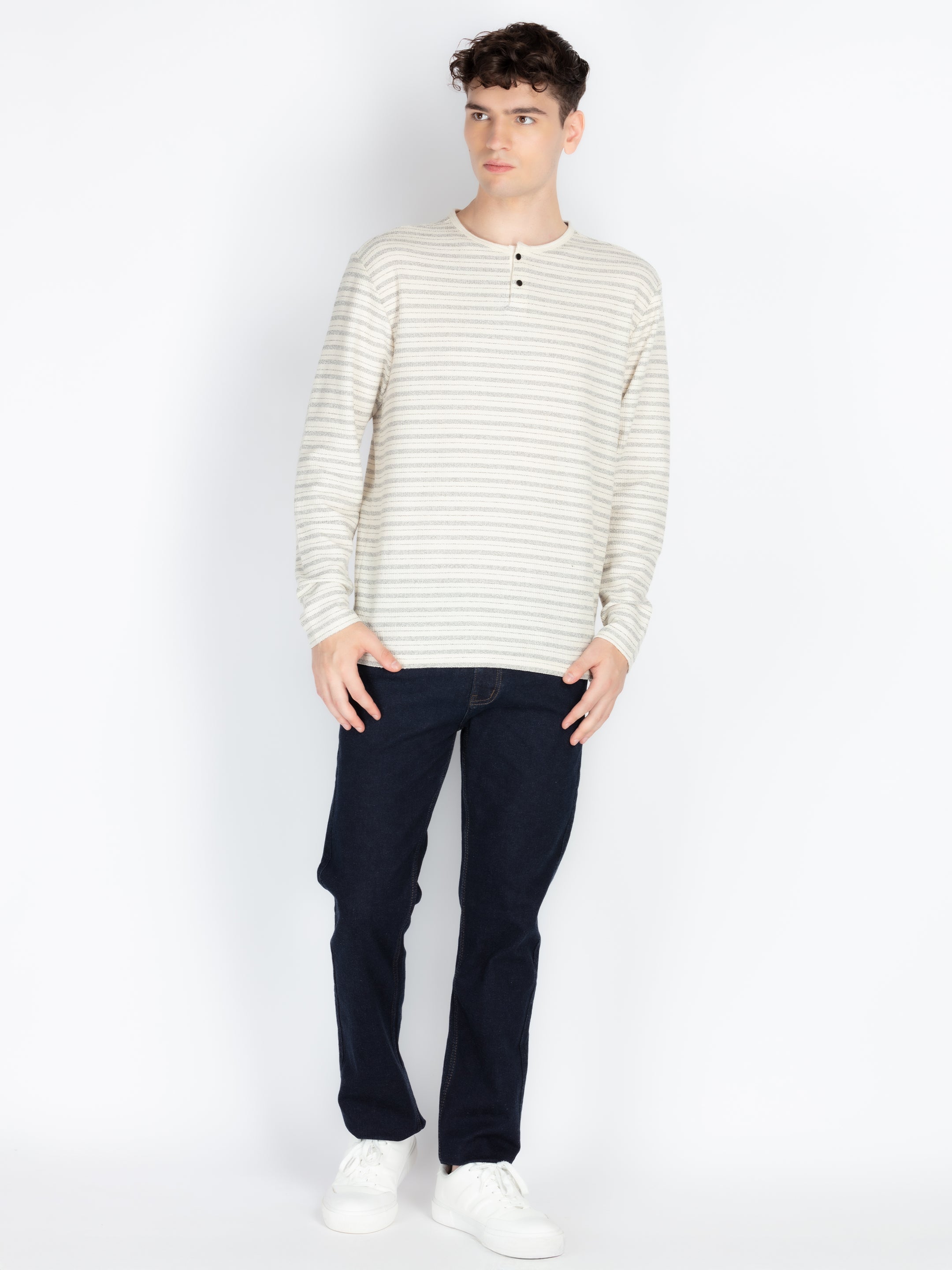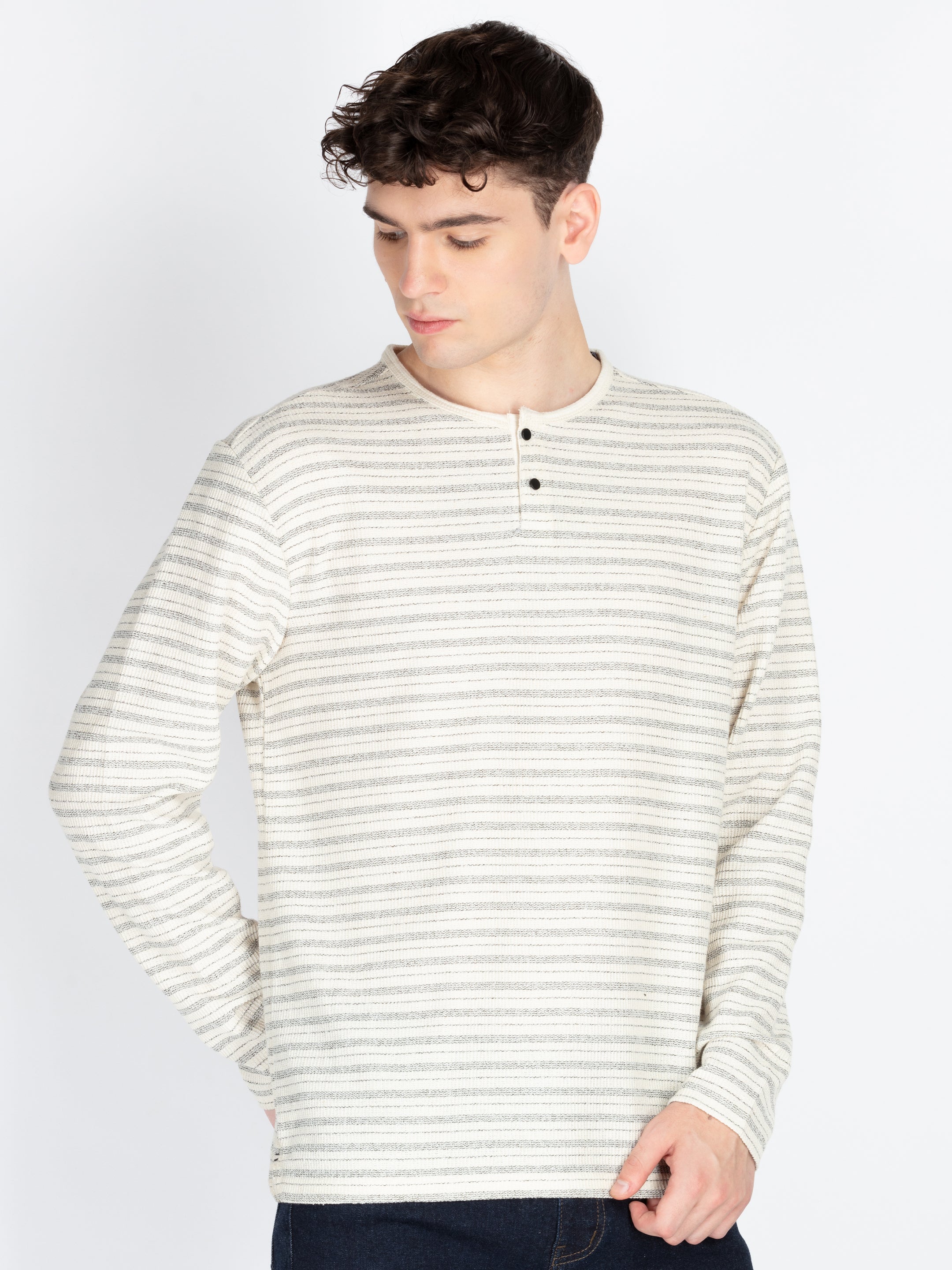 Off White Mens Striped Henley Neck T-Shirt With Full Sleeves