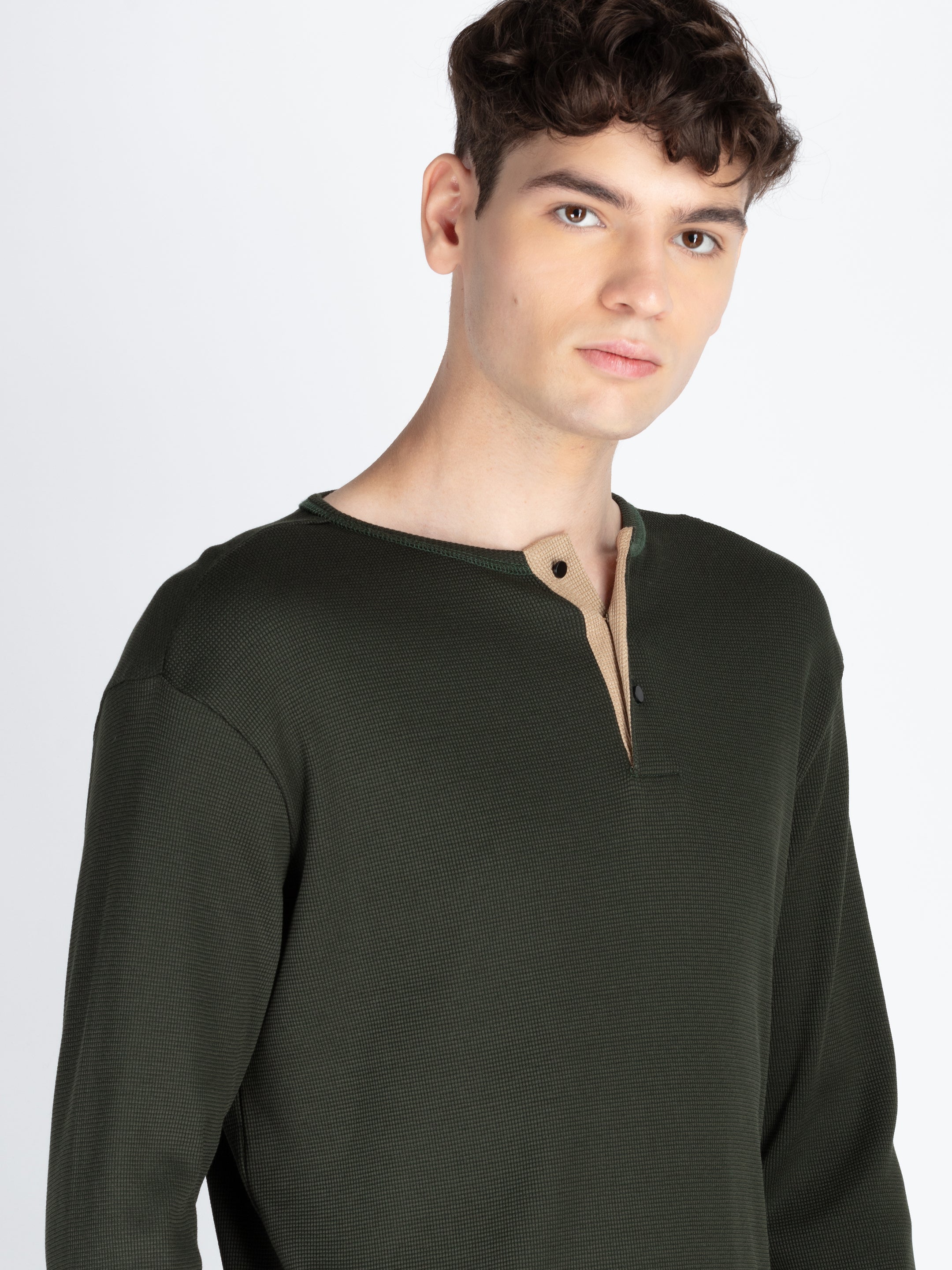 Olive Mens Solid Henley Neck T-Shirt With Full Sleeves