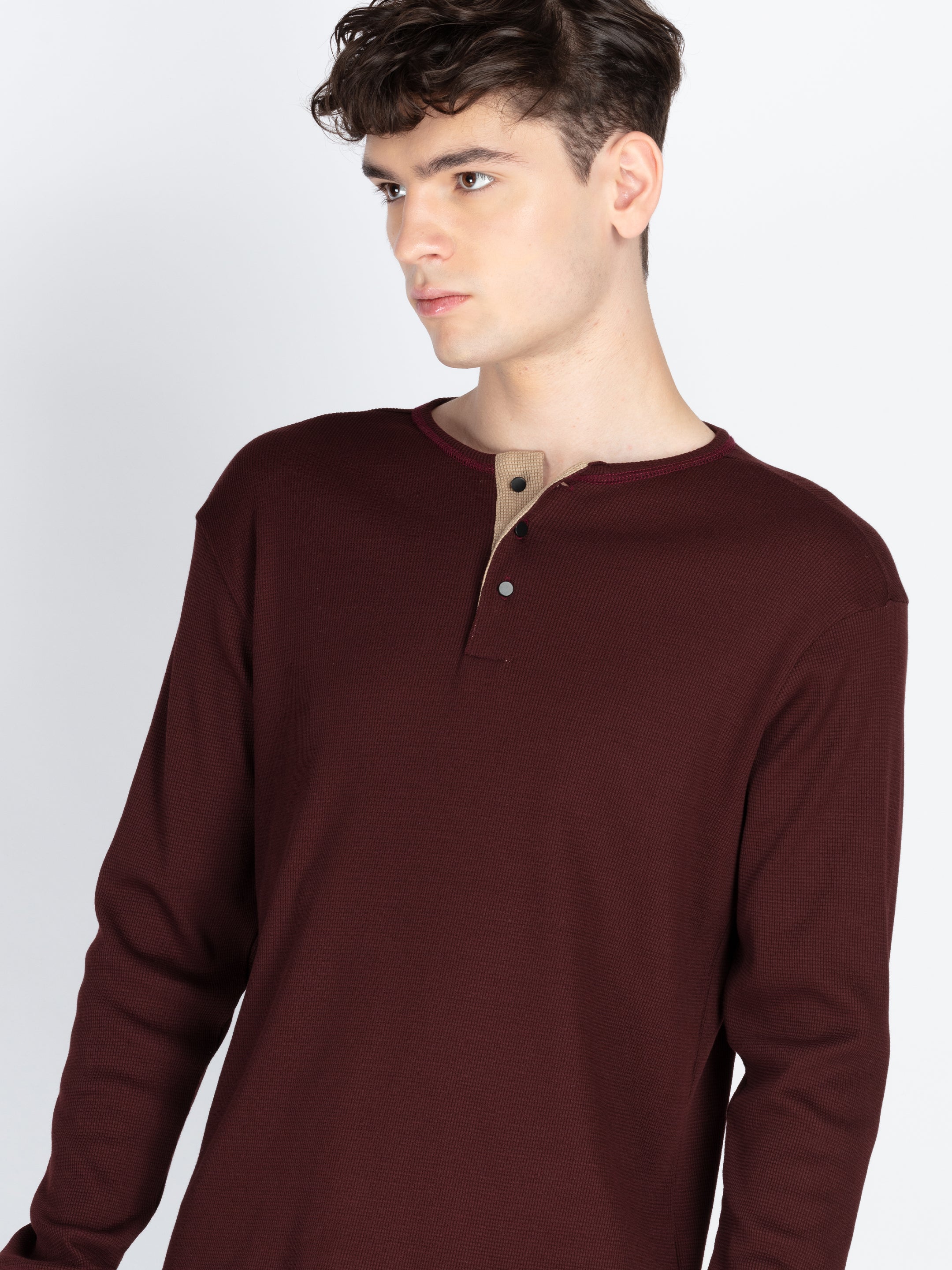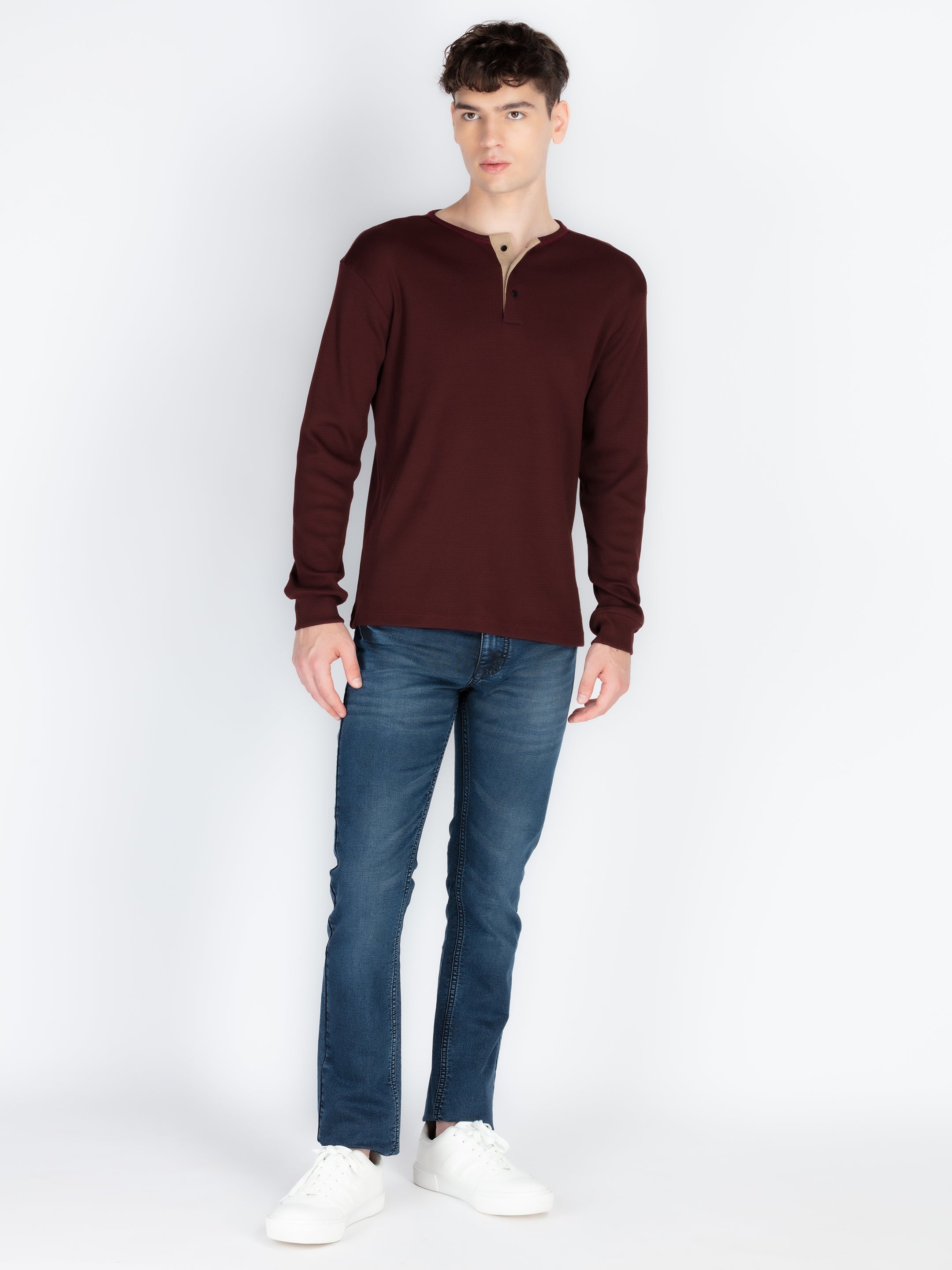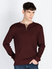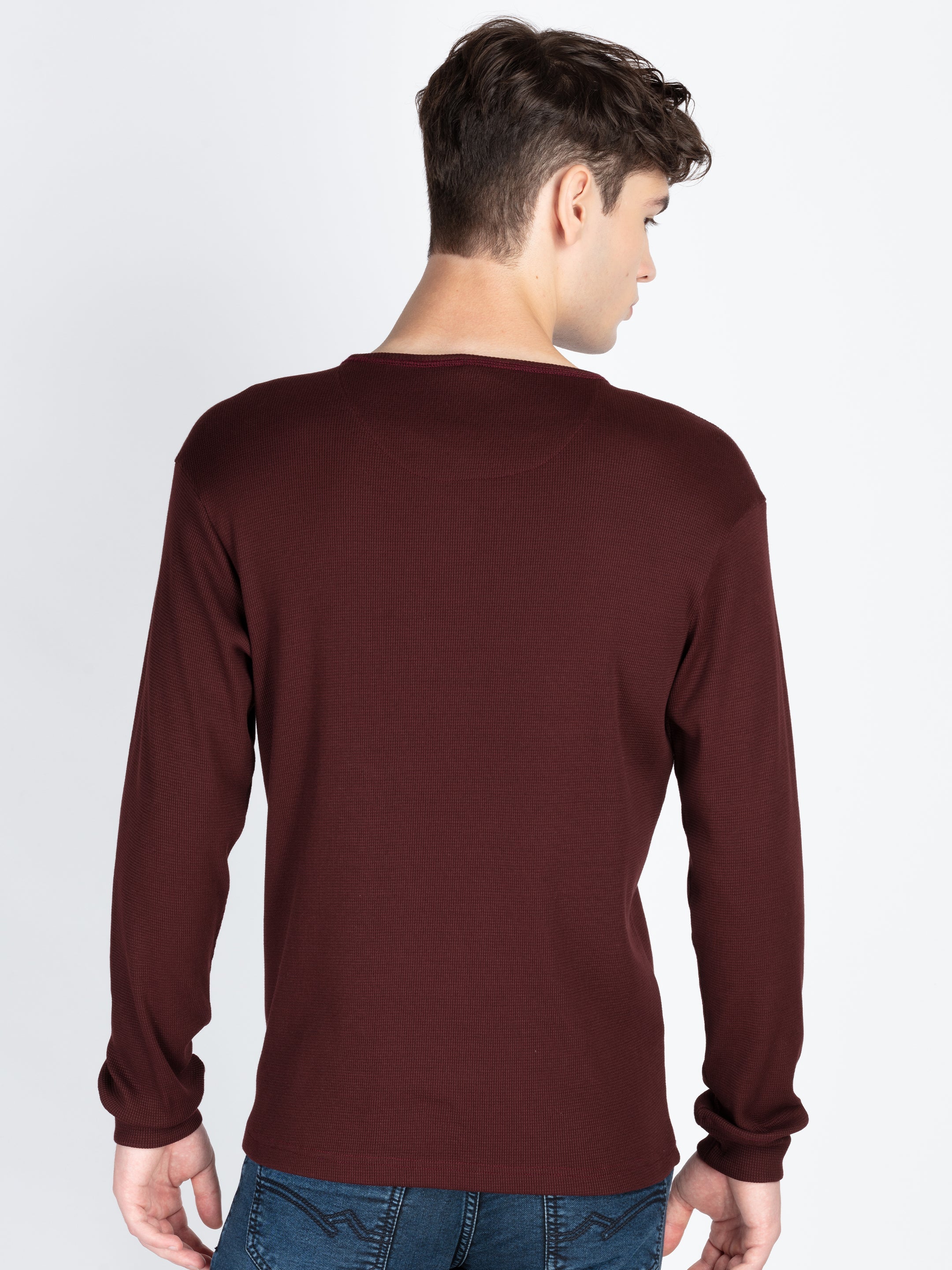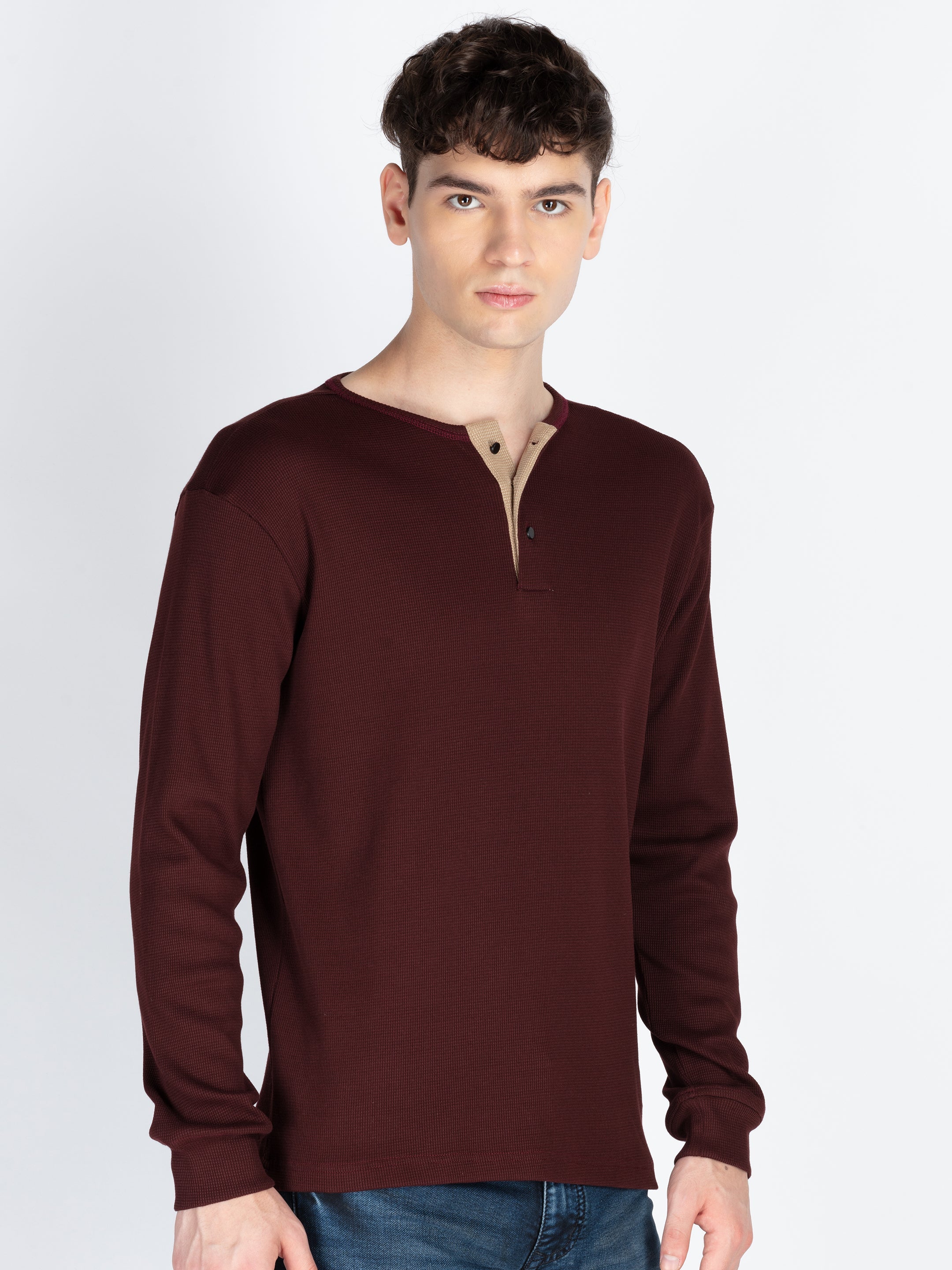 Wine Mens Solid Henley Neck T-Shirt With Full Sleeves