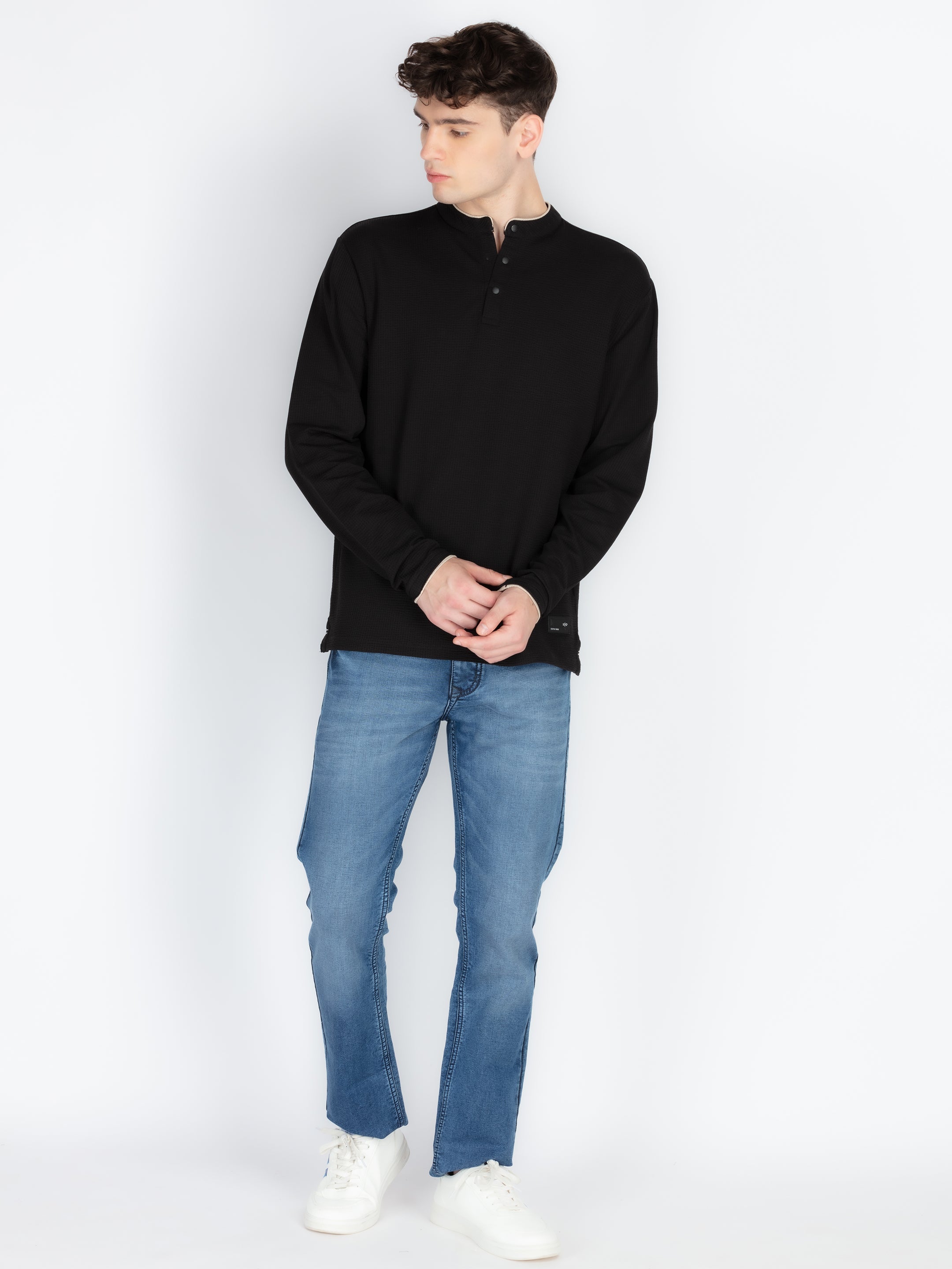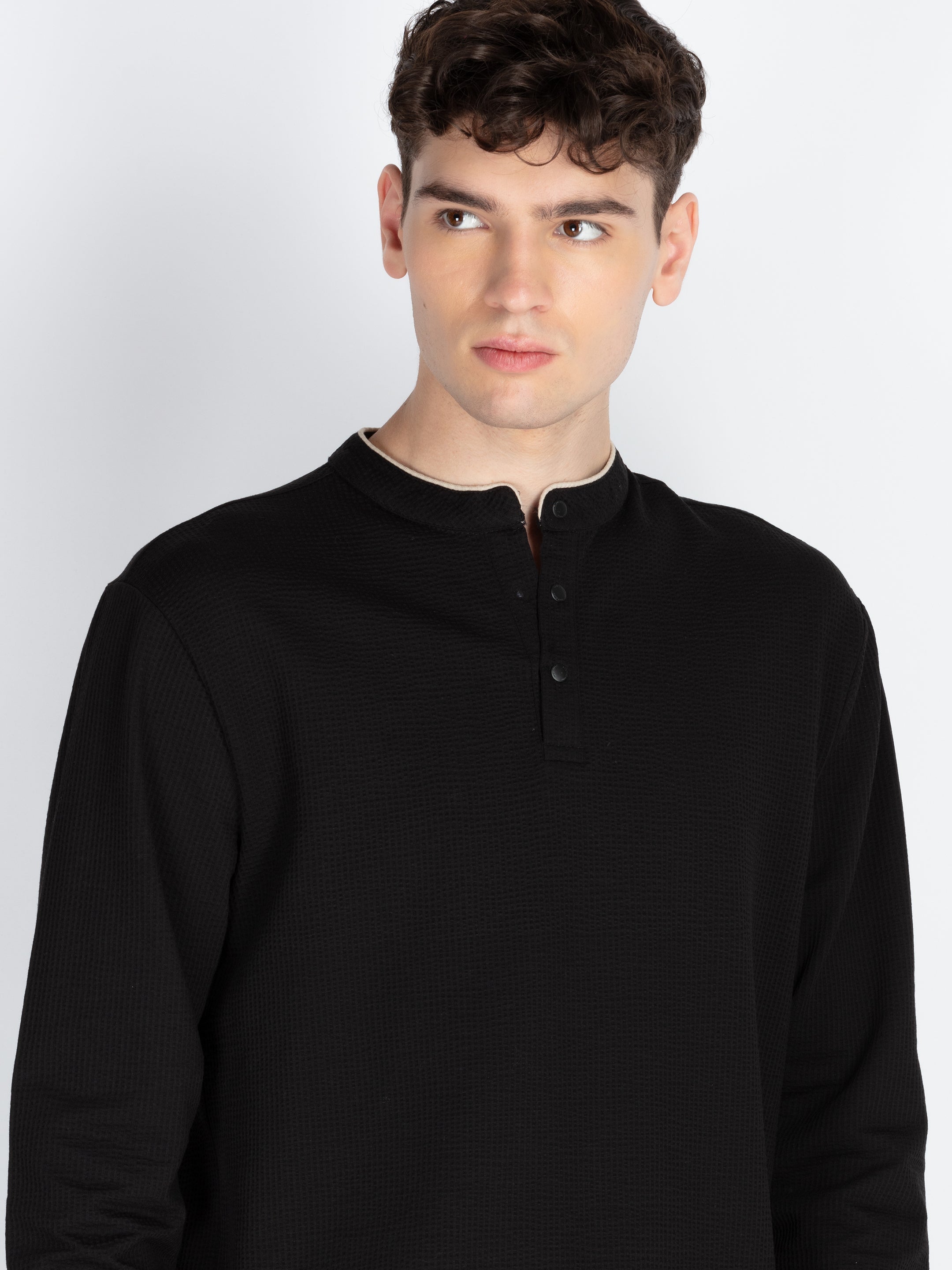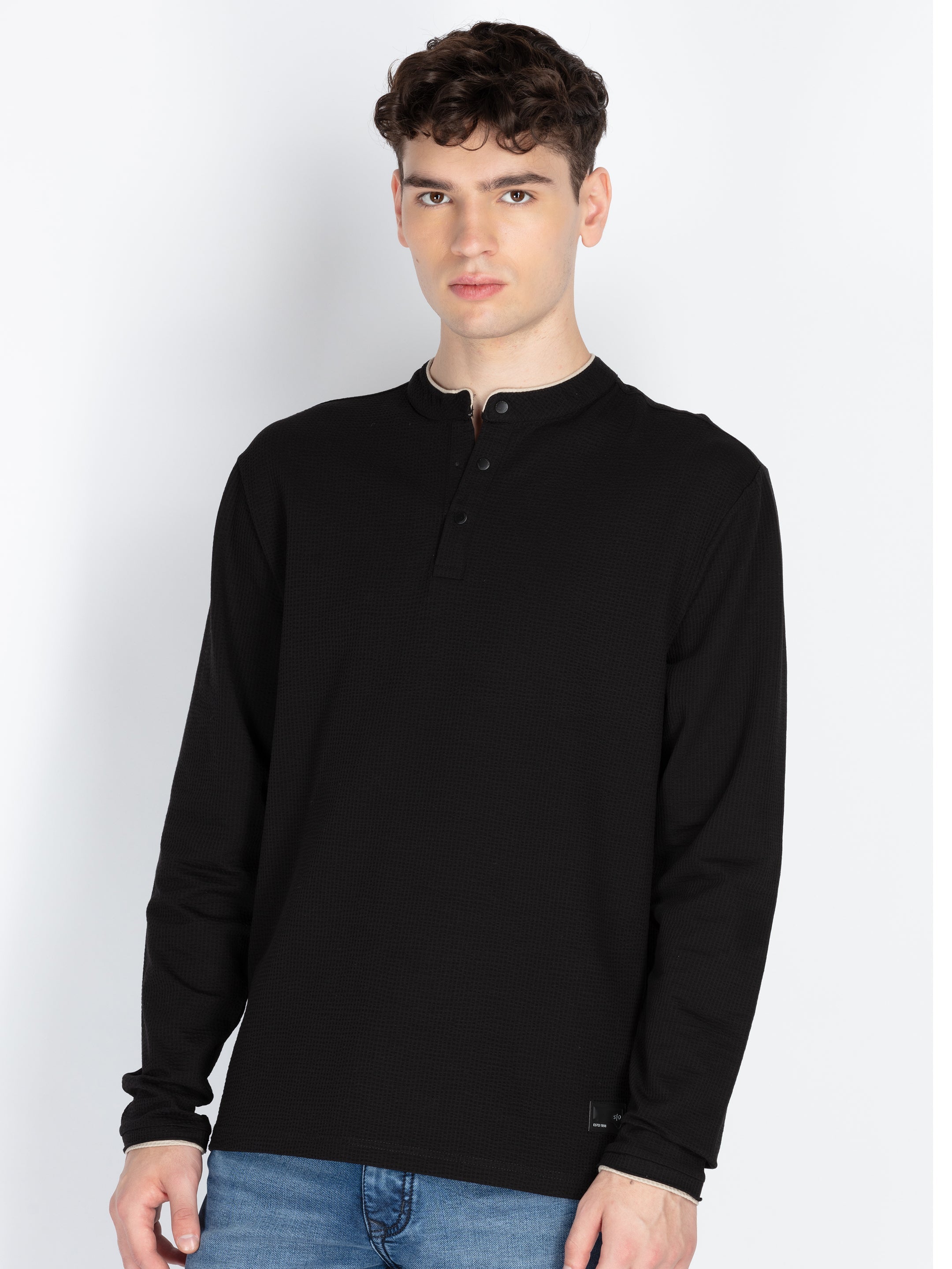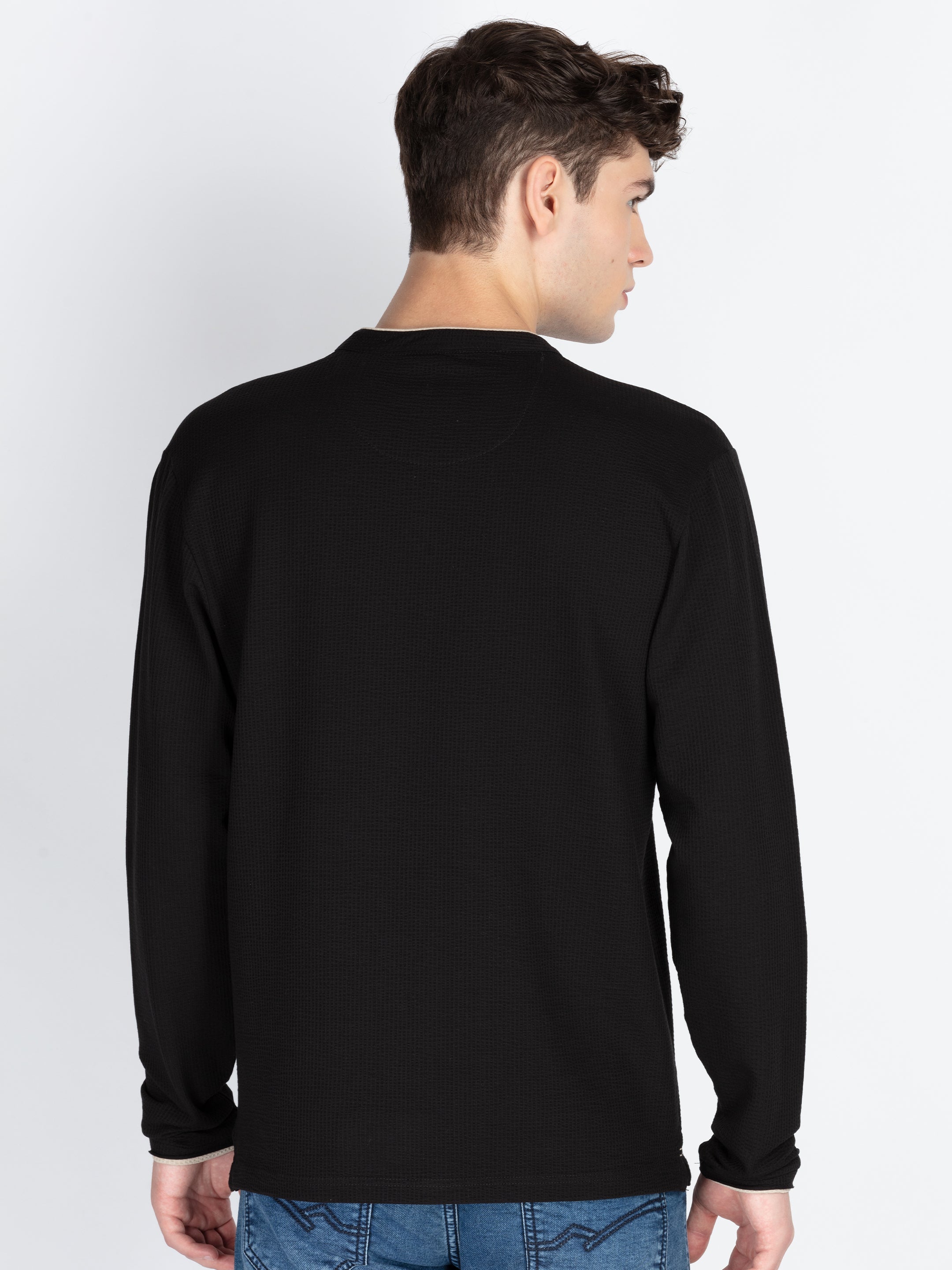 Black Mens Solid Henley Neck T-Shirt With Full Sleeves