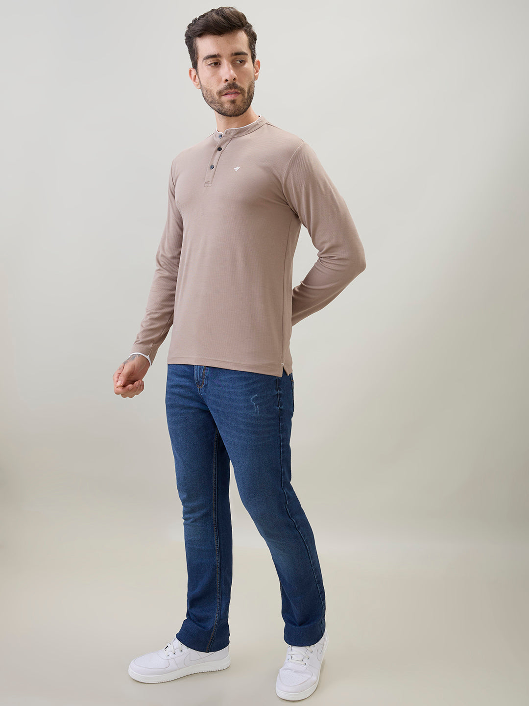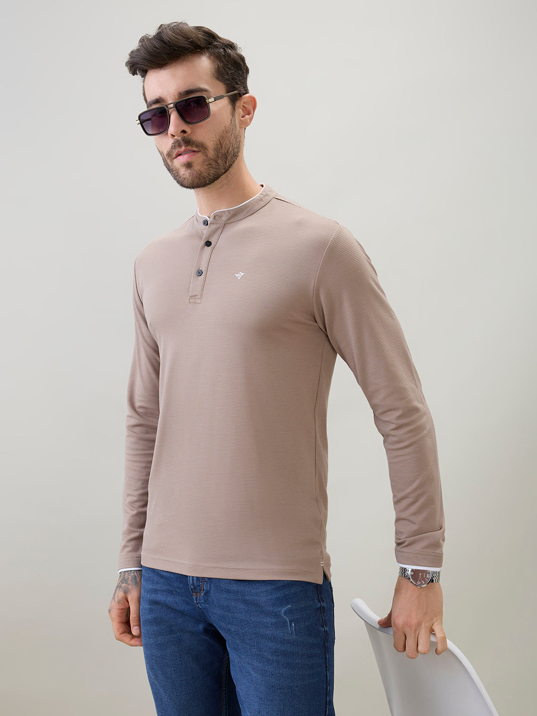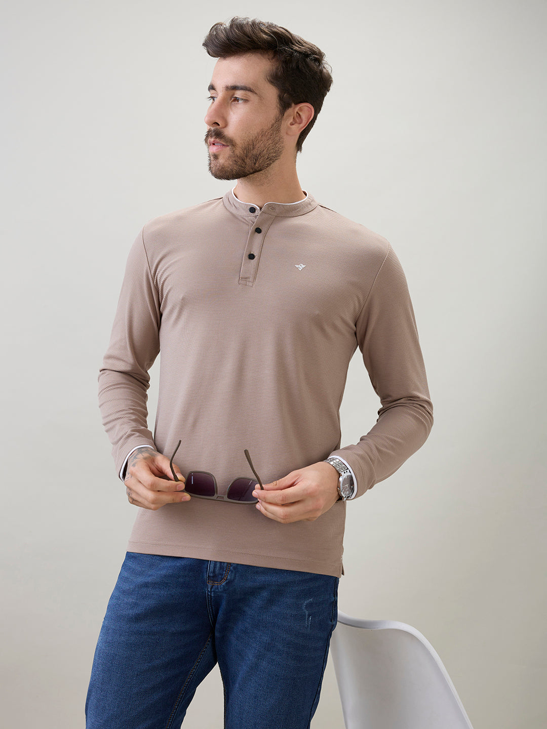 BEIGE Men's Solid Henley Neck Regular Fit Full Sleeve T-Shirt with Logo