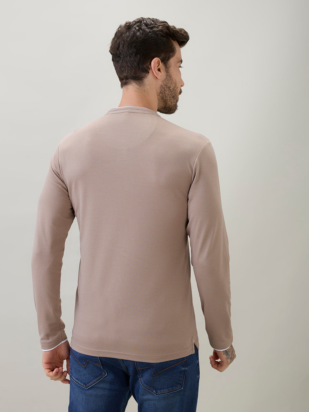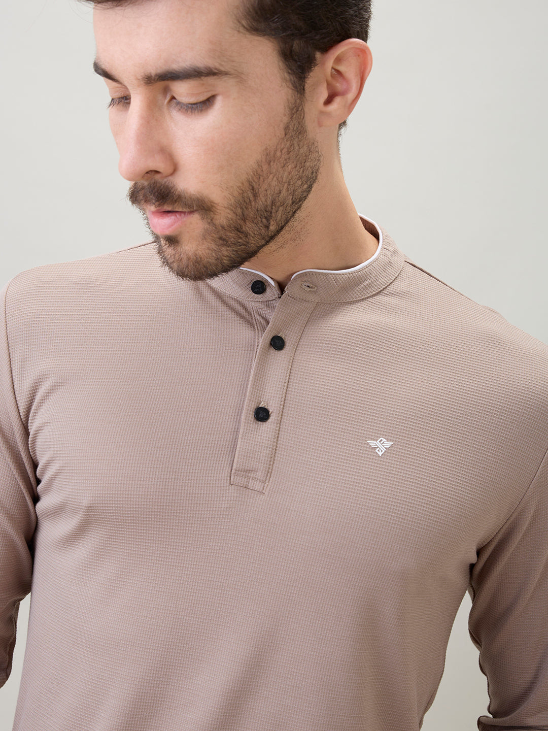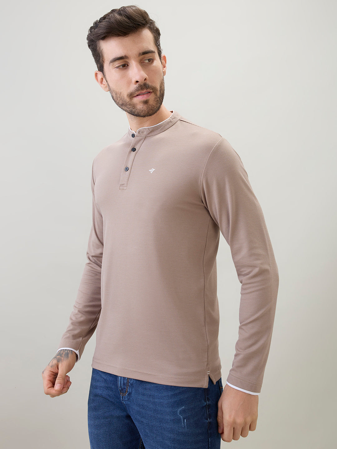 BEIGE Men's Solid Henley Neck Regular Fit Full Sleeve T-Shirt with Logo