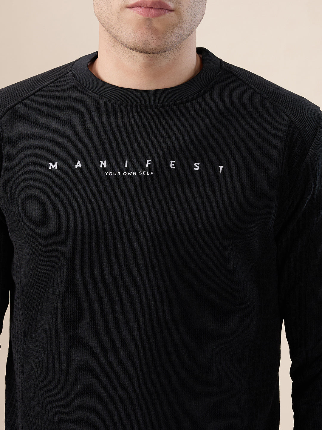 BLACK Men's Textured Chest Typography Print Full Sleeves Round Neck Regular Fit Sweatshirt