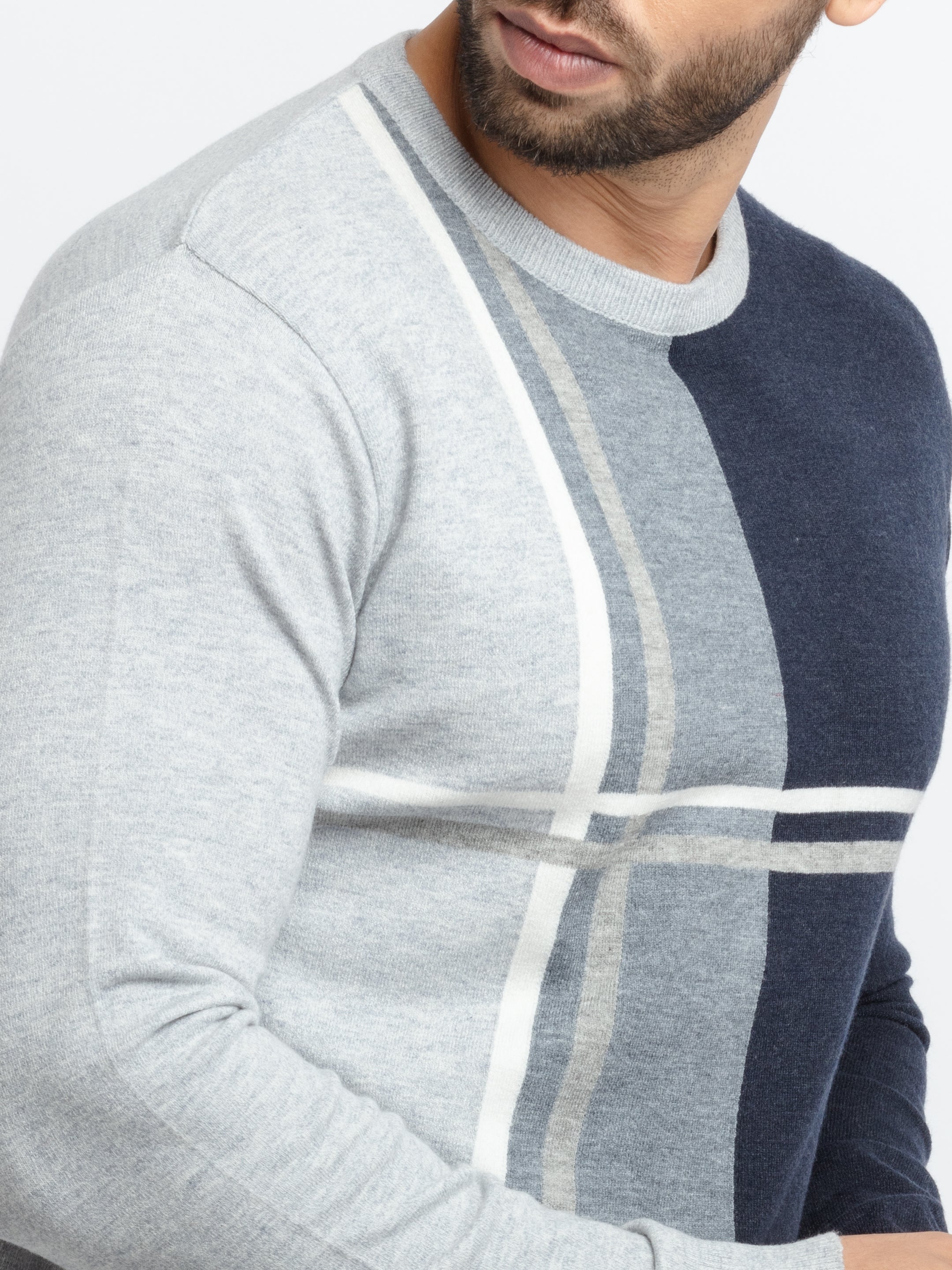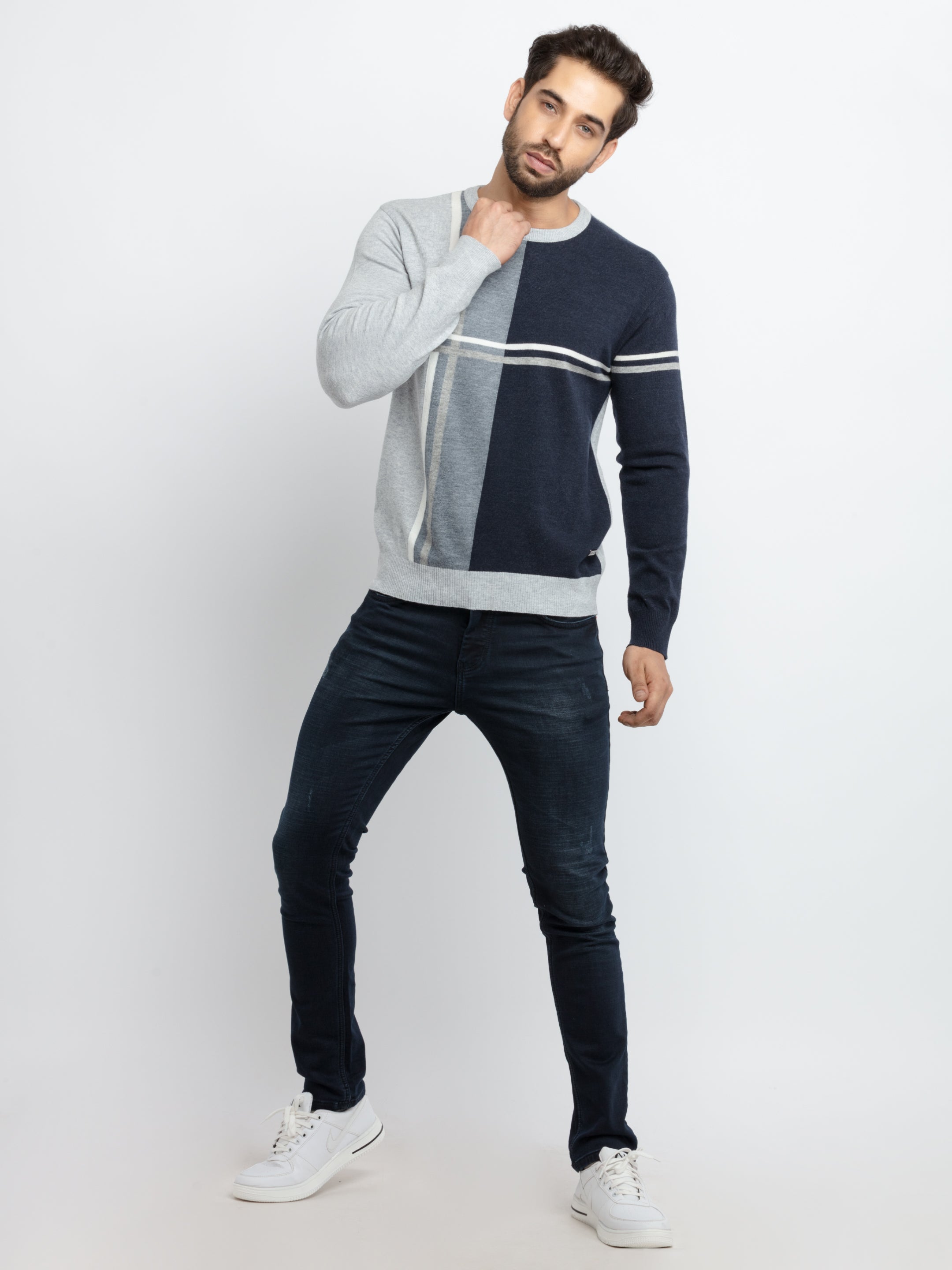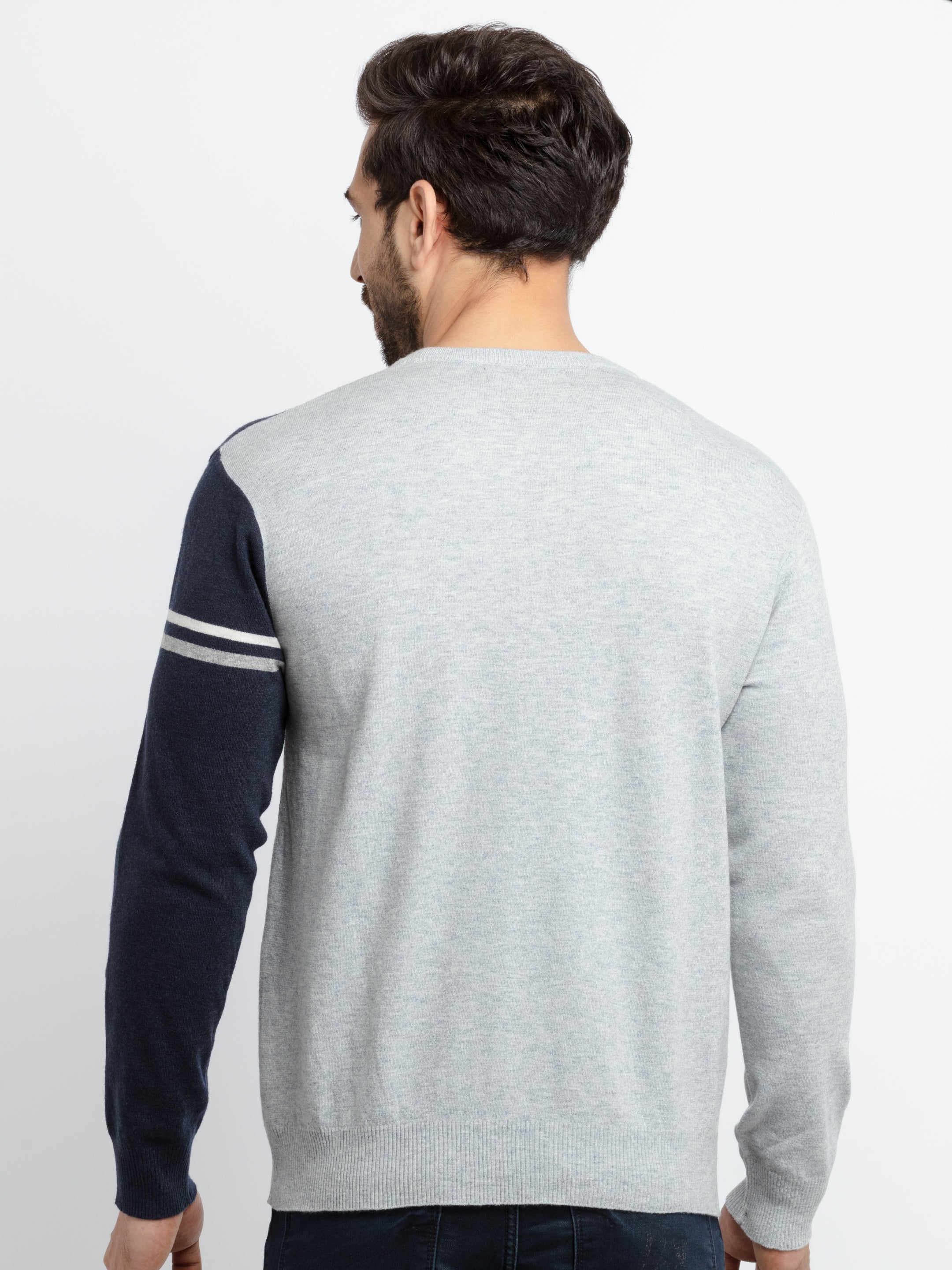 Grey Mel./Indigo Mel. Solid Sweater has Round Neck, Full Sleeves.