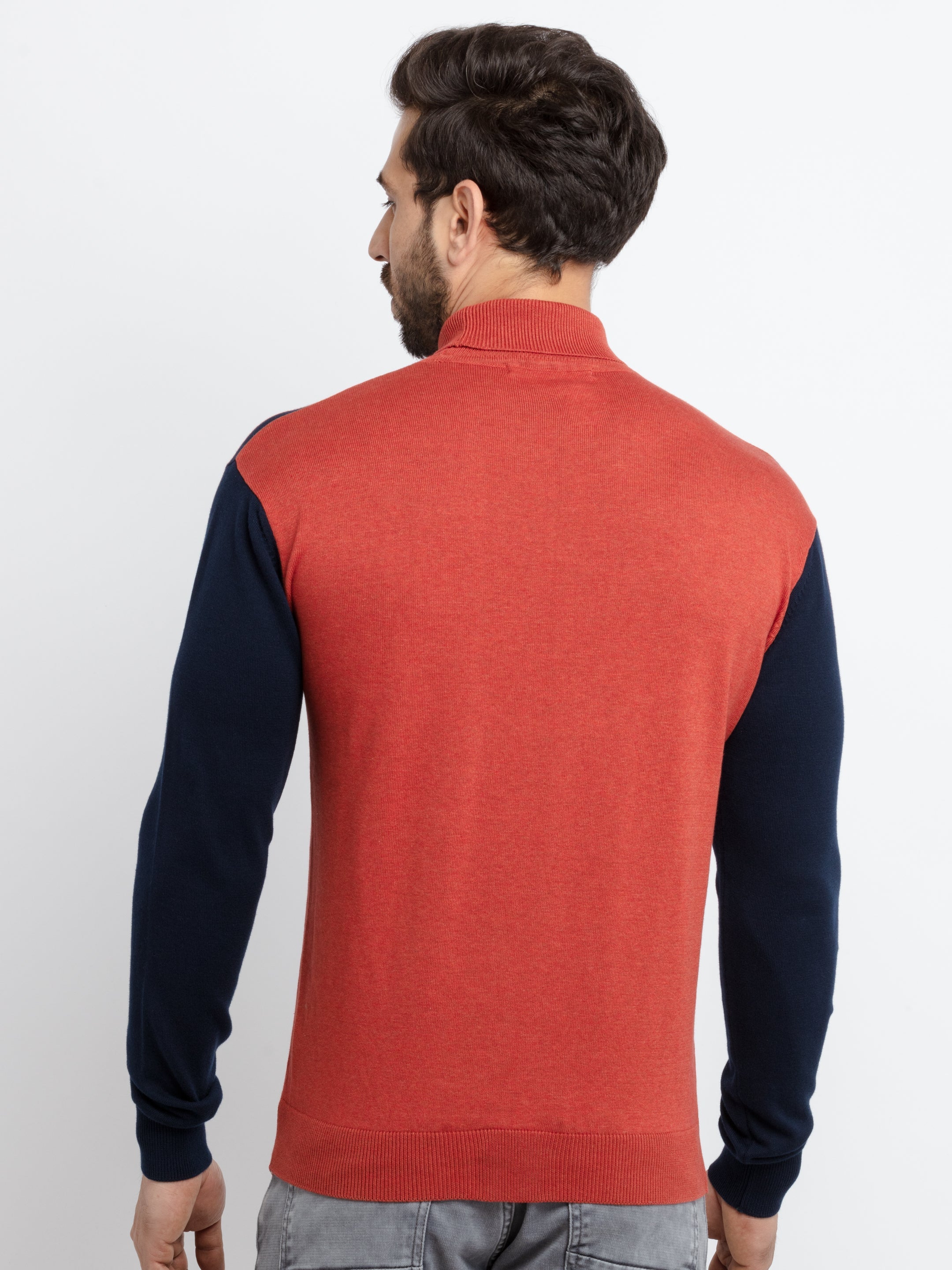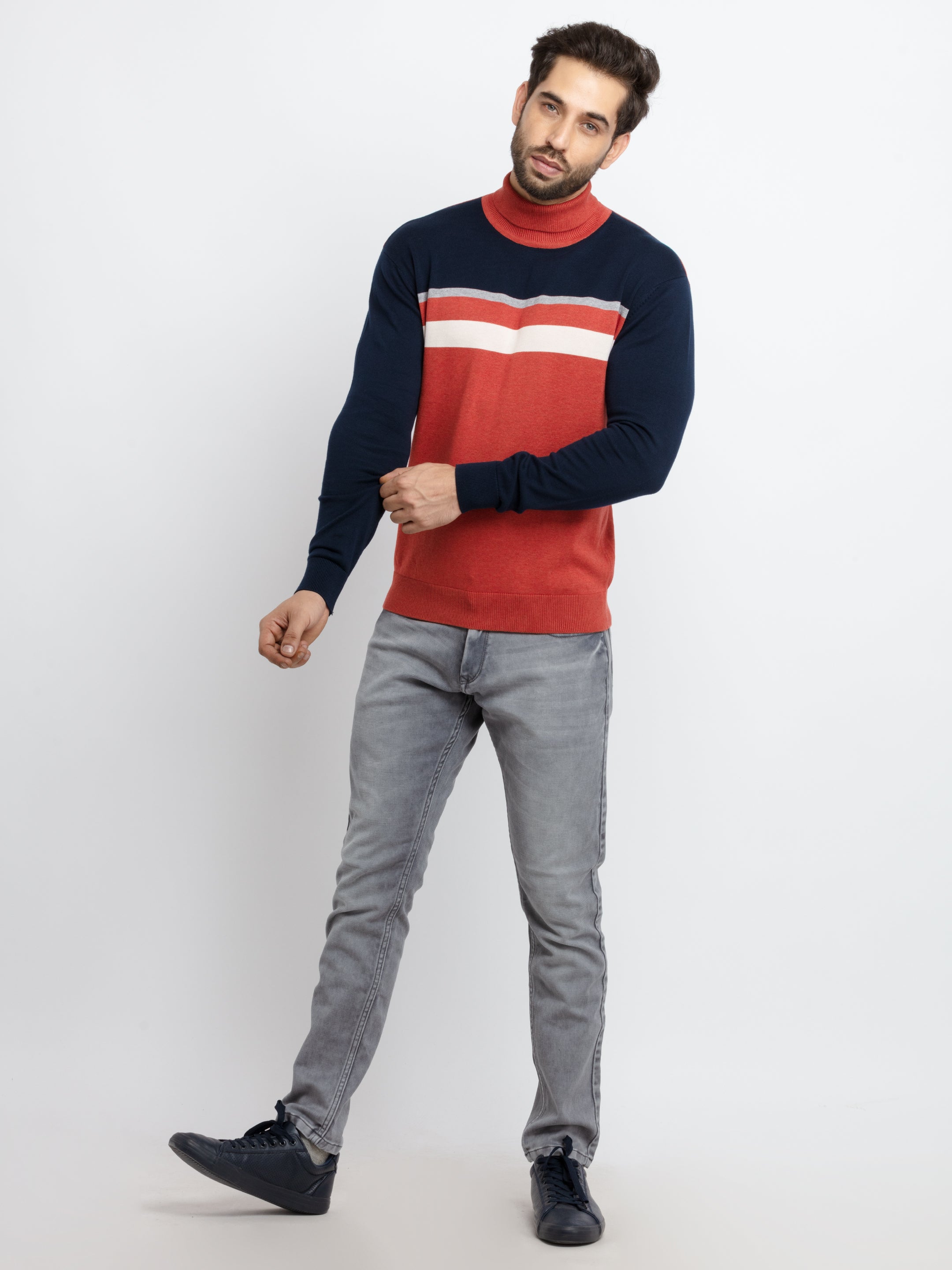 Rust/Navy Solid Sweater has Chest Stripes, Full Sleeves.