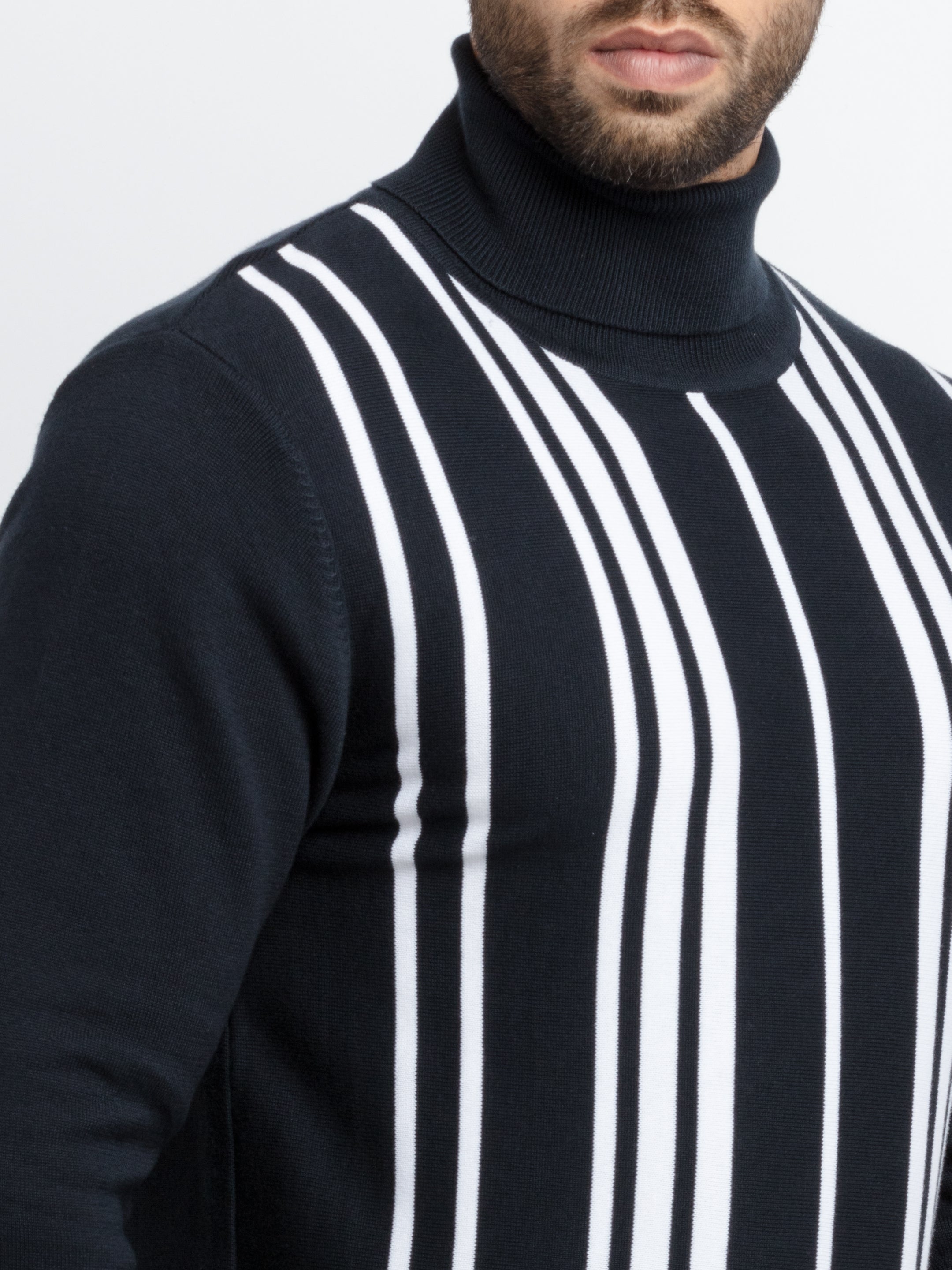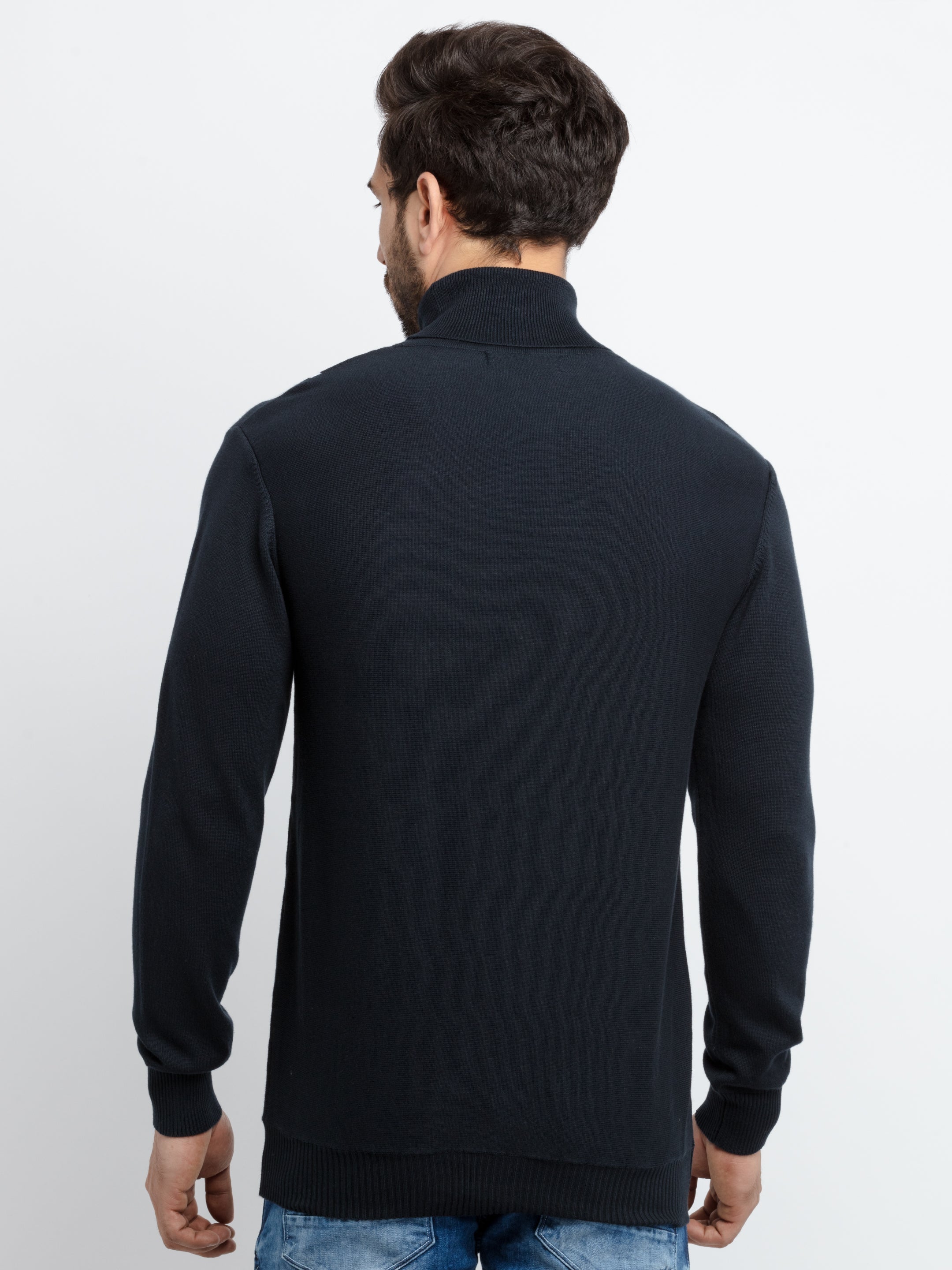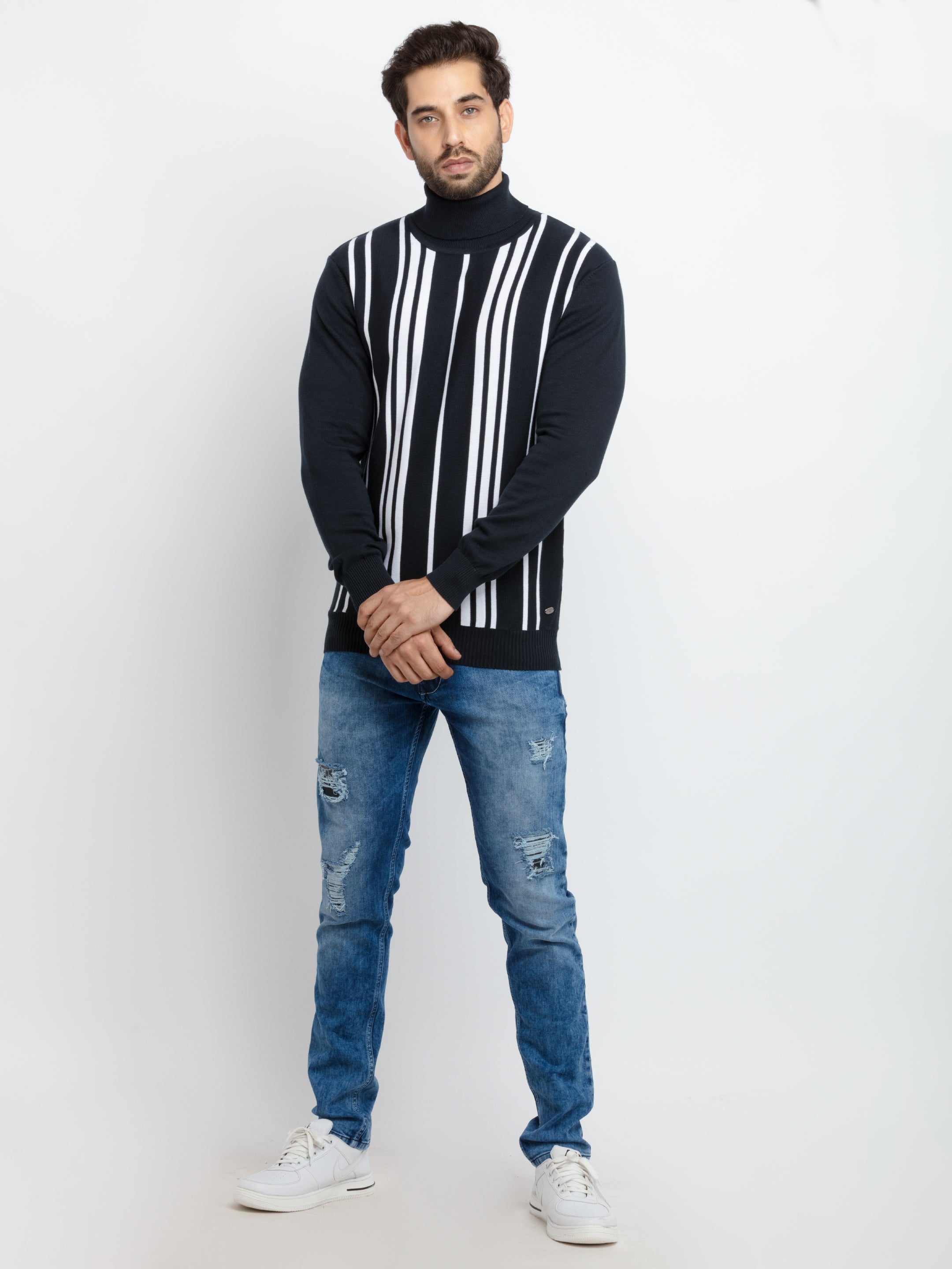 Navy/White Solid Sweater has Vertical Stripe, Full Sleeves.