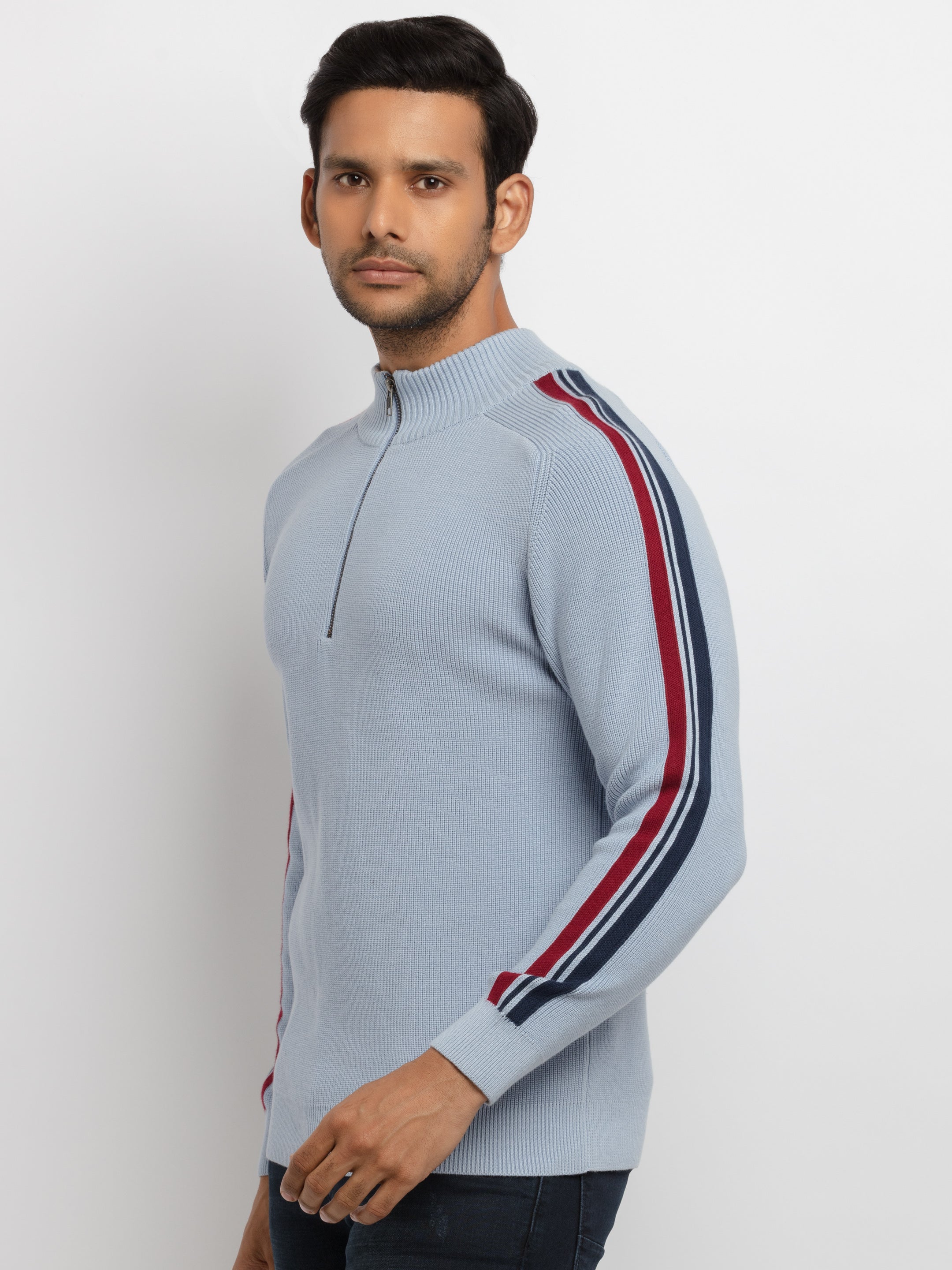 Blue Mel. Solid Sweater has Hood Neck, Full Sleeves.