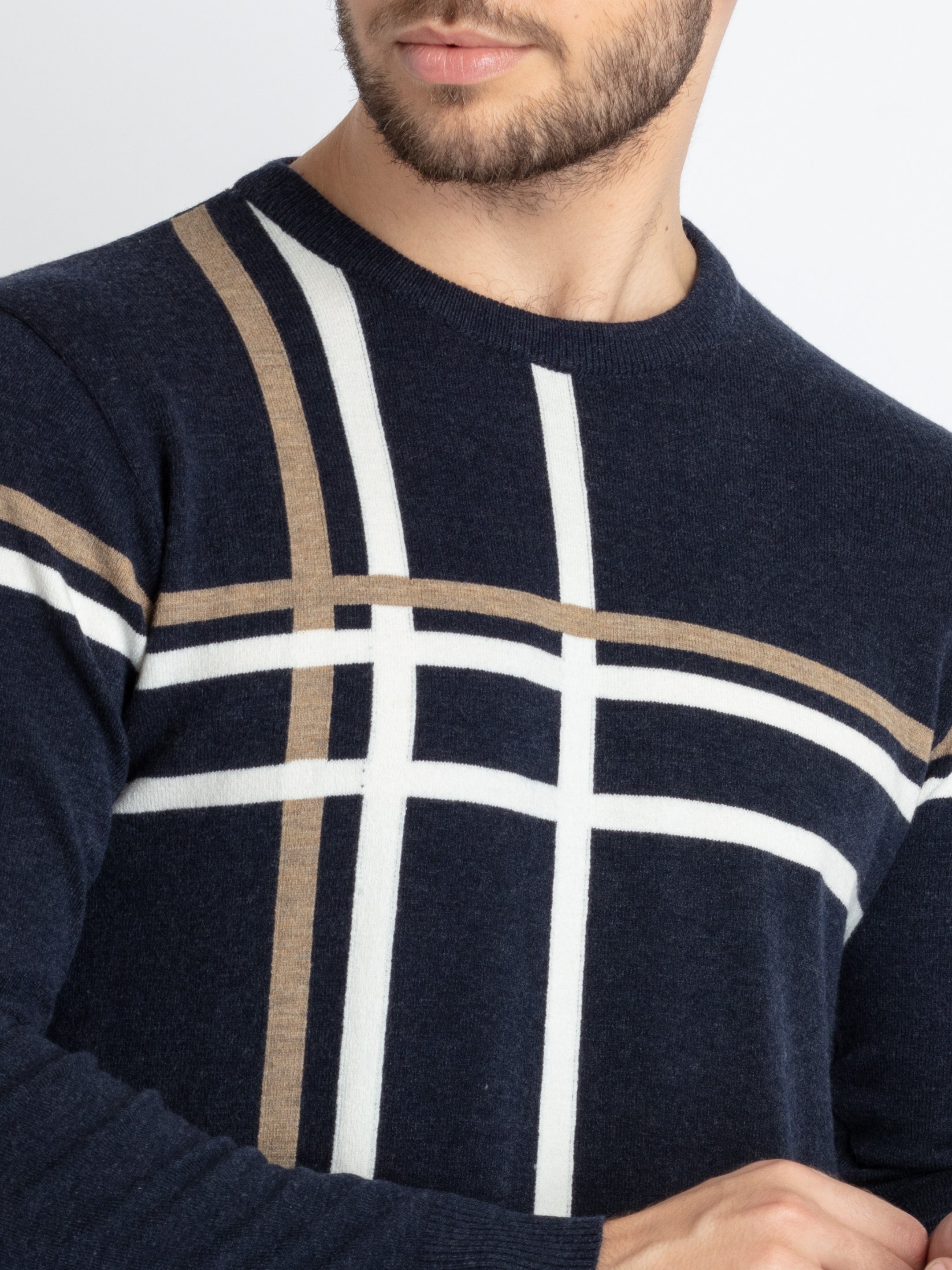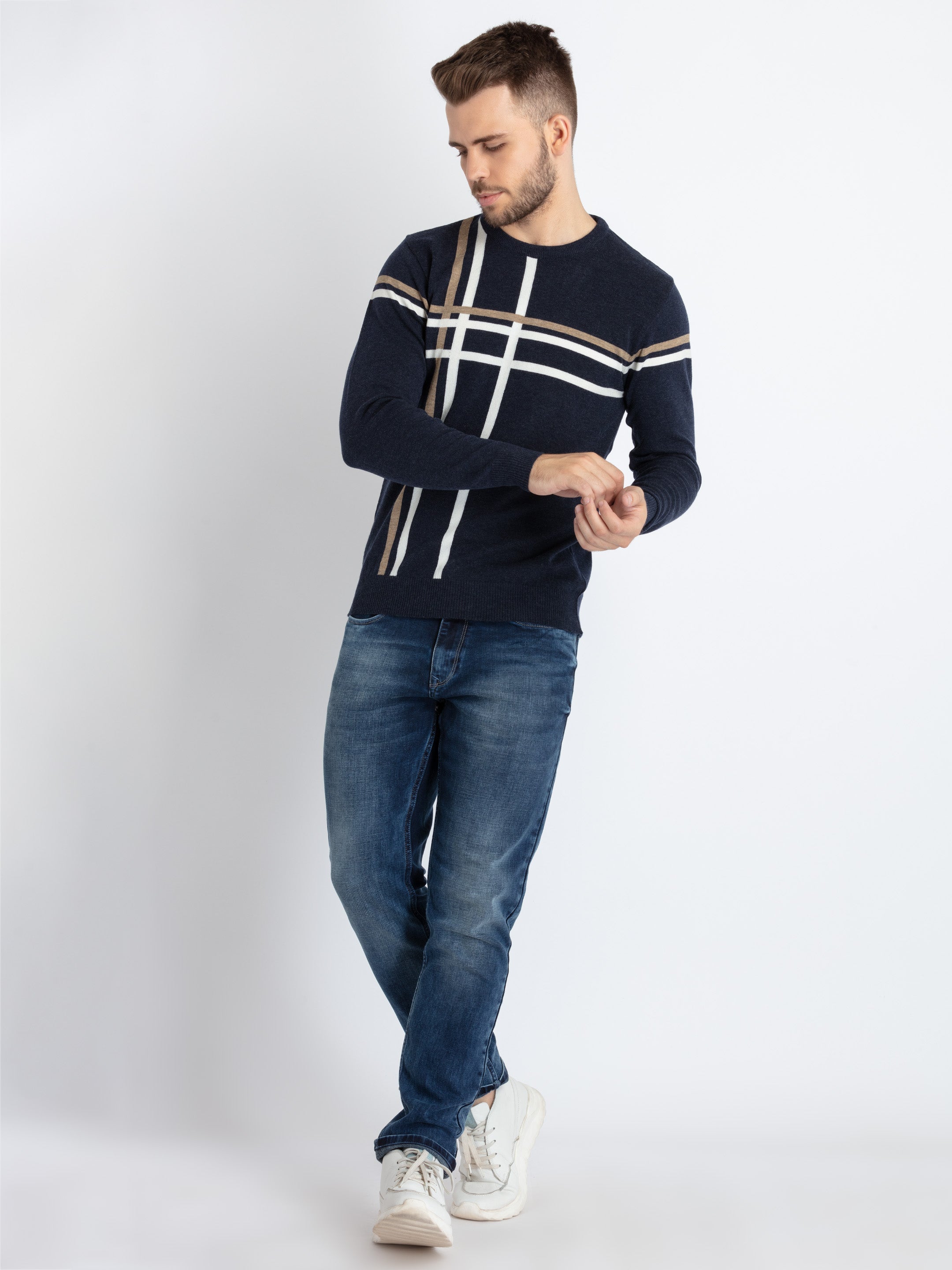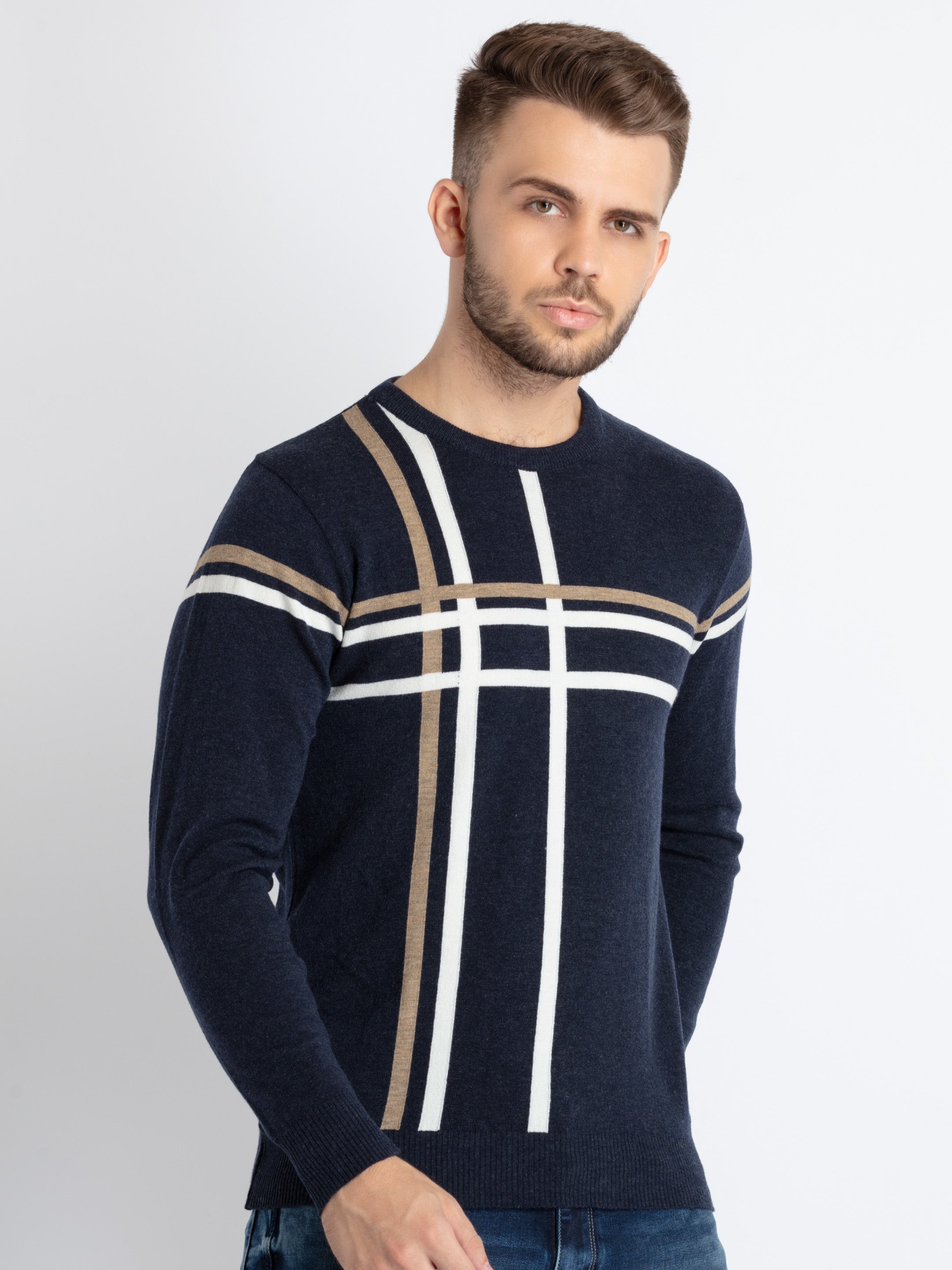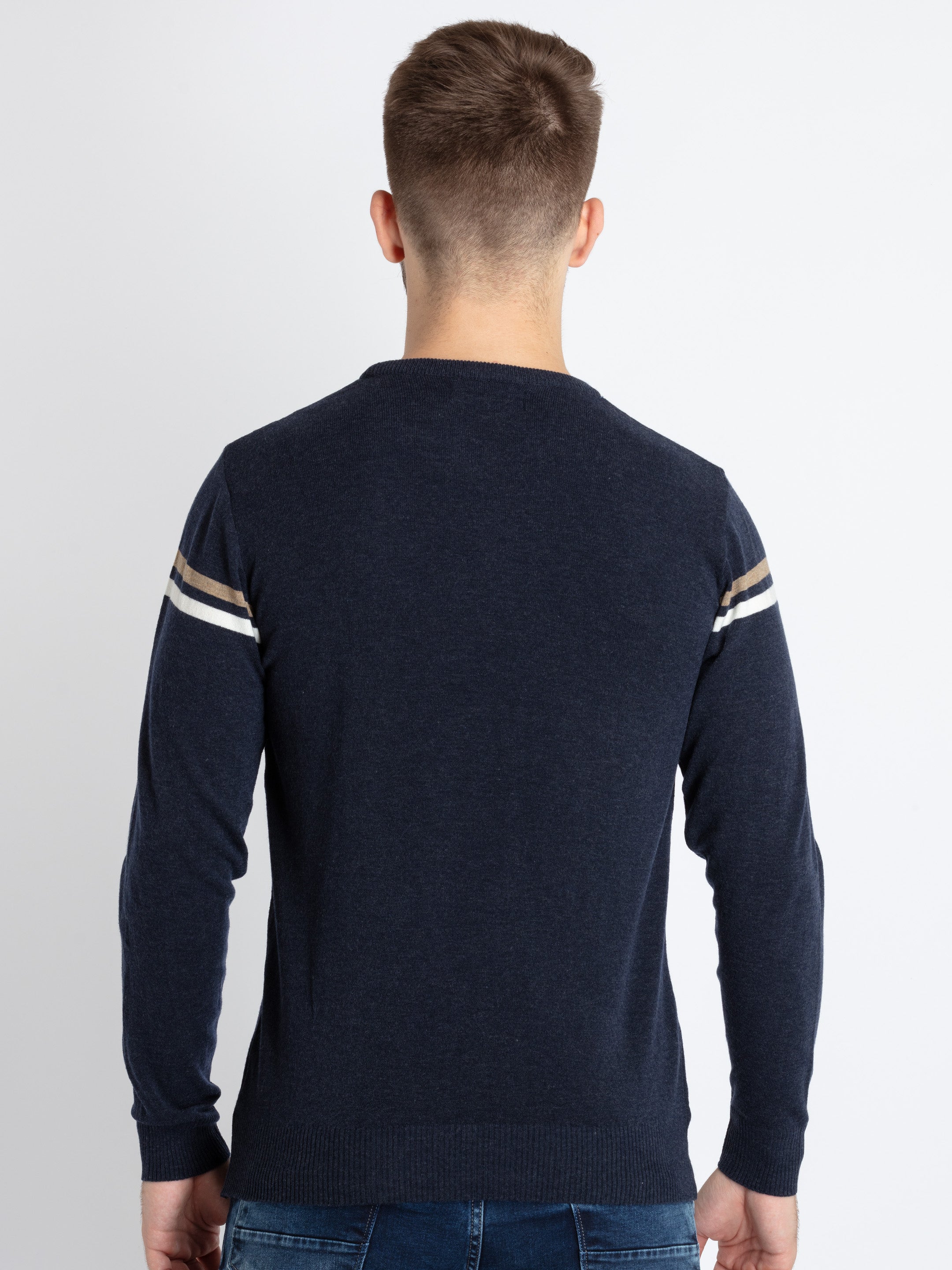 NAVY MEL./WHITE Colourblocked Sweater has Round Neck, Full Sleeves.