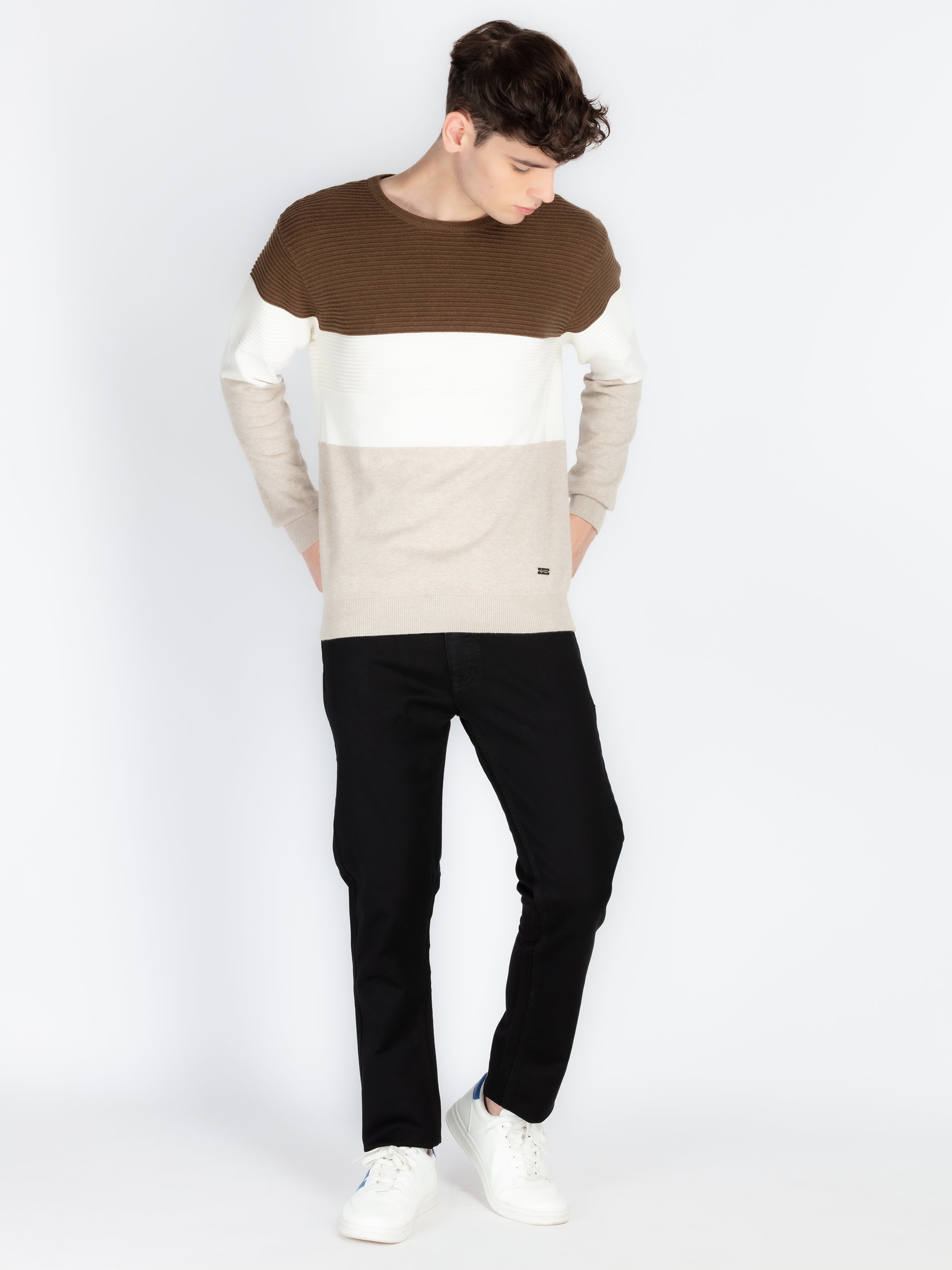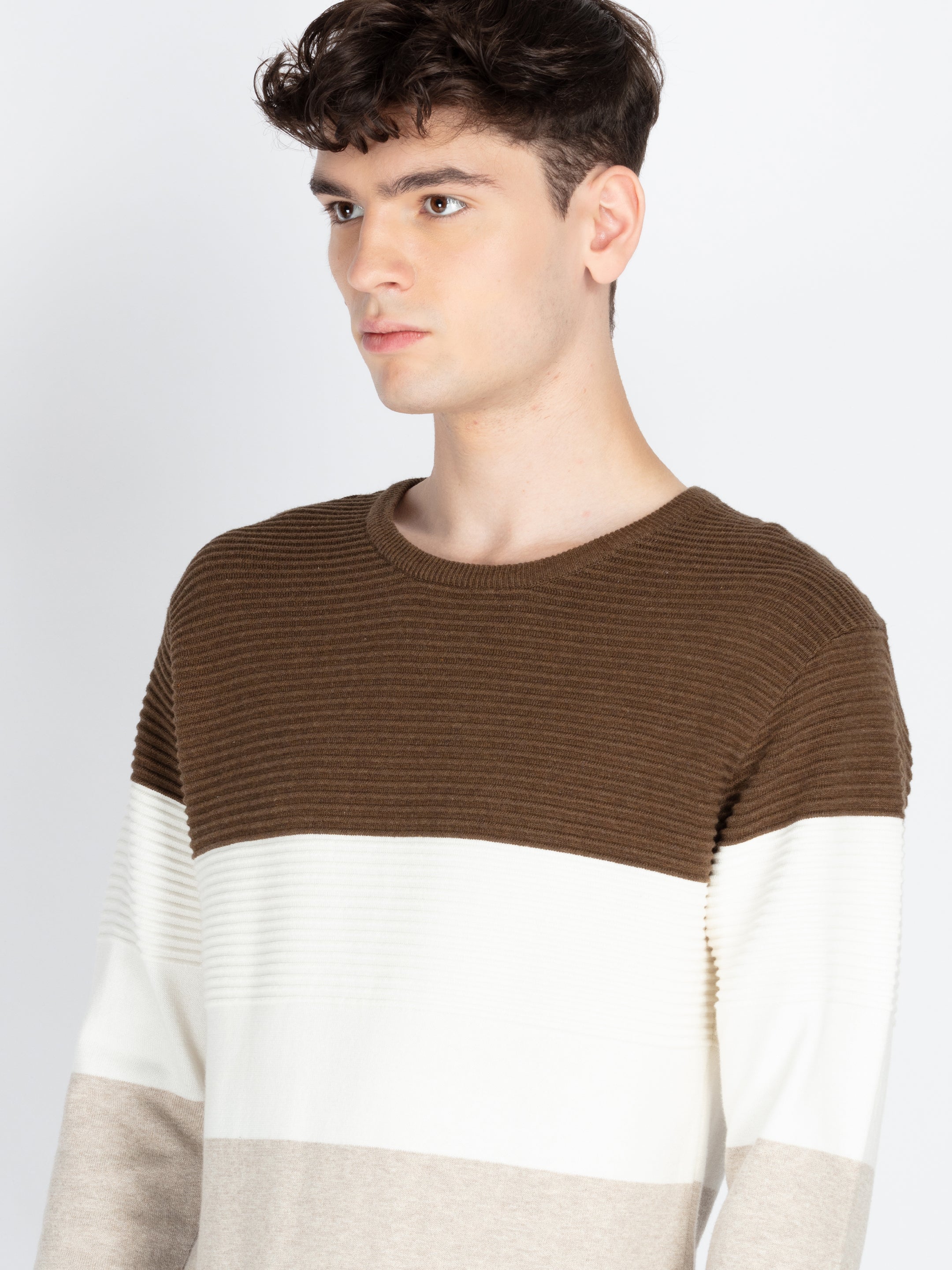 BROWN/WHITE Lightweight Sweater Has Round Neck With Full Sleeves.