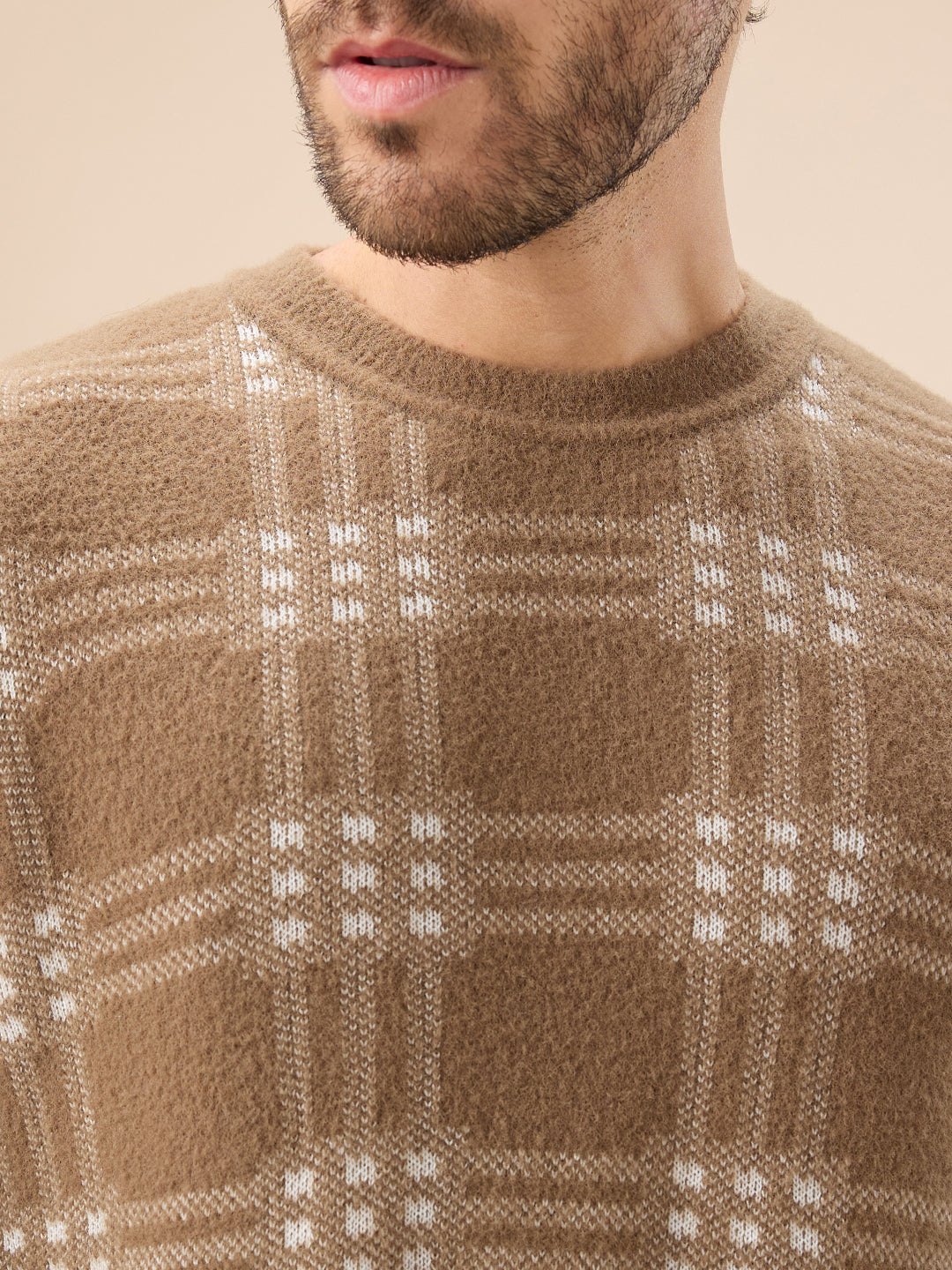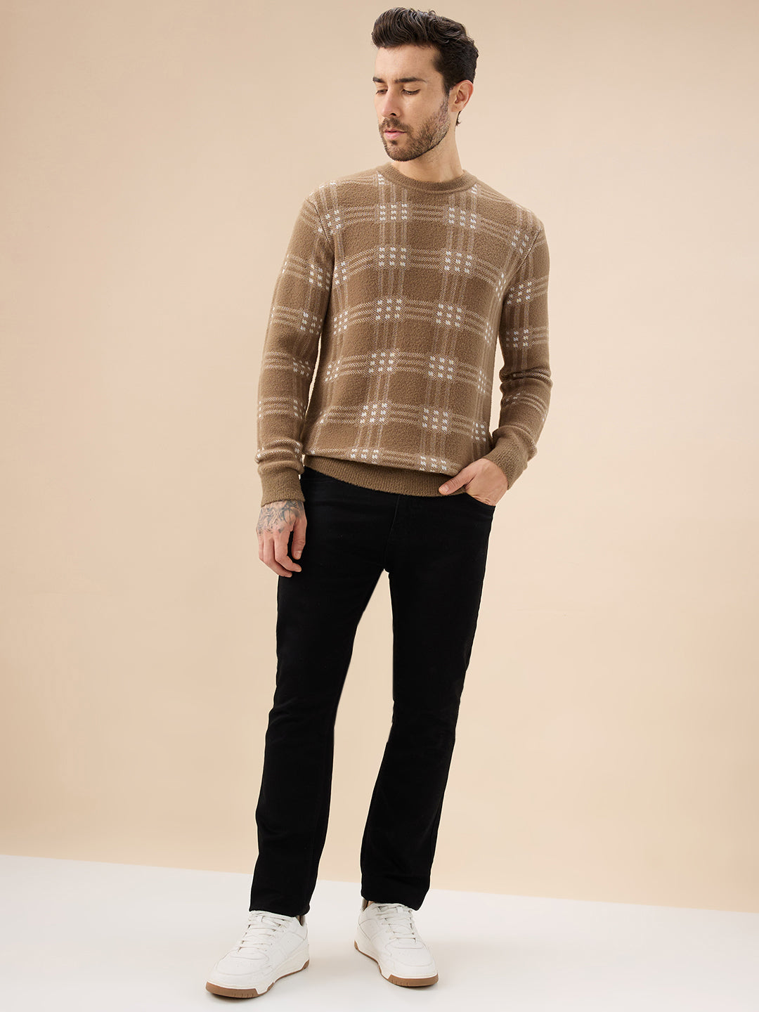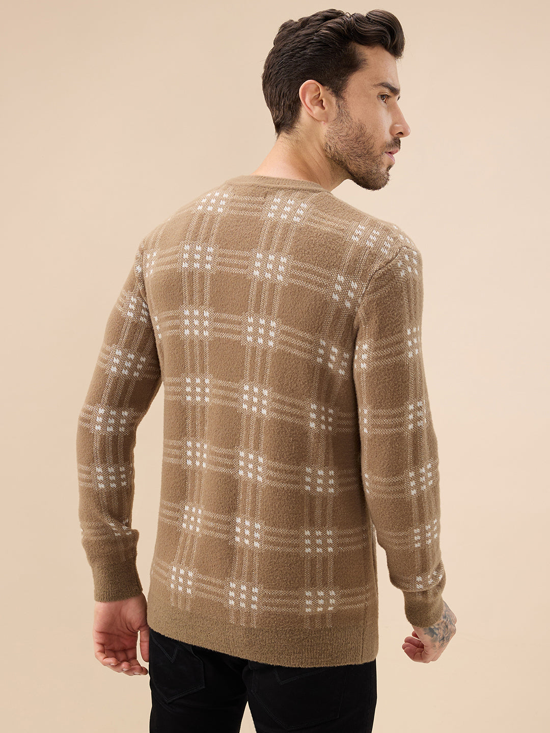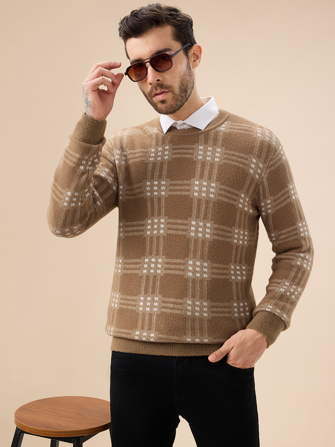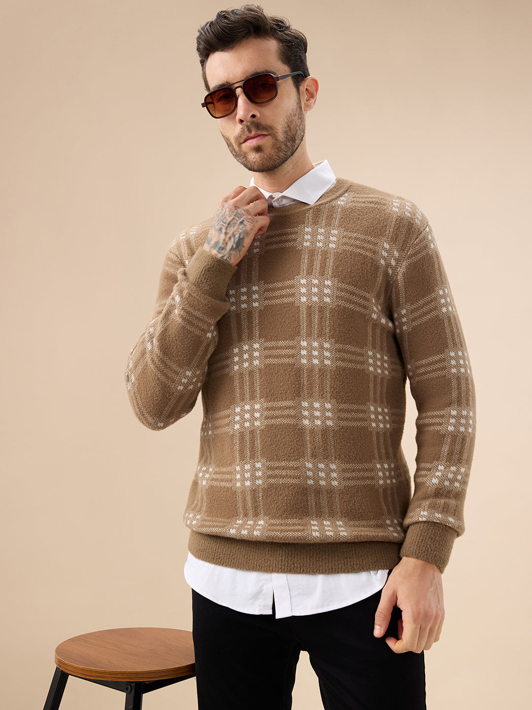 KHAKHI Men's Trendy Check Design Full Sleeves Round Neck Fleece Sweater