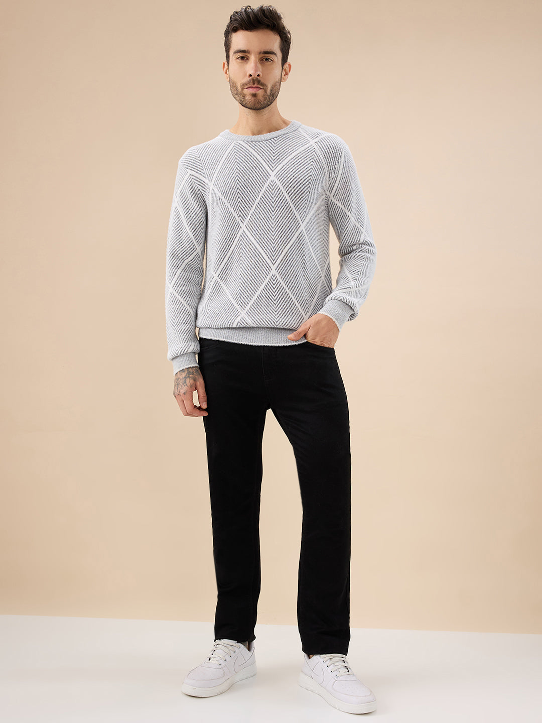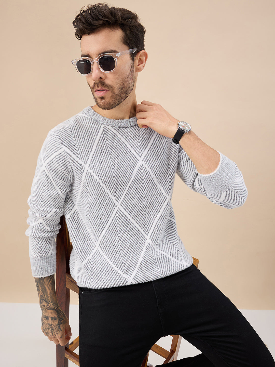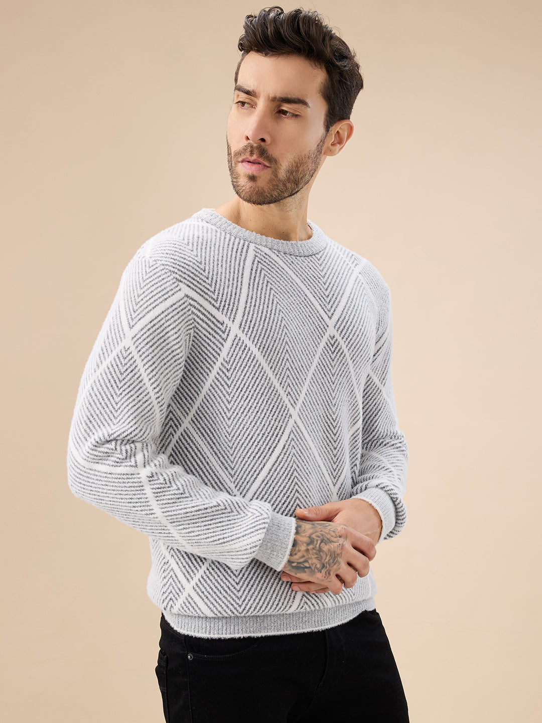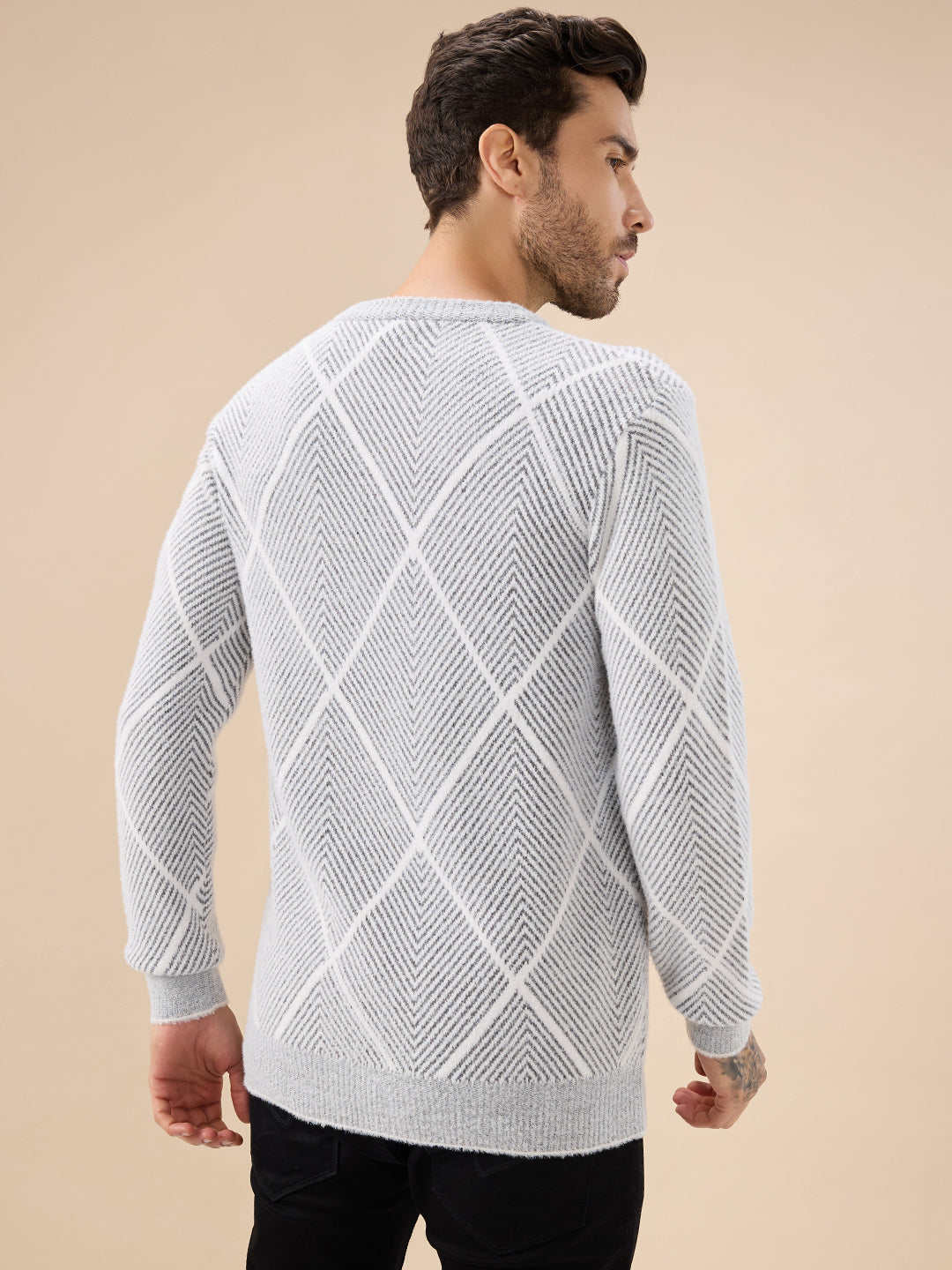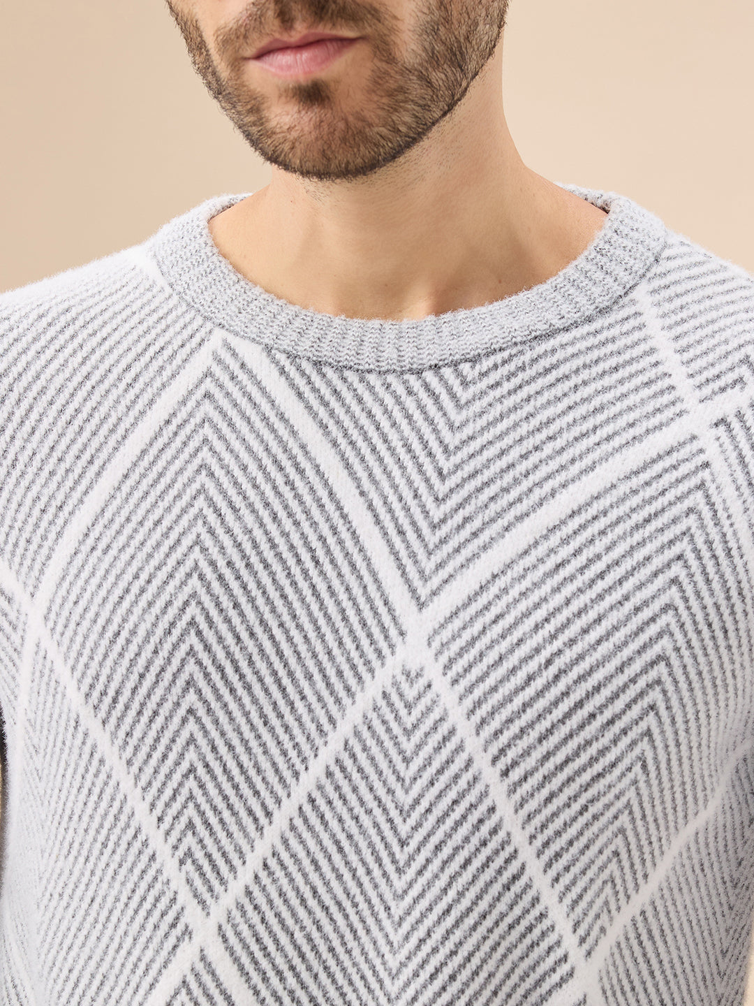 GREY Men's All Over Geometric Textured Full Sleeves Round Neck Sweater