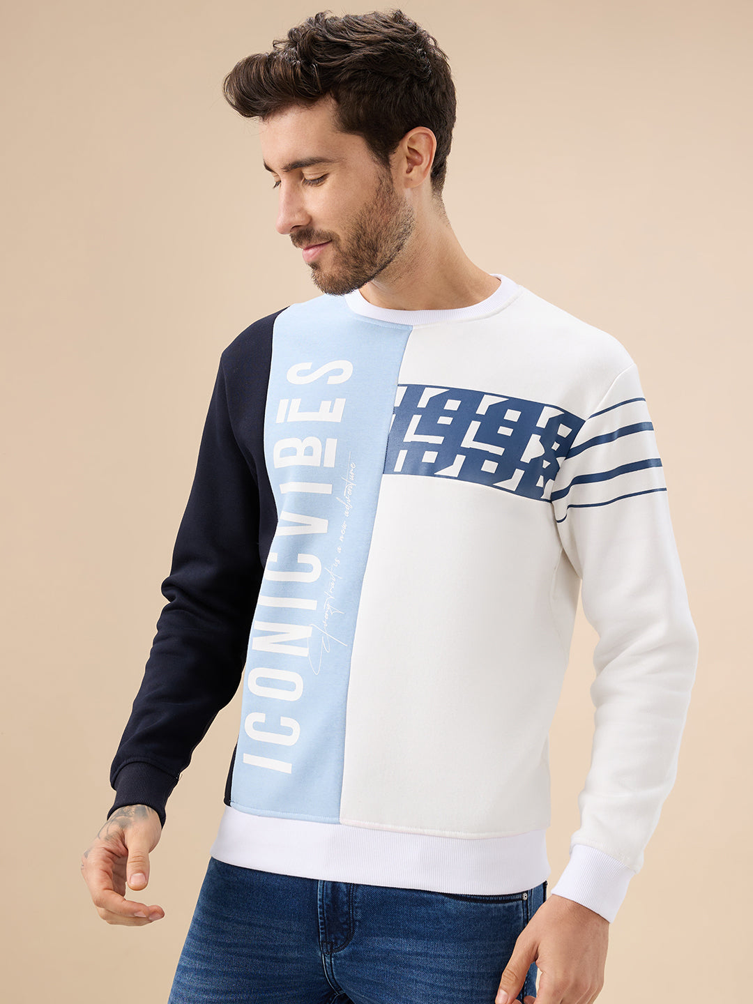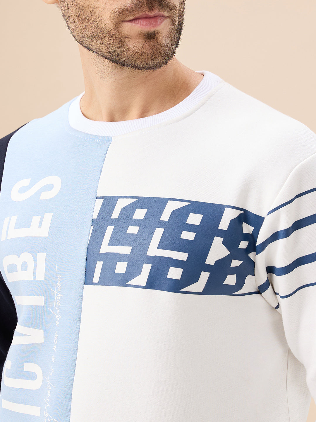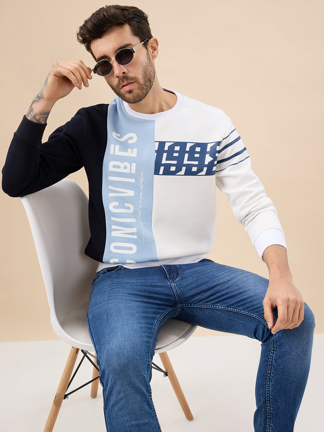 NAVY/SKY Men's Colorblock Typography Print Full Sleeve Round Neck Fleece Sweatshirt