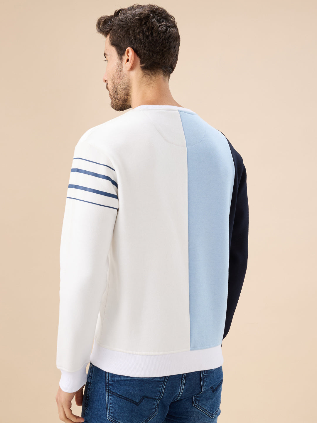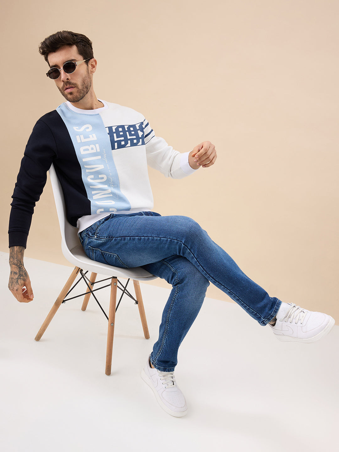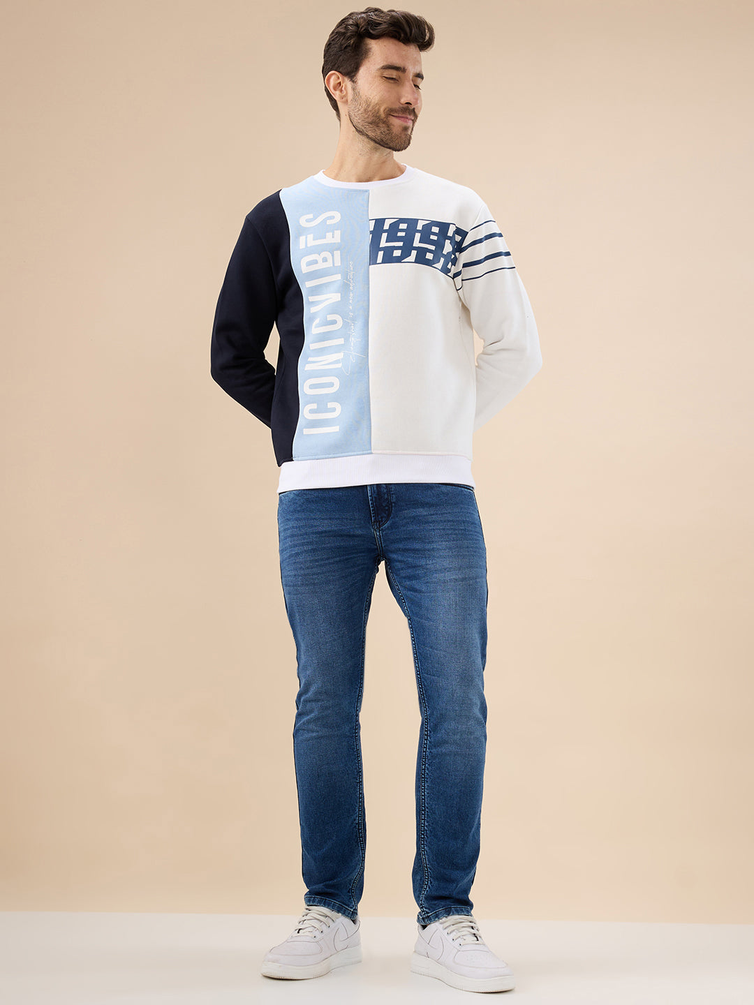 NAVY/SKY Men's Colorblock Typography Print Full Sleeve Round Neck Fleece Sweatshirt