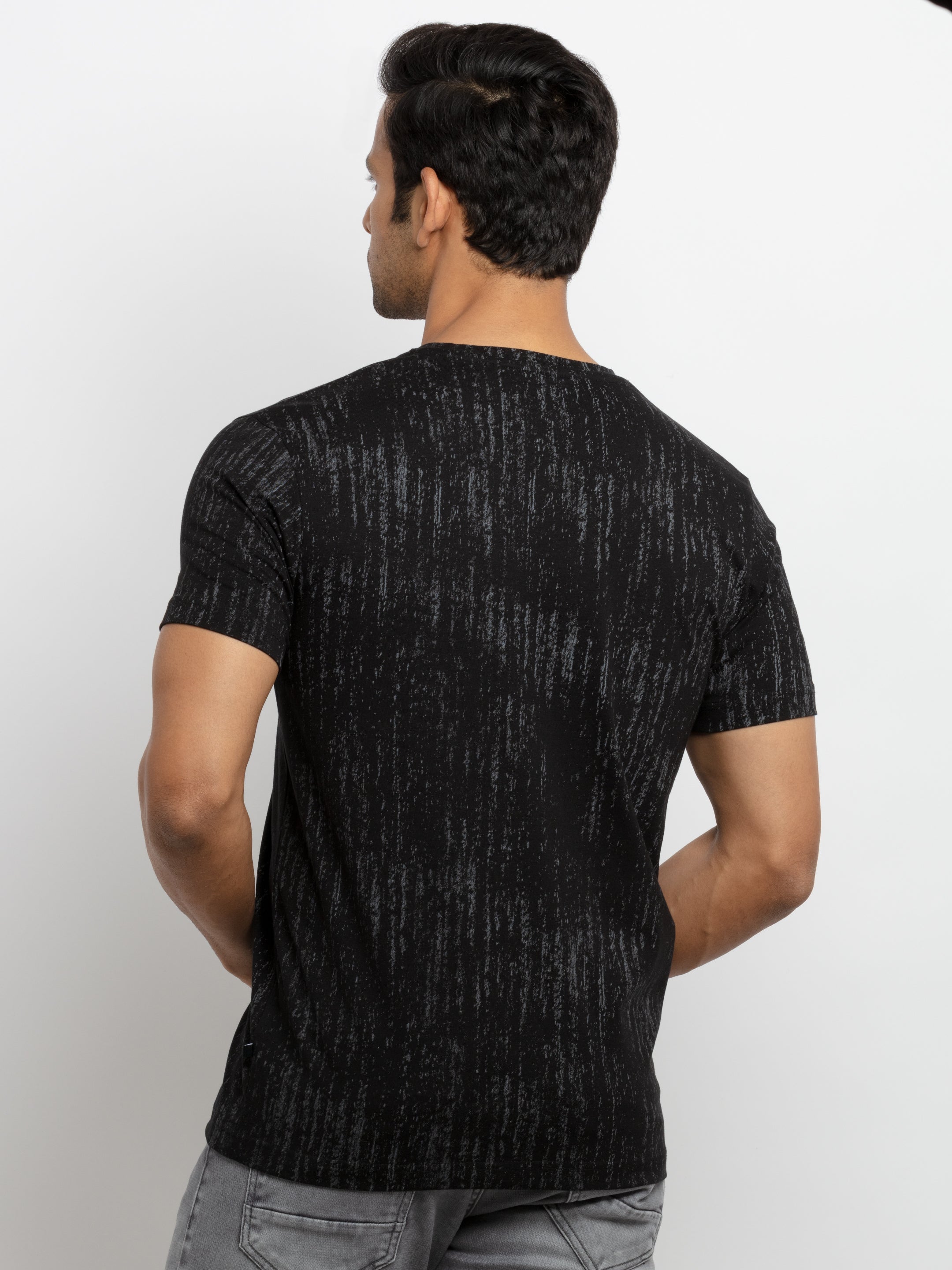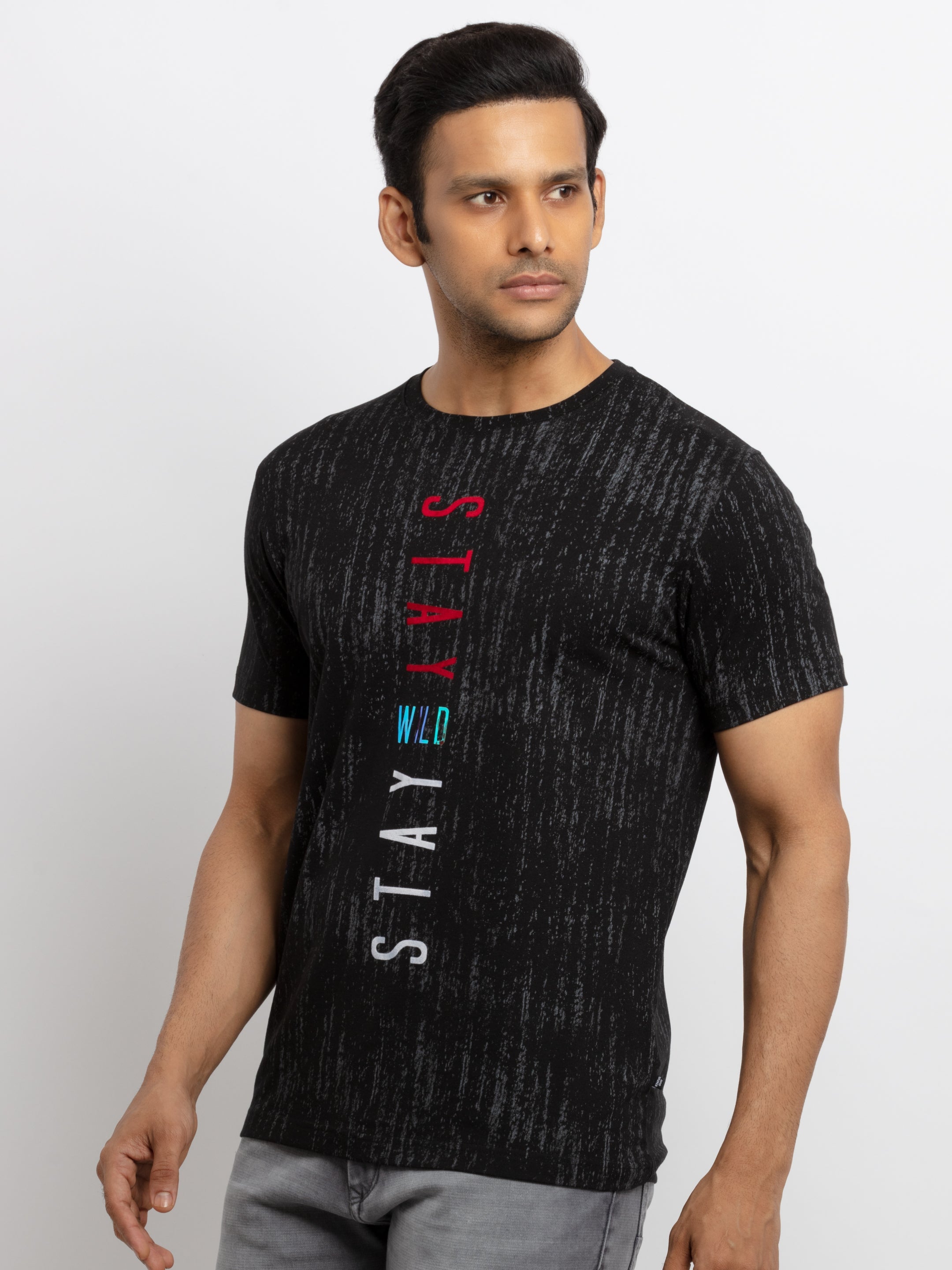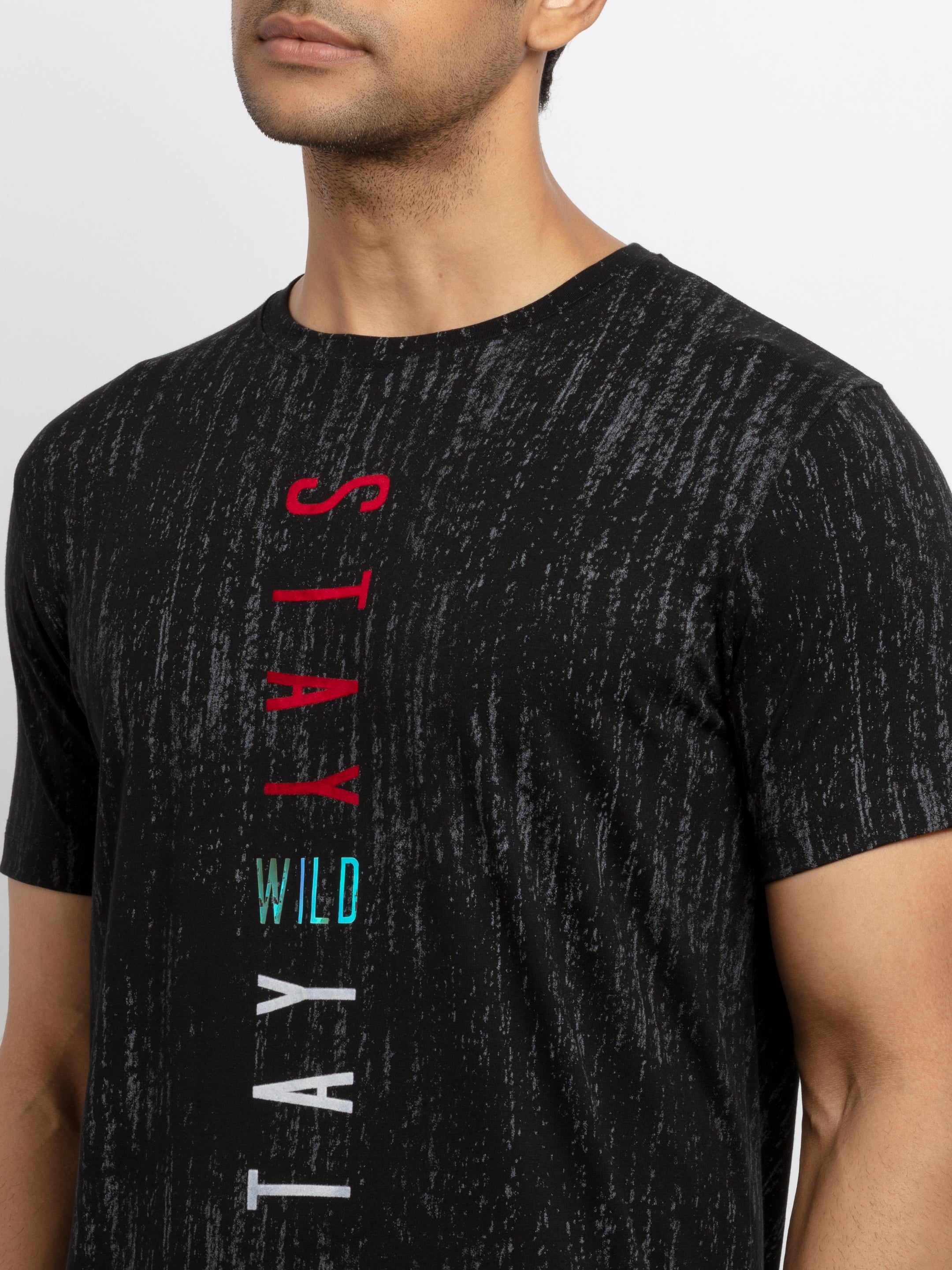 Black Round Neck T-Shirt has All Over Print, Half Sleeves,Regular Fit
