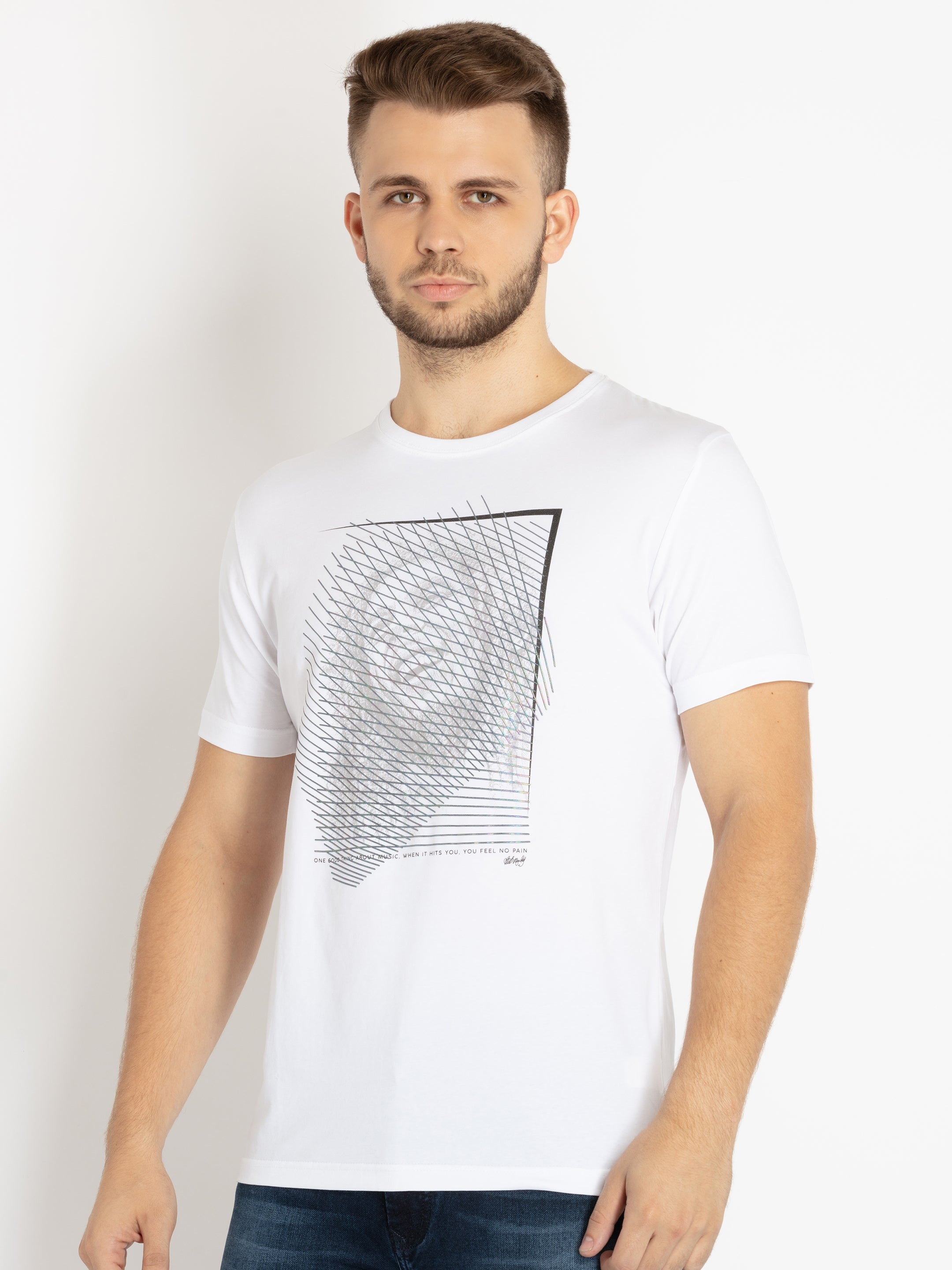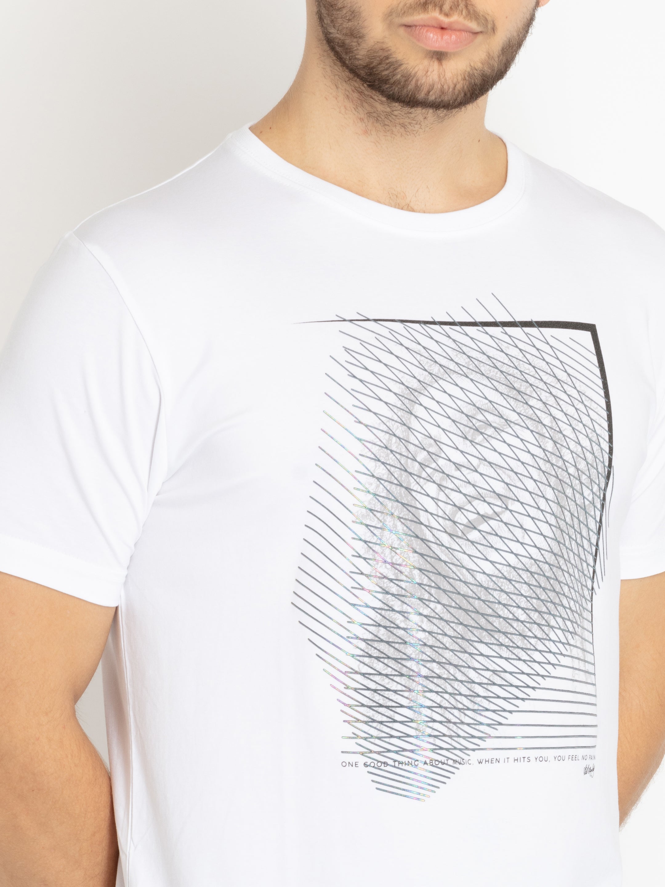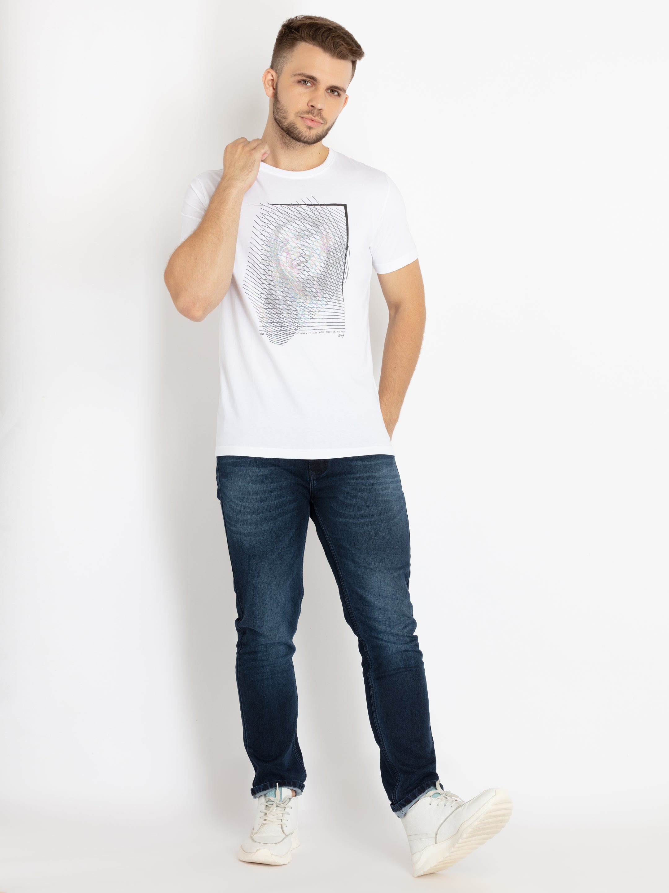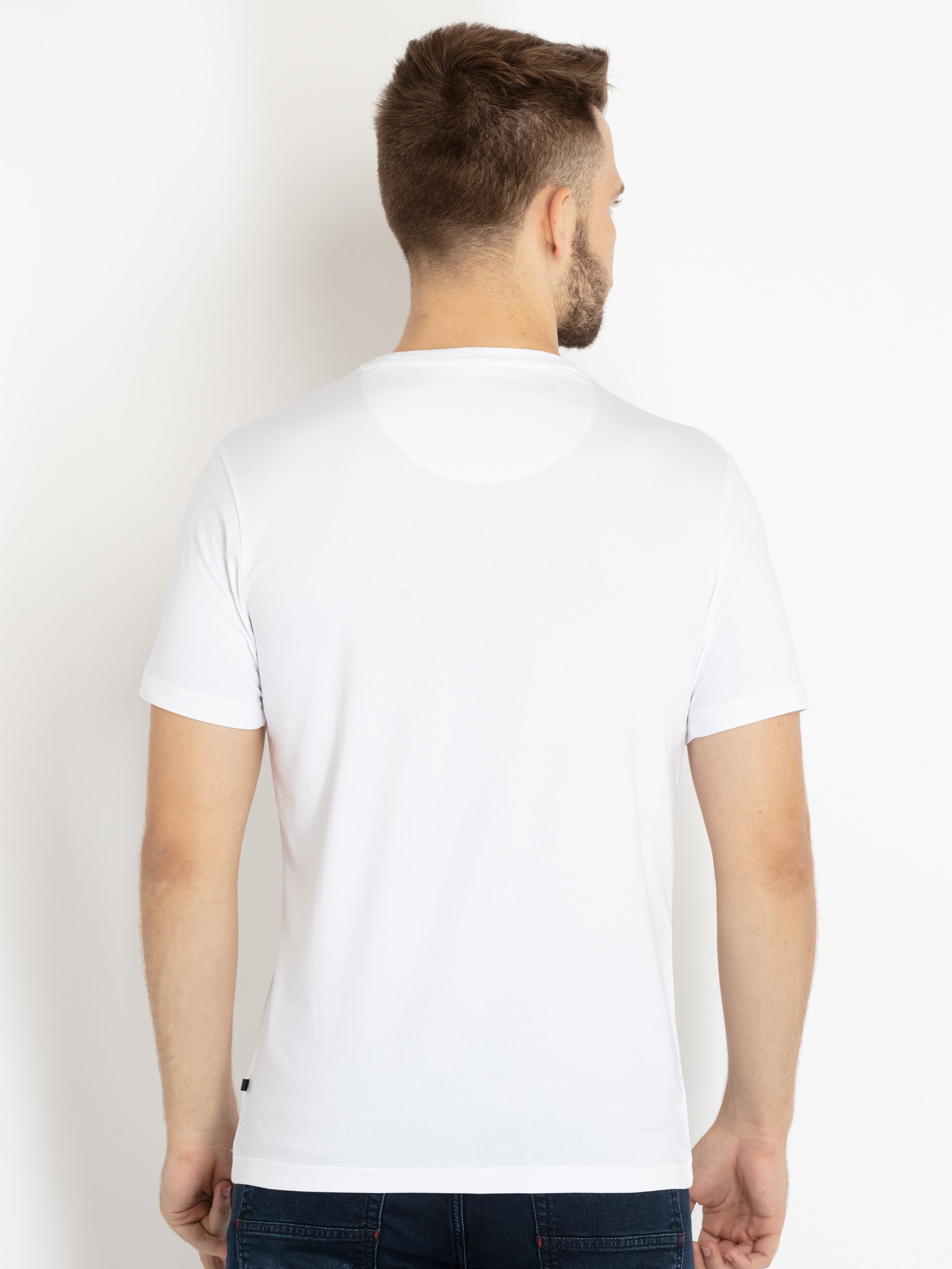 WHITE Round Neck T-Shirt has Front Print, Half Sleeves, Regular Fit