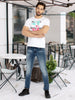 WHITE Round Neck T-Shirt has Chest Print, Half Sleeves,Regular Fit