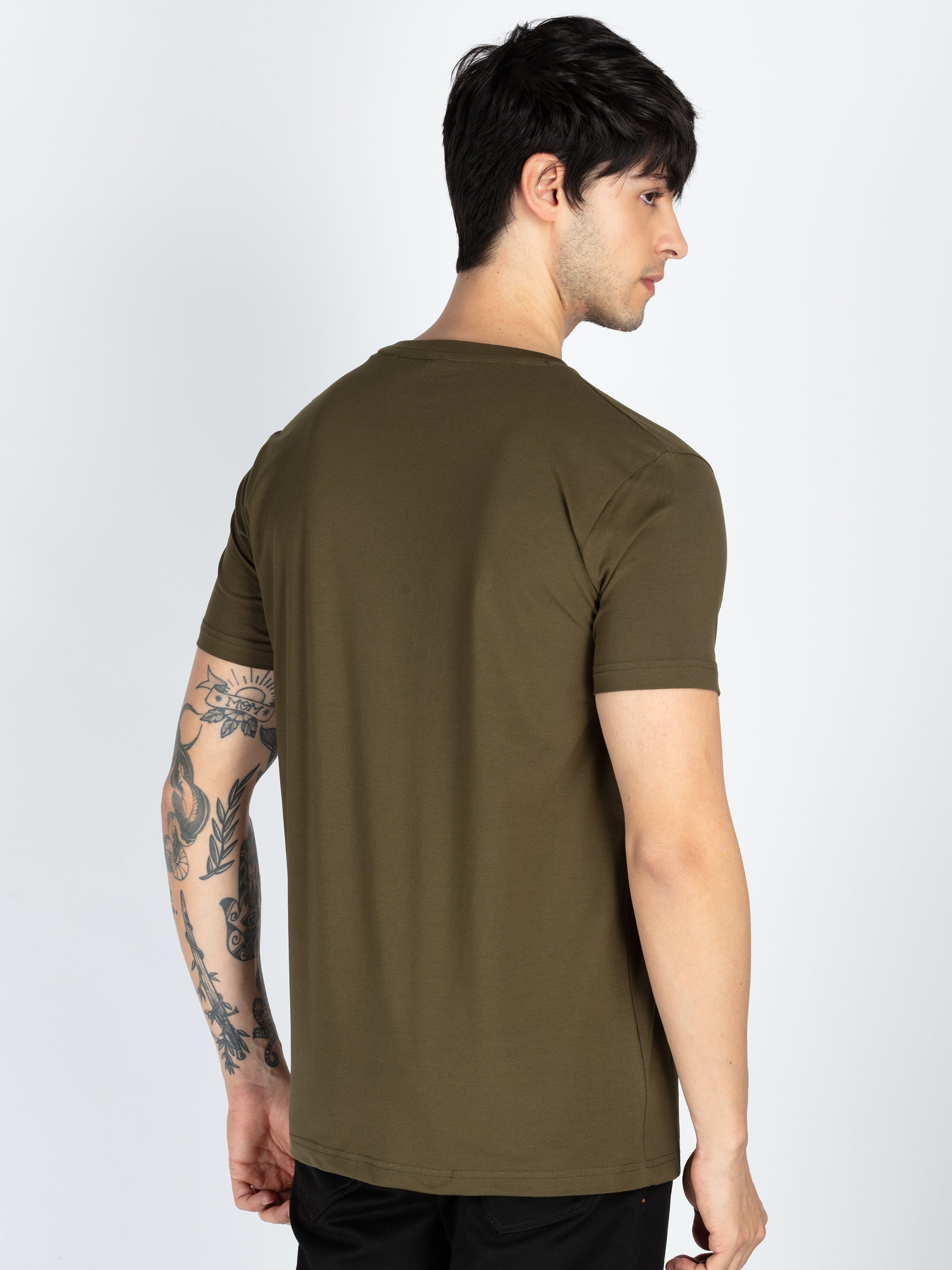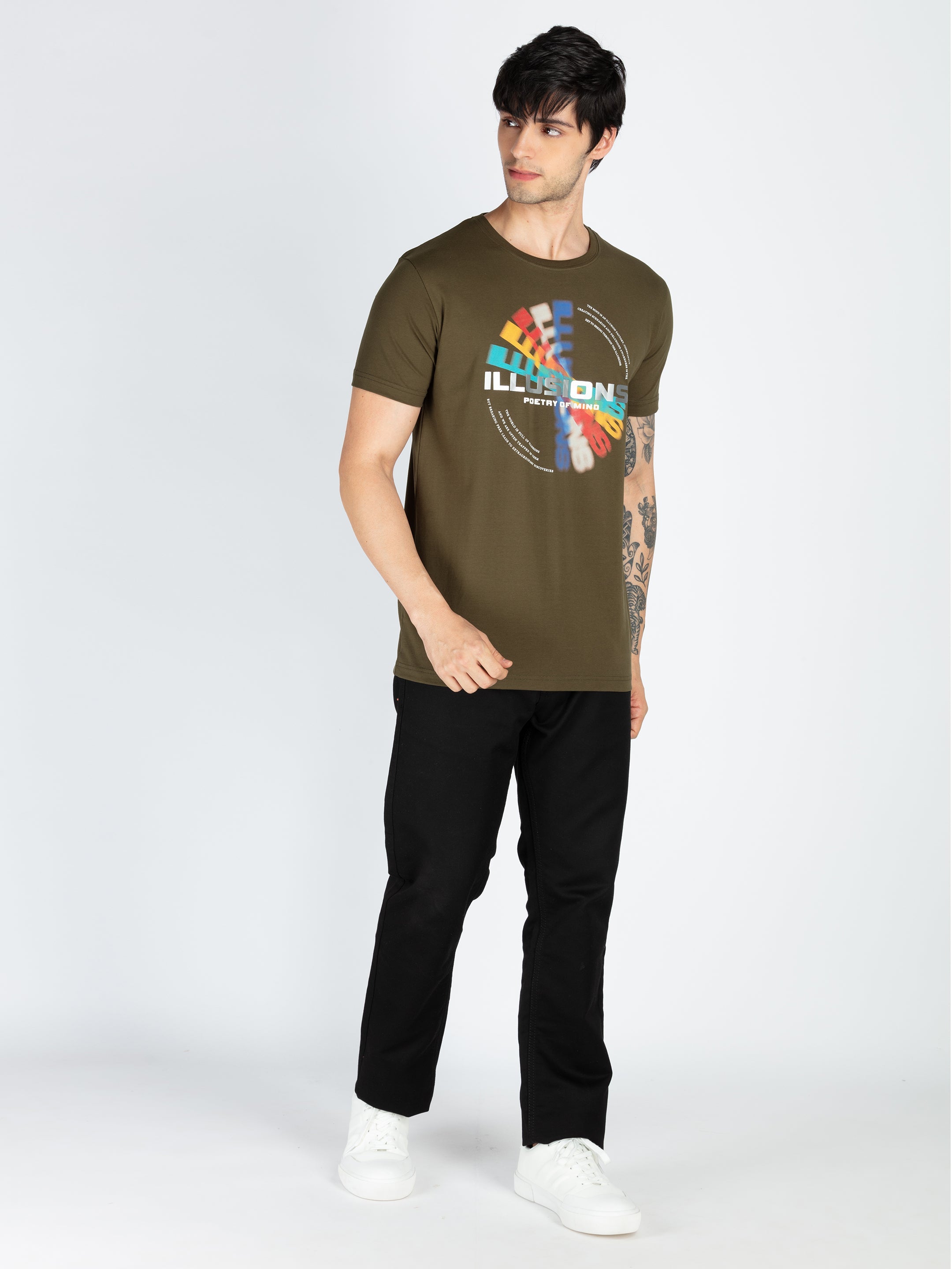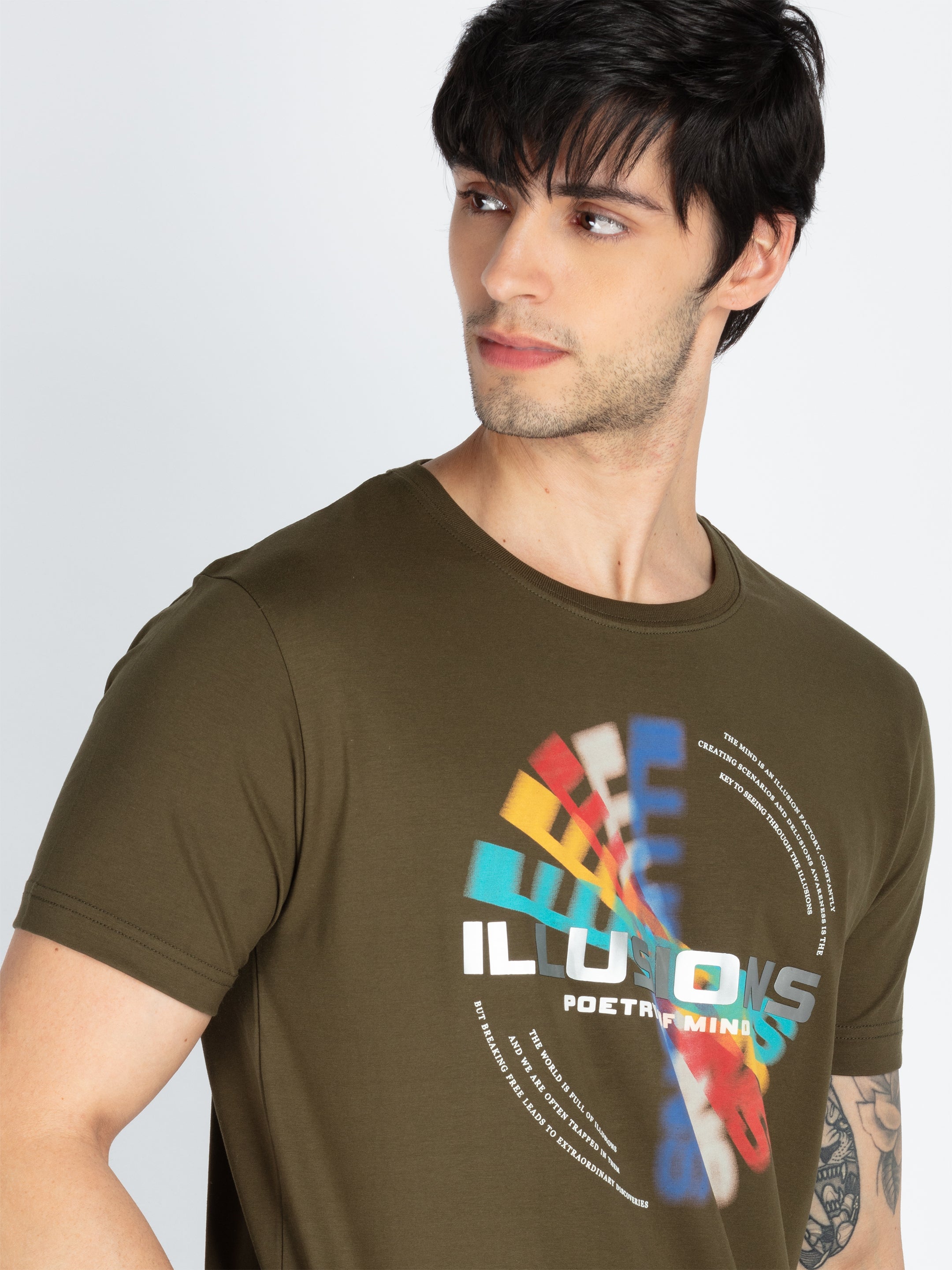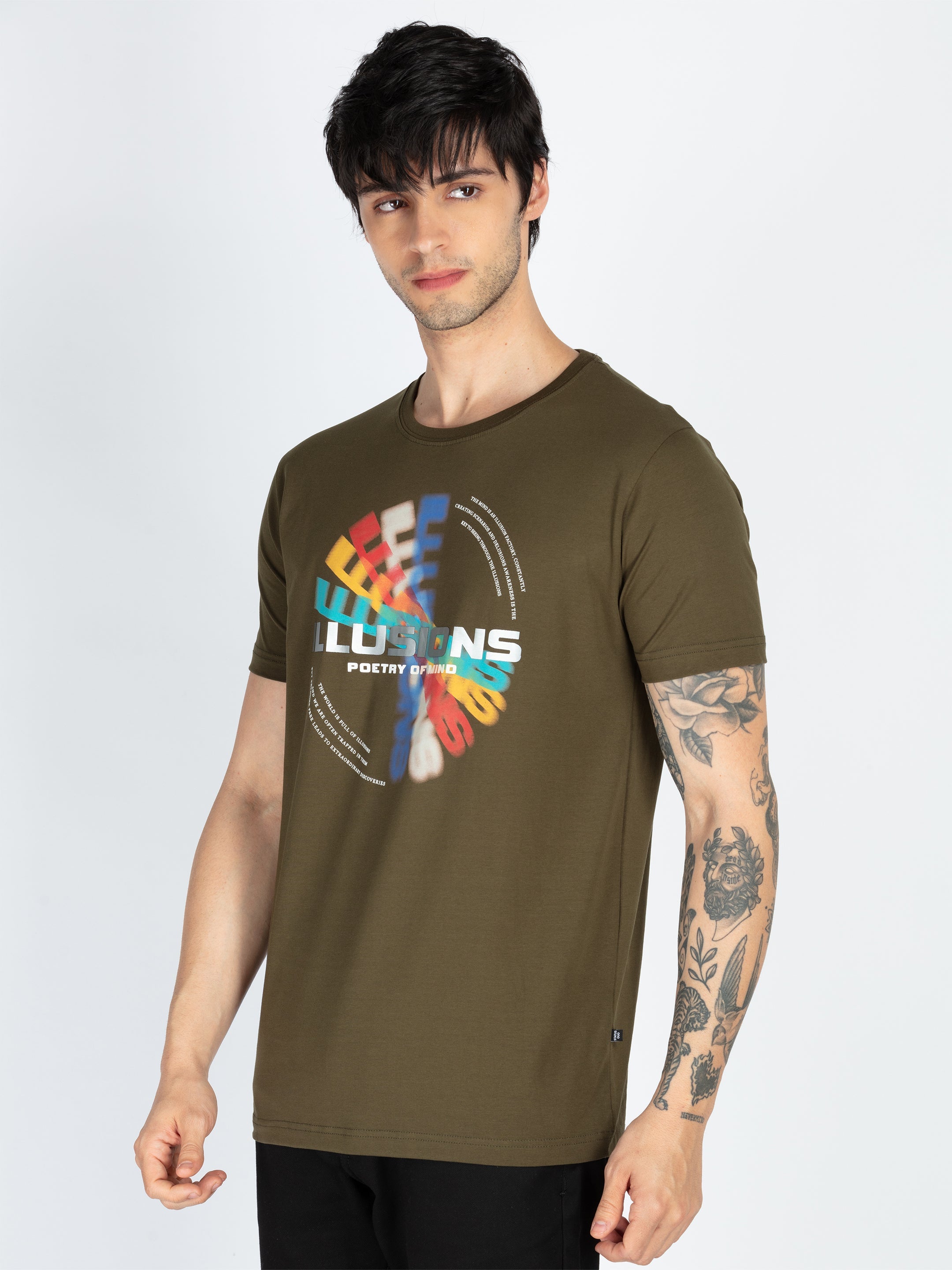 Olive Mens Printed Round Neck T-Shirt With Half Sleeves