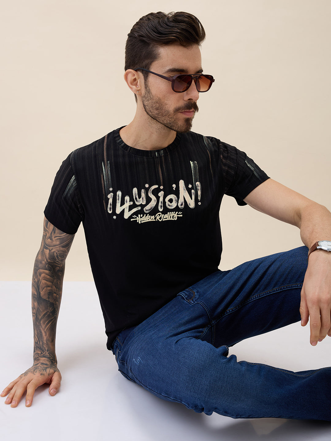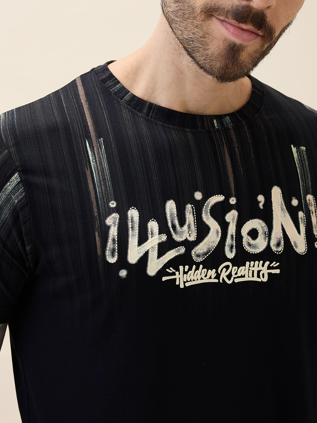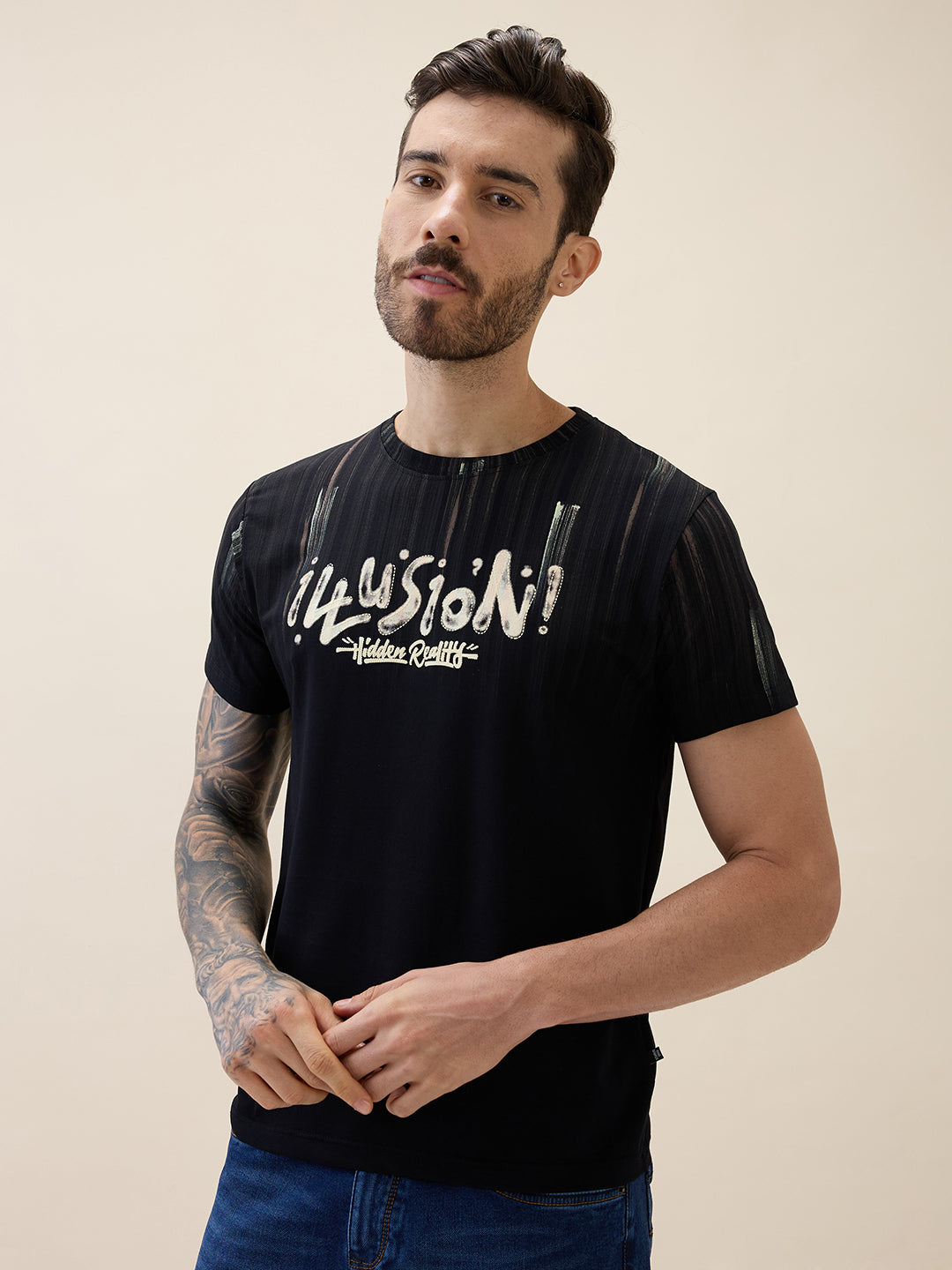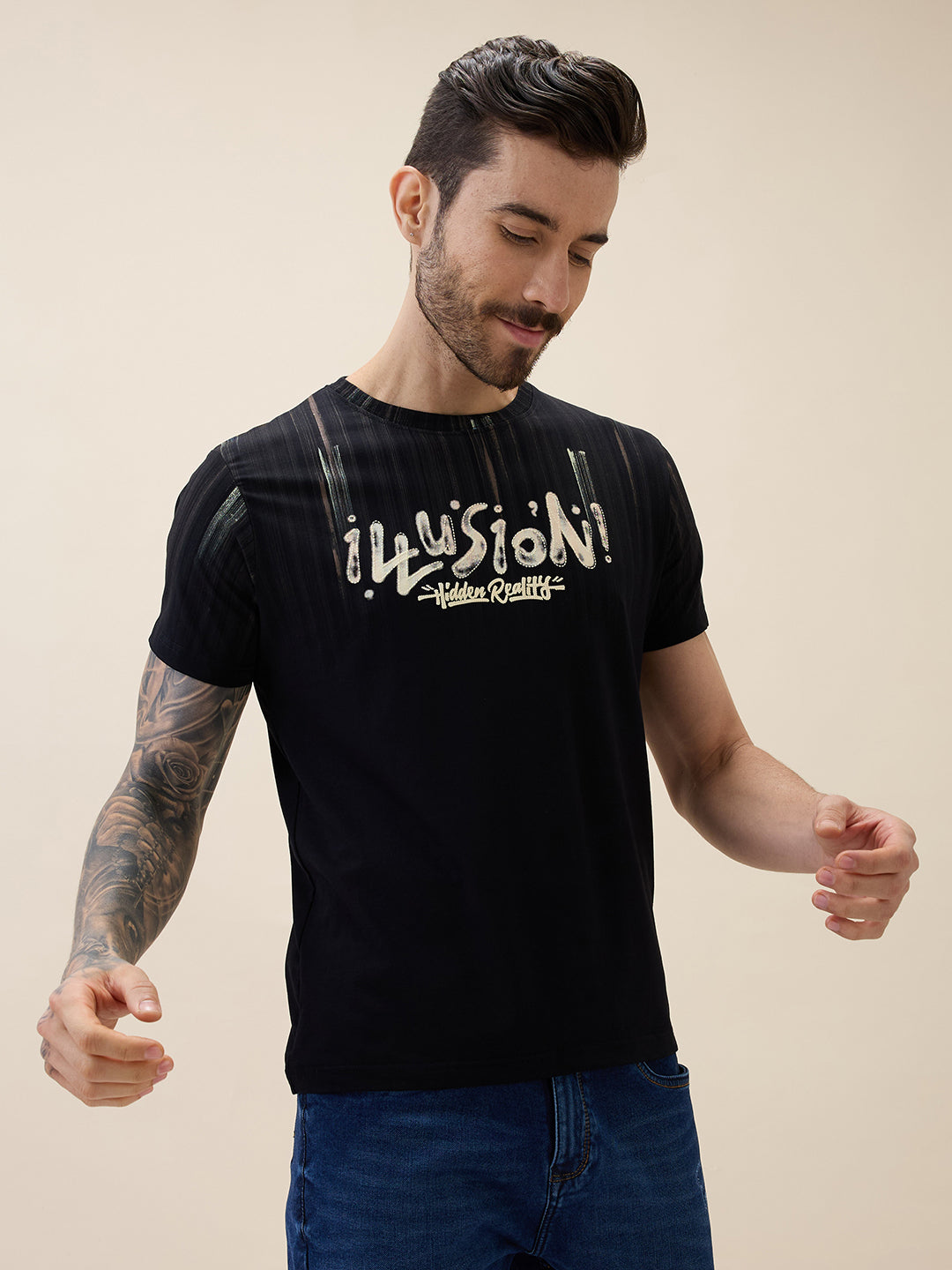BLACK Men's Printed Round Neck Half Sleeves Regular Fit Tshirt