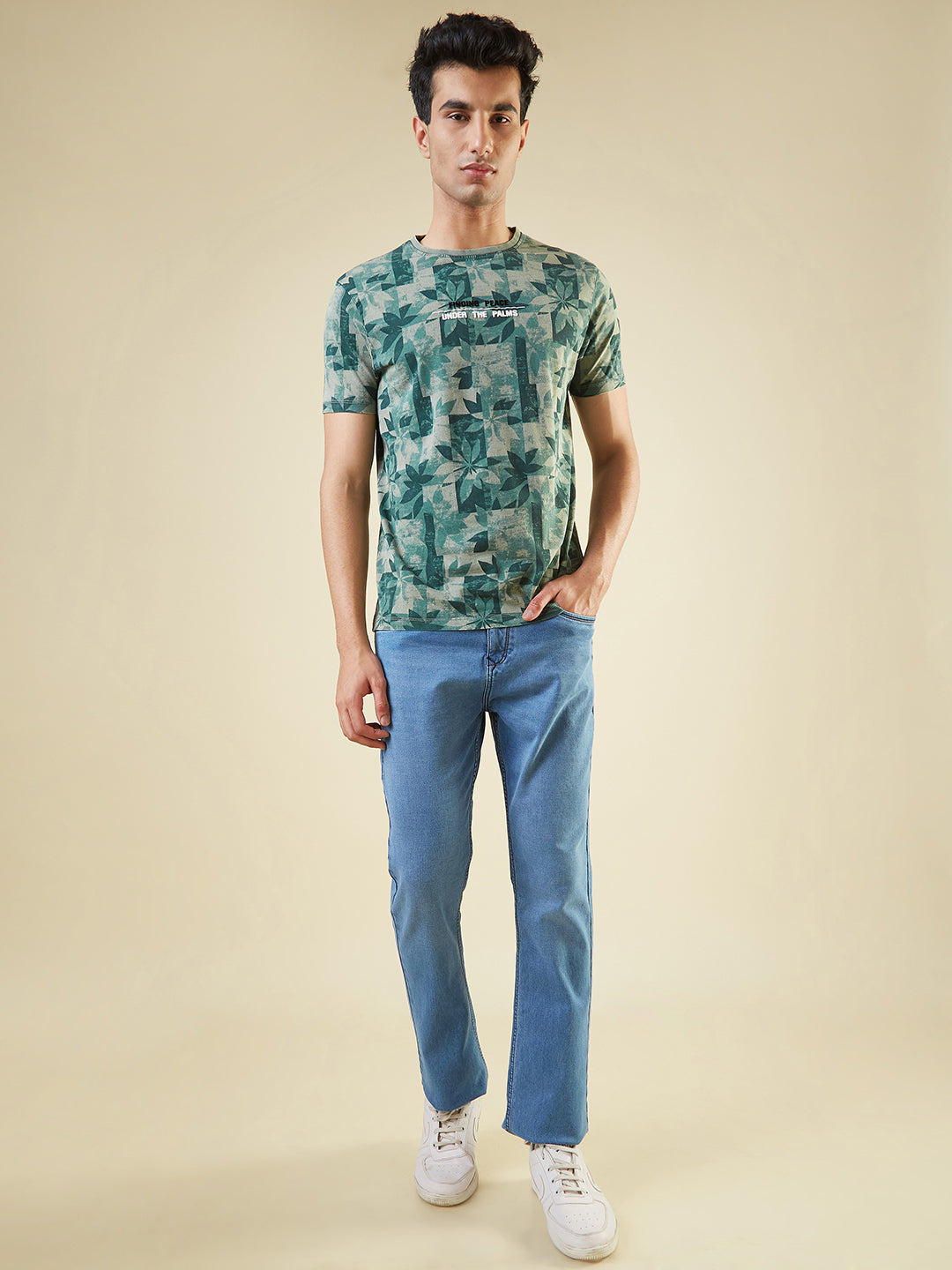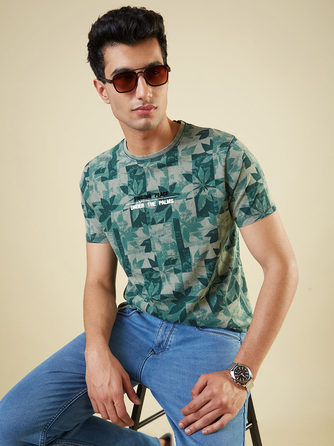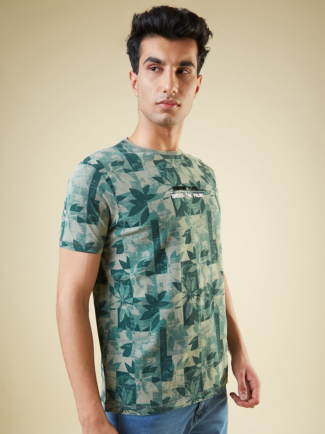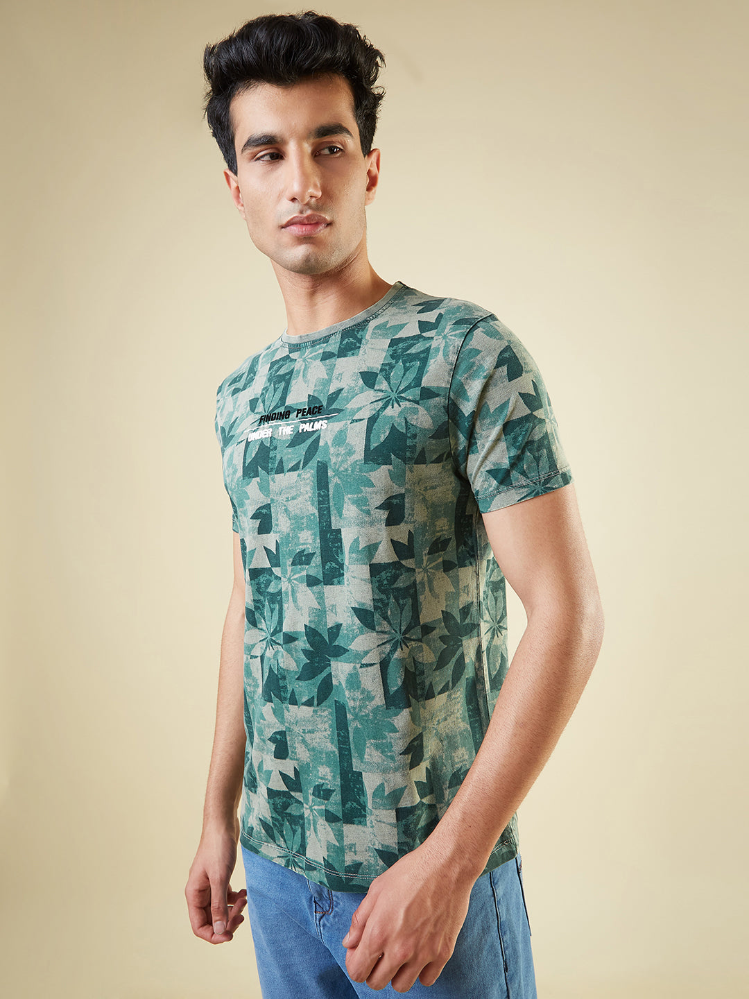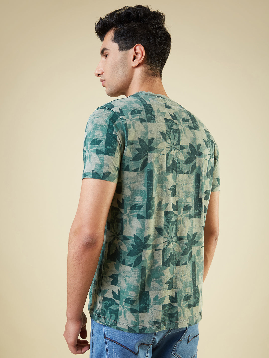 GREEN Mens All-Over Abstract Printed Half Sleeves Regular Fit T-shirt