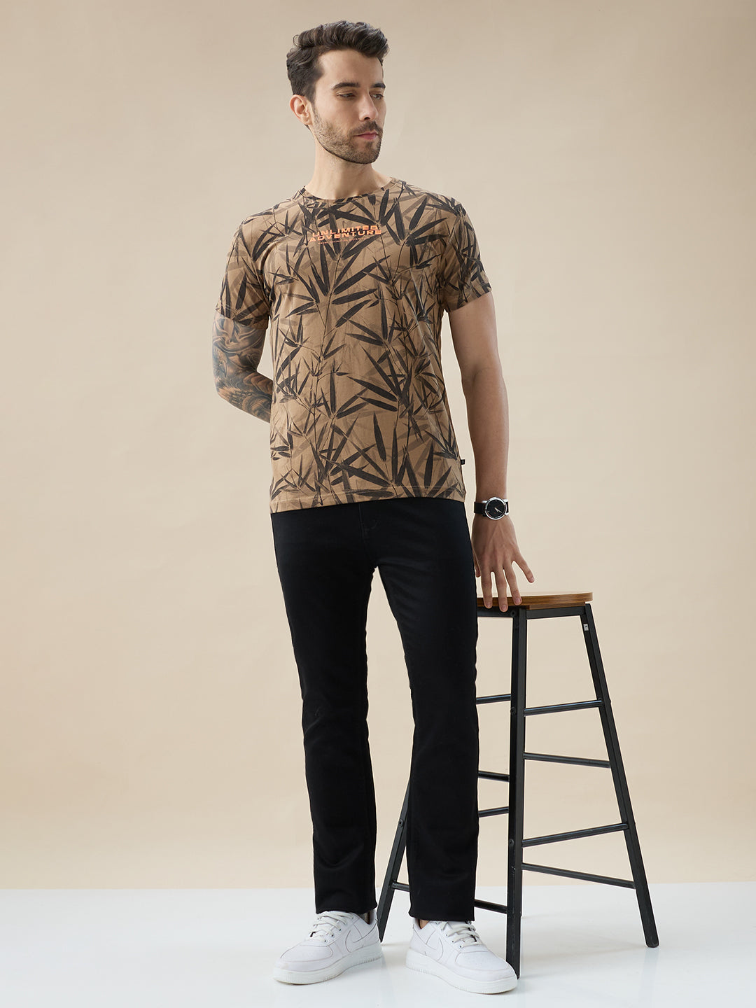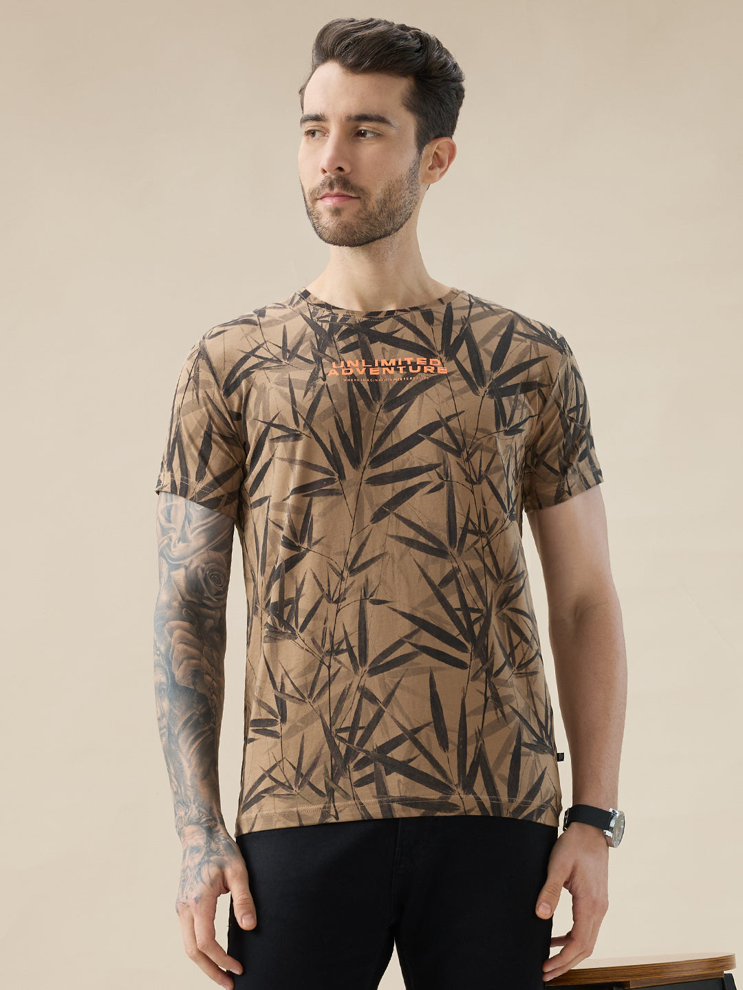 BROWN Men's Round Neck Half Sleeve All Over Tropical Print T-Shirt