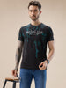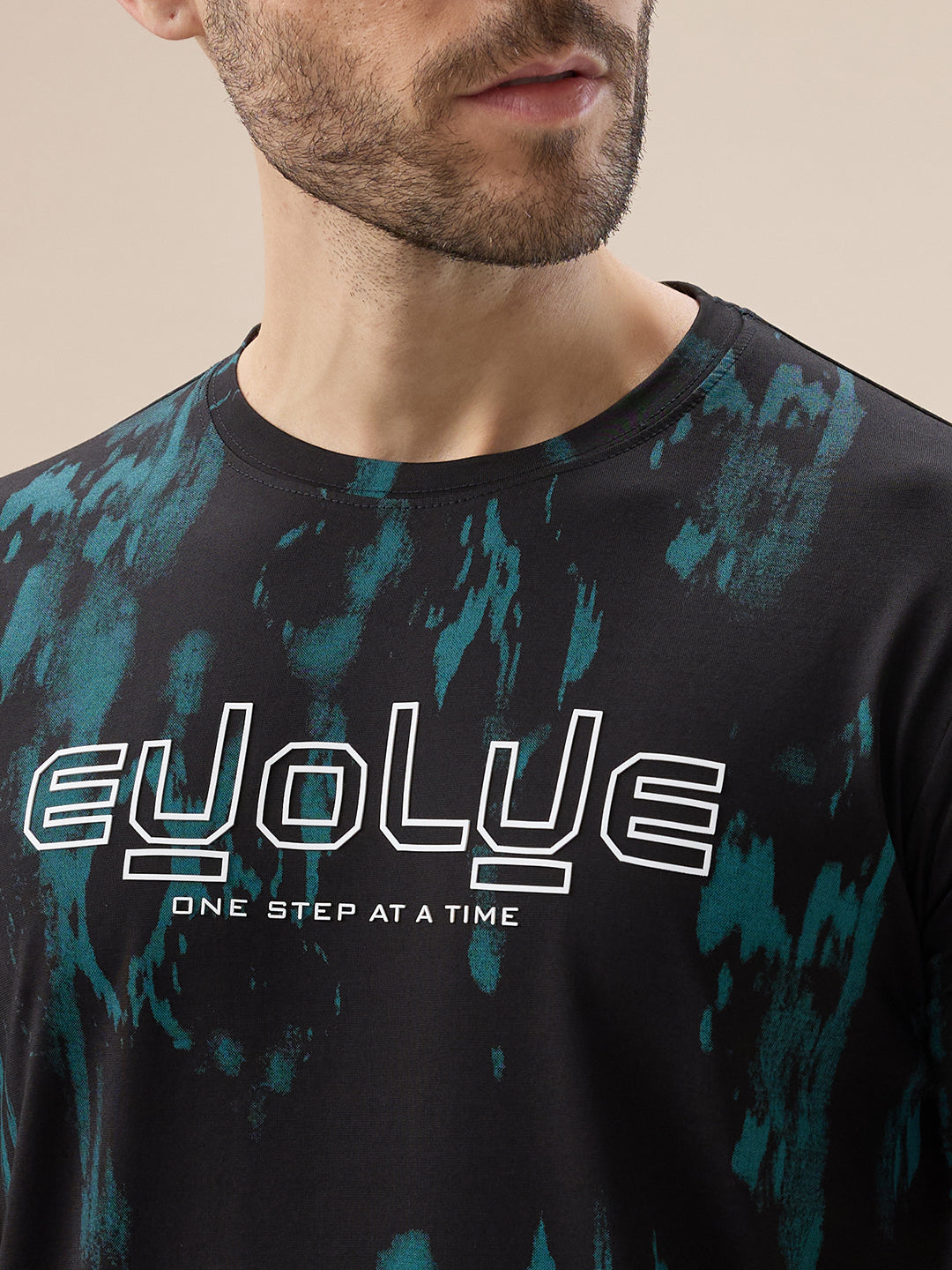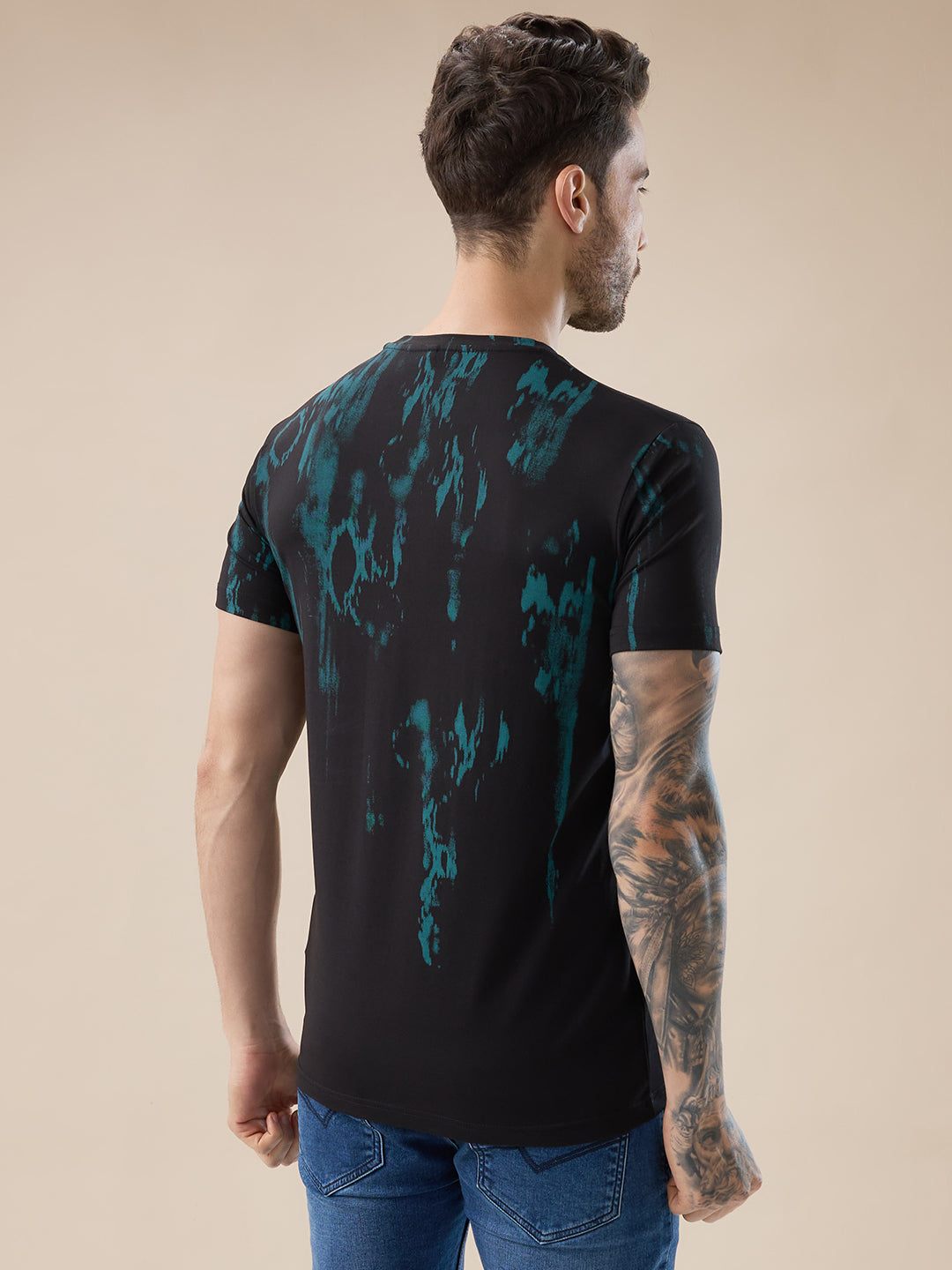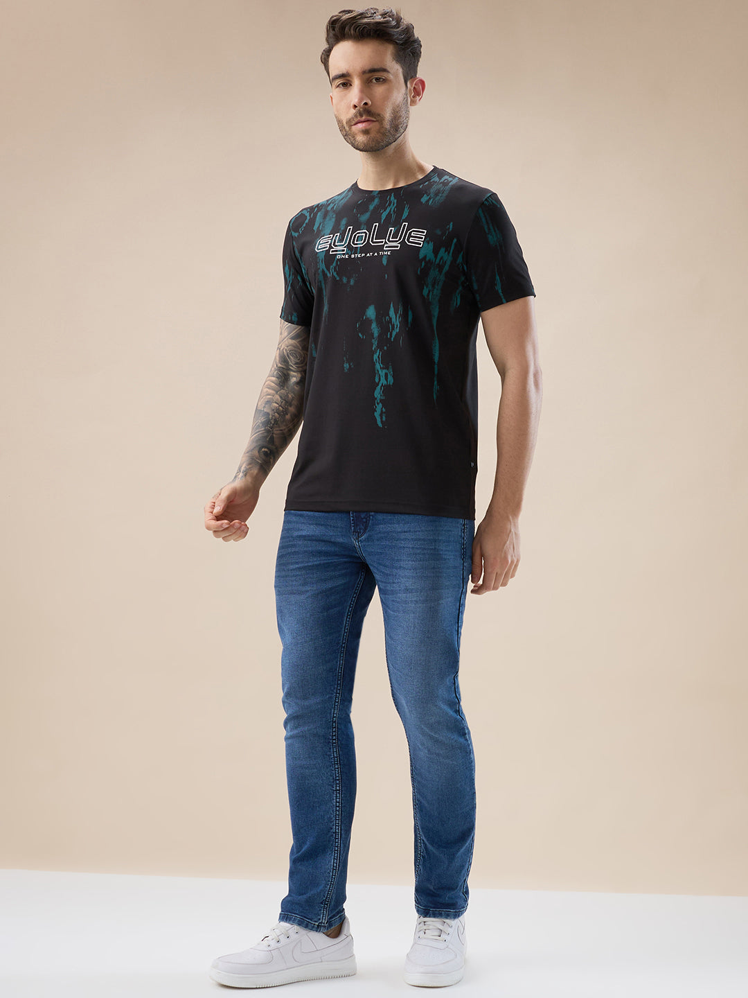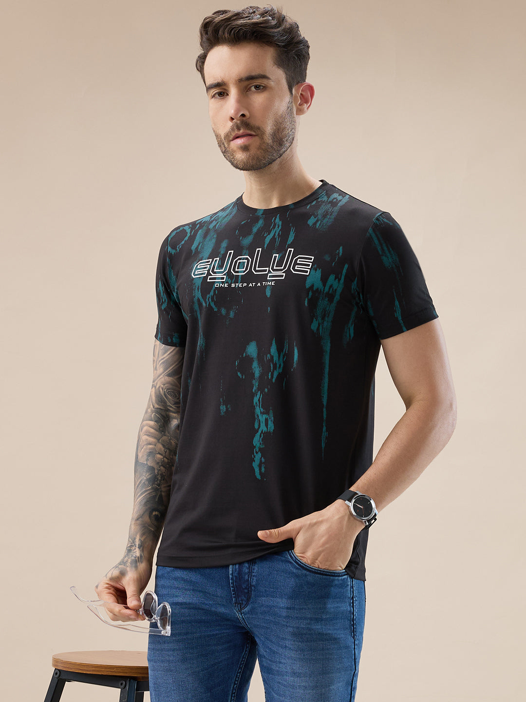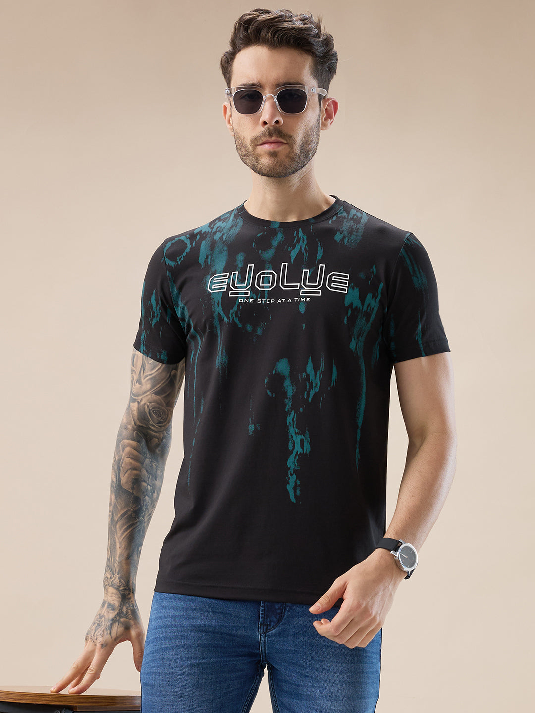 BLACK Men's Round Neck Half Sleeve Tie and Dye Print T-Shirt with Rubberised Chest Typography