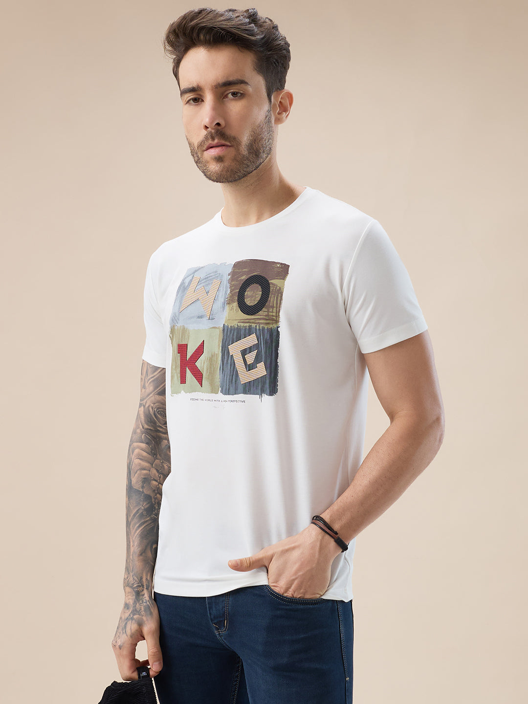 OFF WHITE Men's Chest Applique Typography Print Round Neck Half Sleeves T-Shirt
