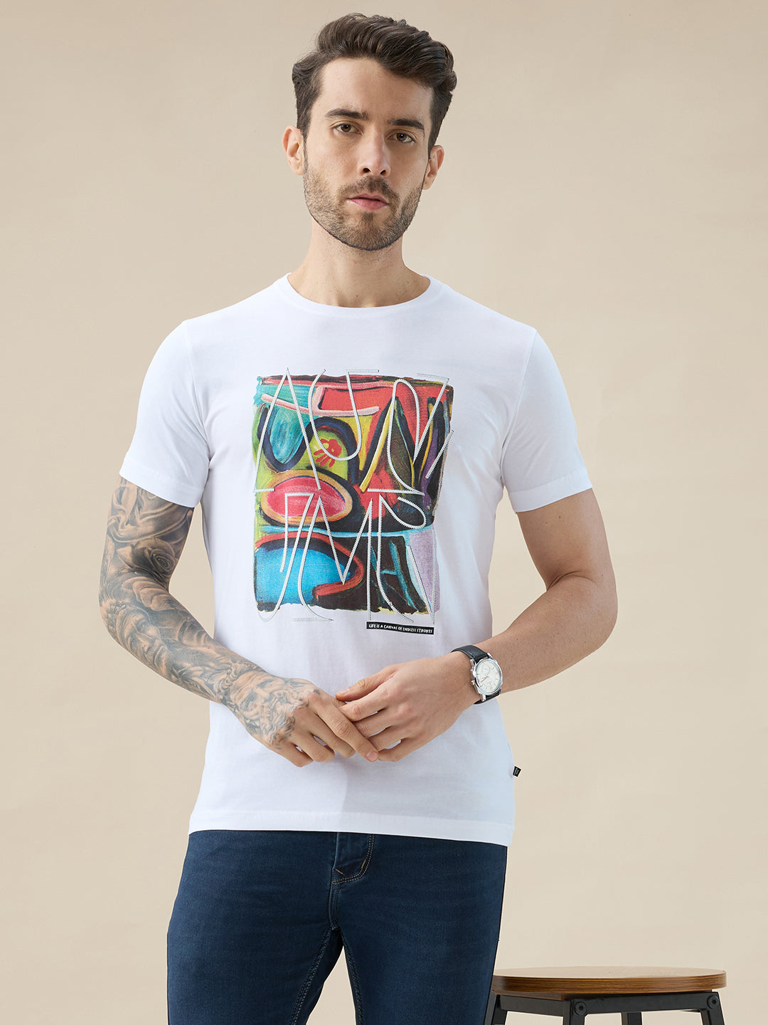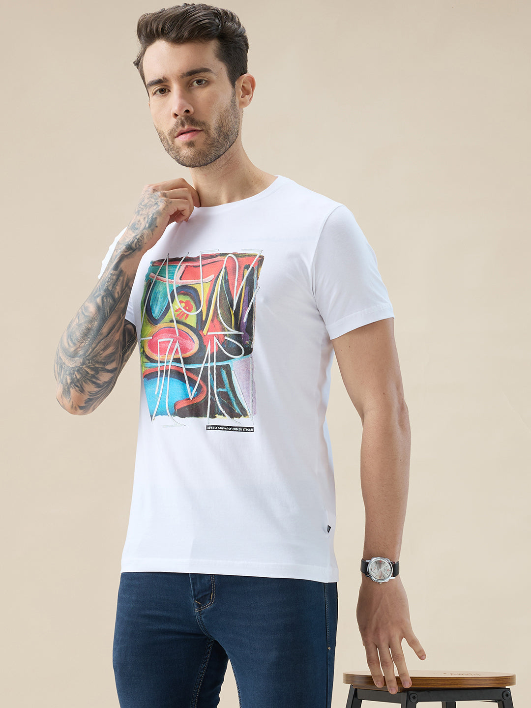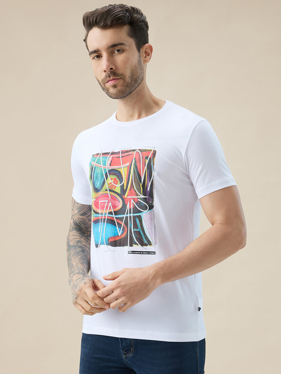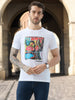 WHITE Men's Chest Graphic Print Round Neck Half Sleeve Regular Fit T-Shirt
