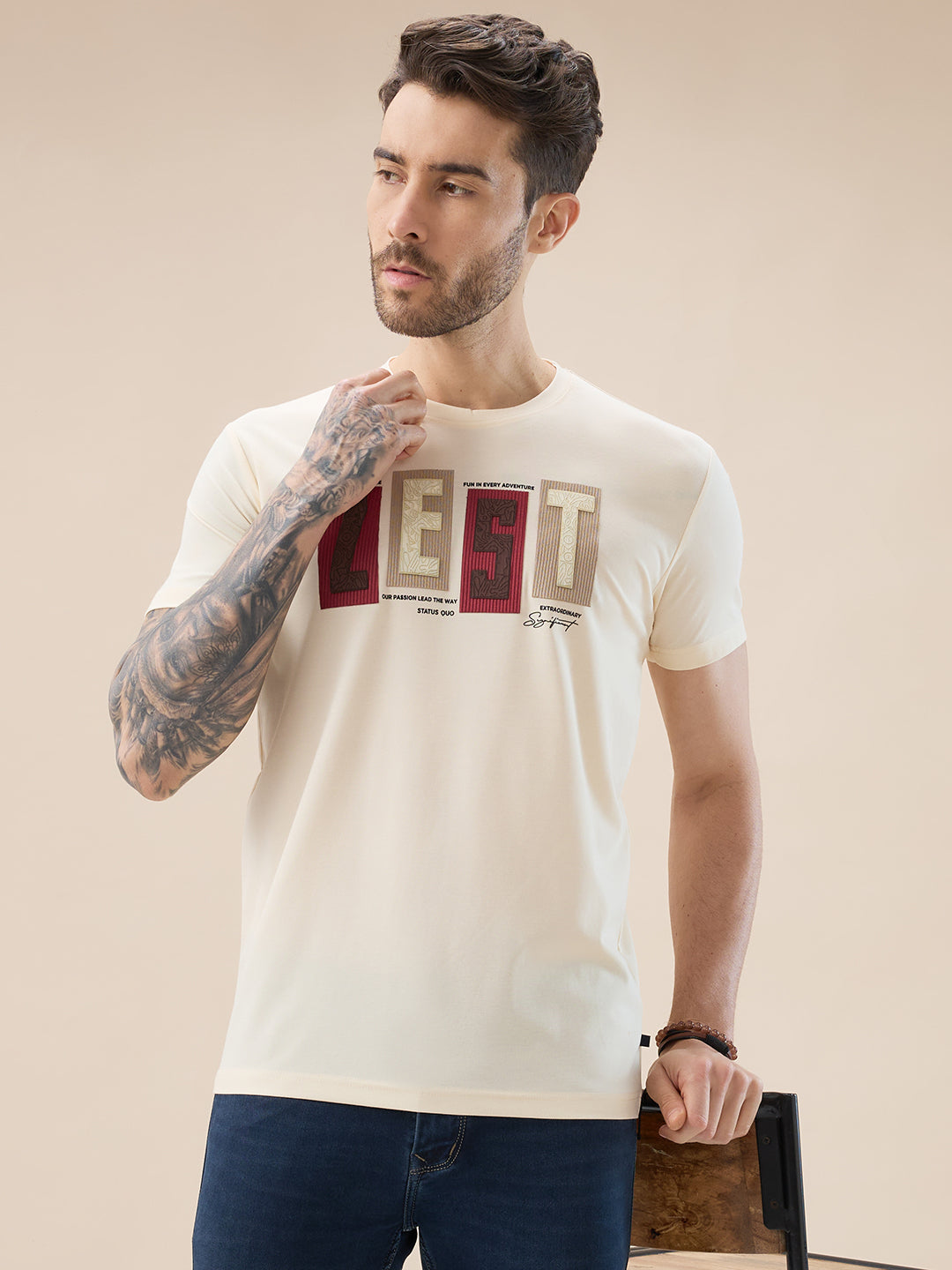 BEIGE Men's Rubberized Typography Print Round Neck Regular Fit T-Shirt