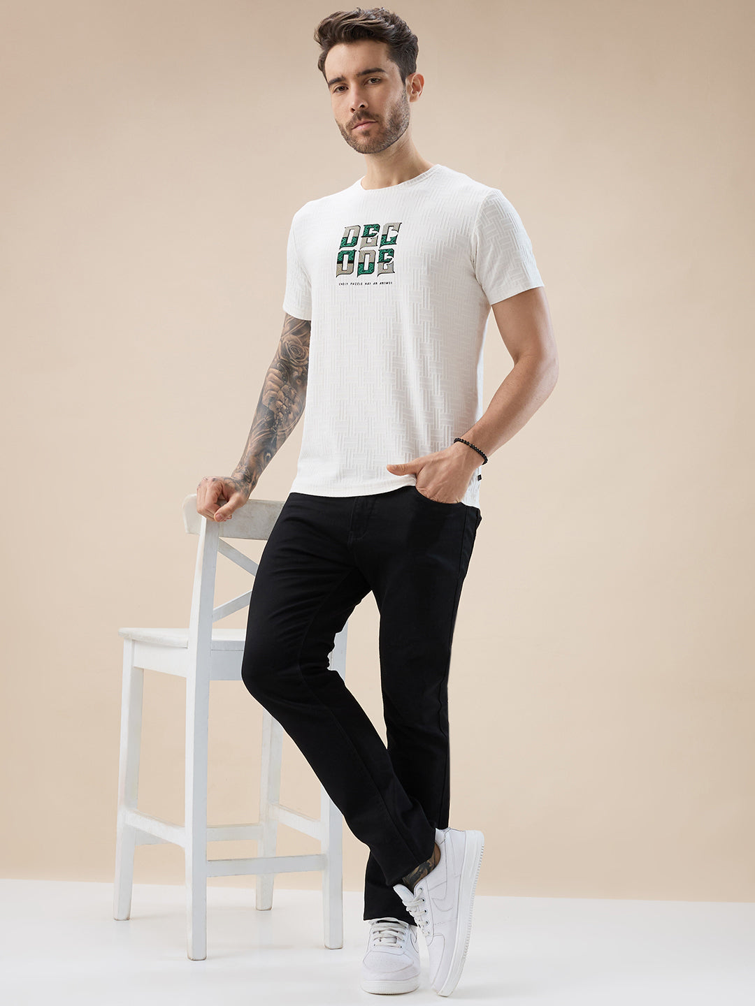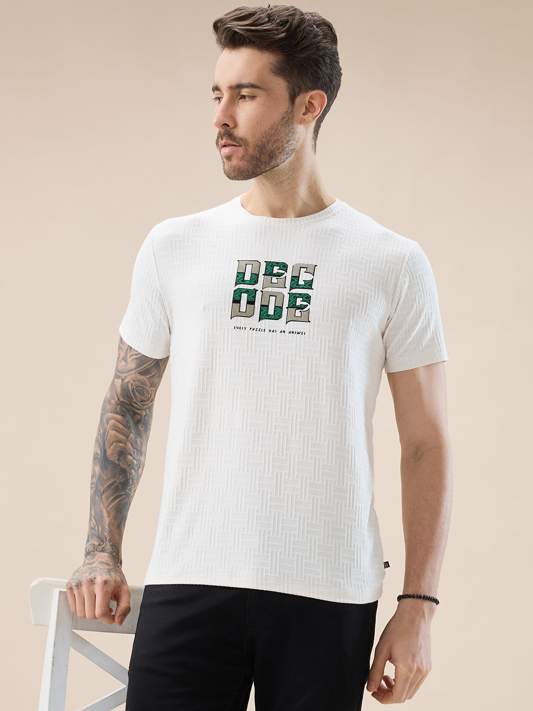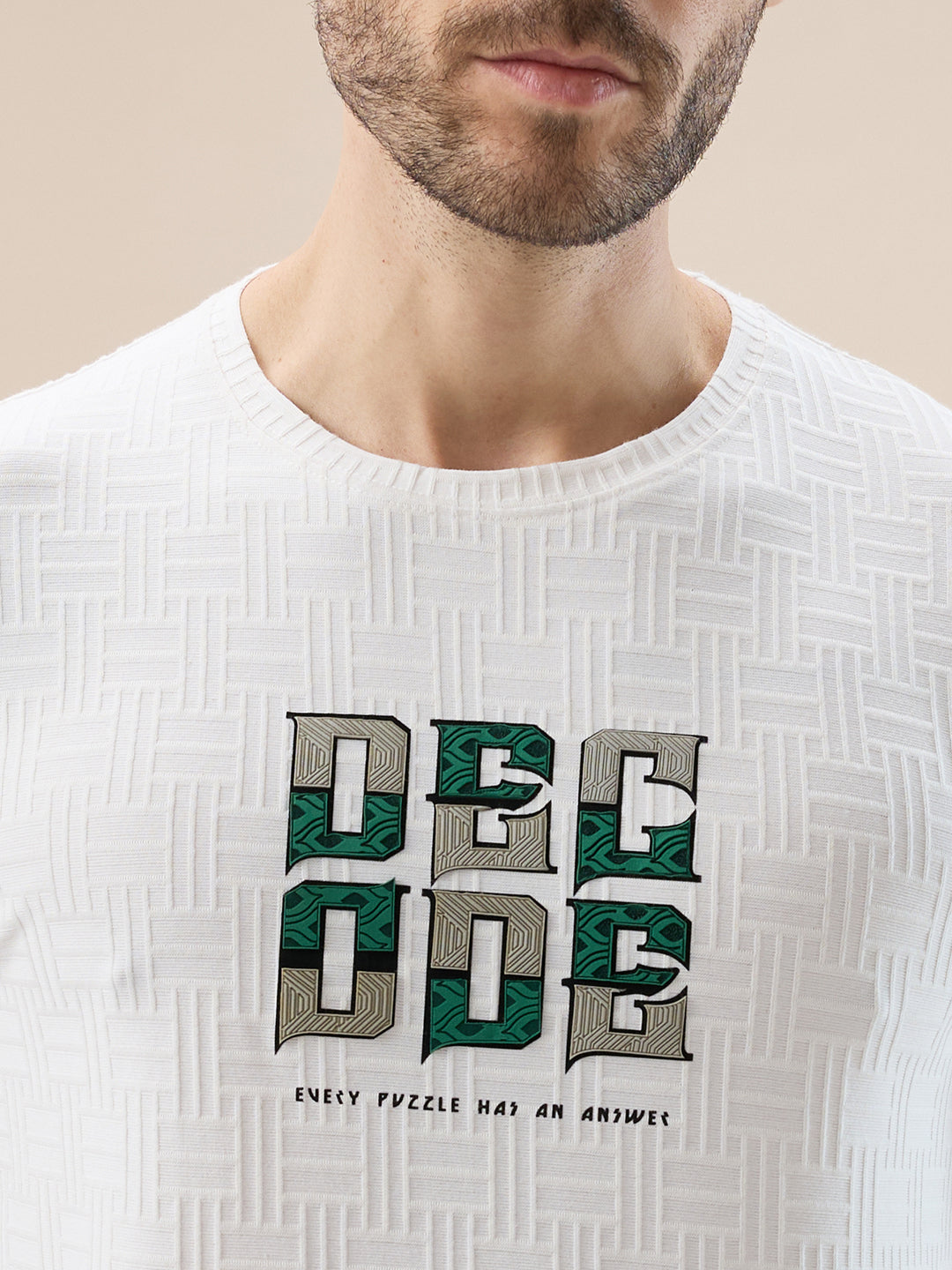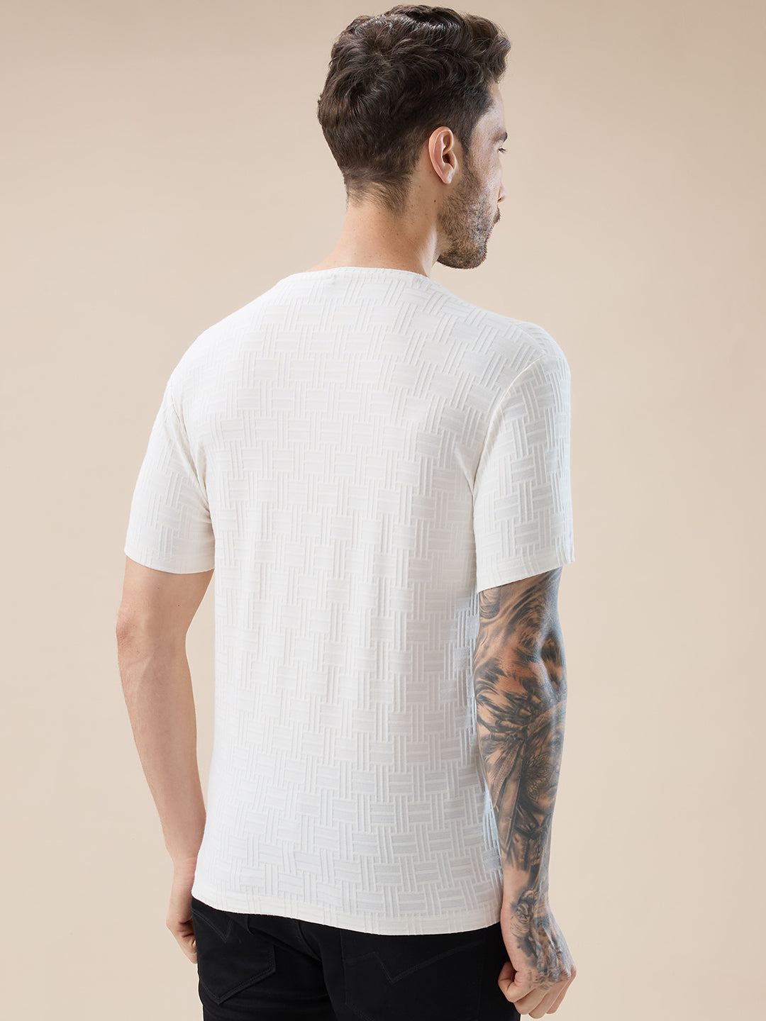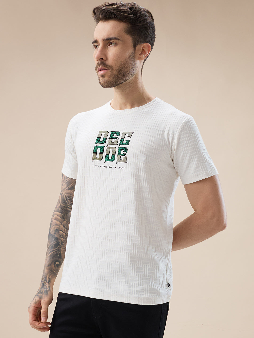 OFF WHITE Men's Textured Typography Print Round Neck Regular Fit T-Shirt