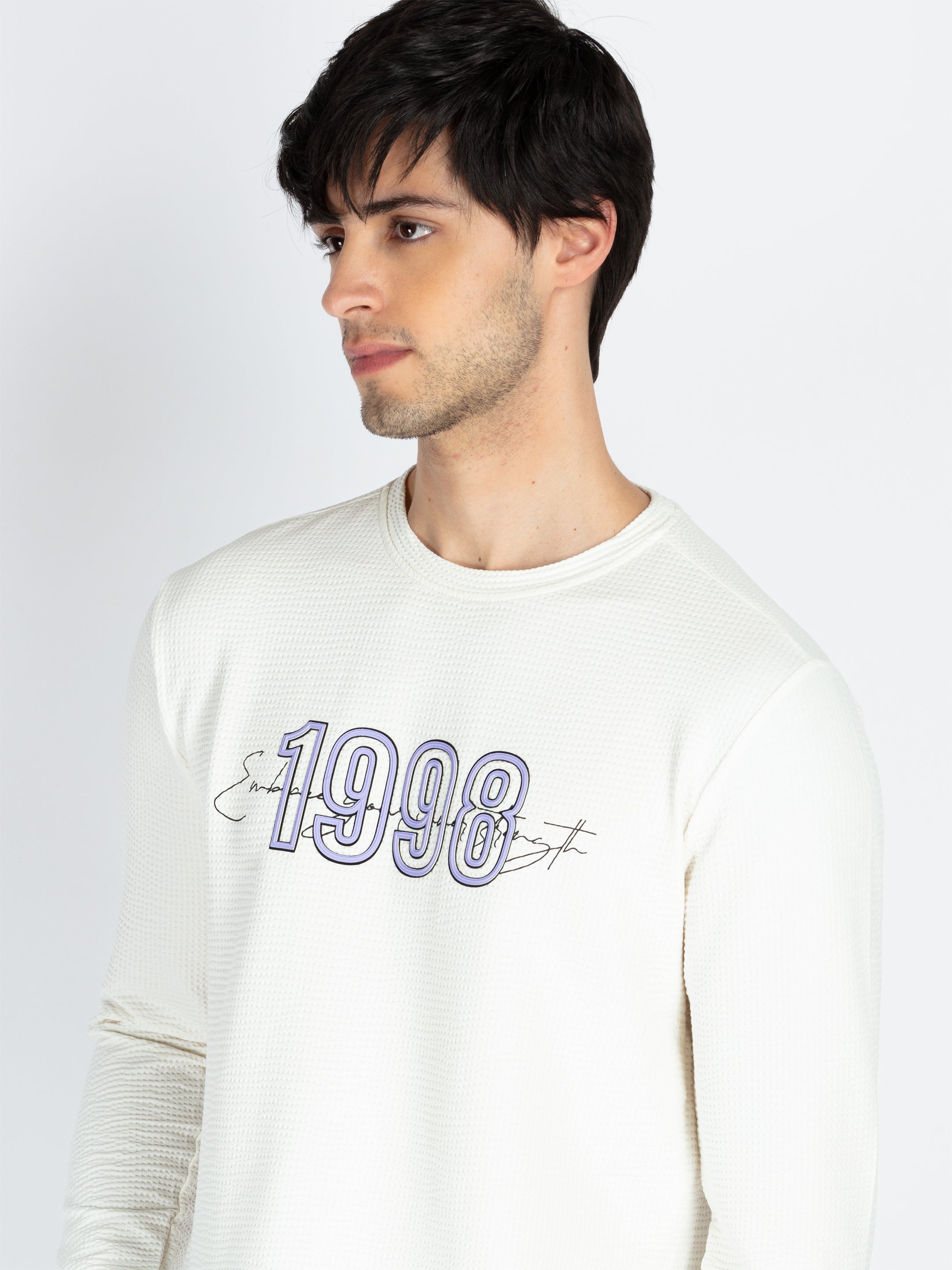 Off White Mens Printed Round Neck Full Sleeve T-Shirt