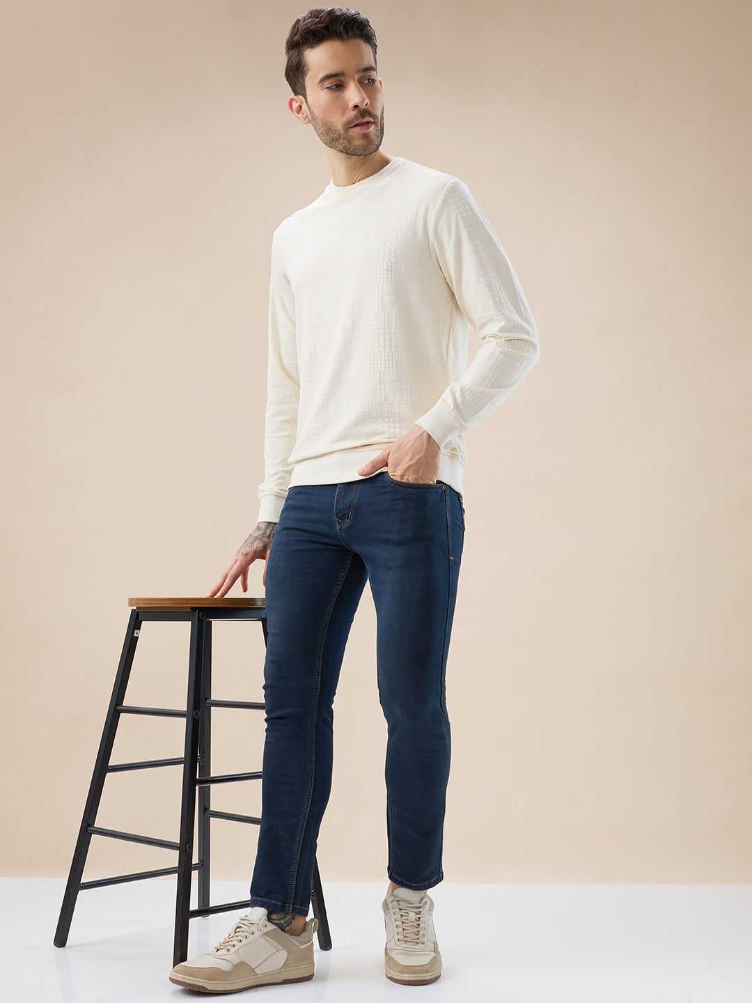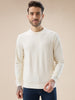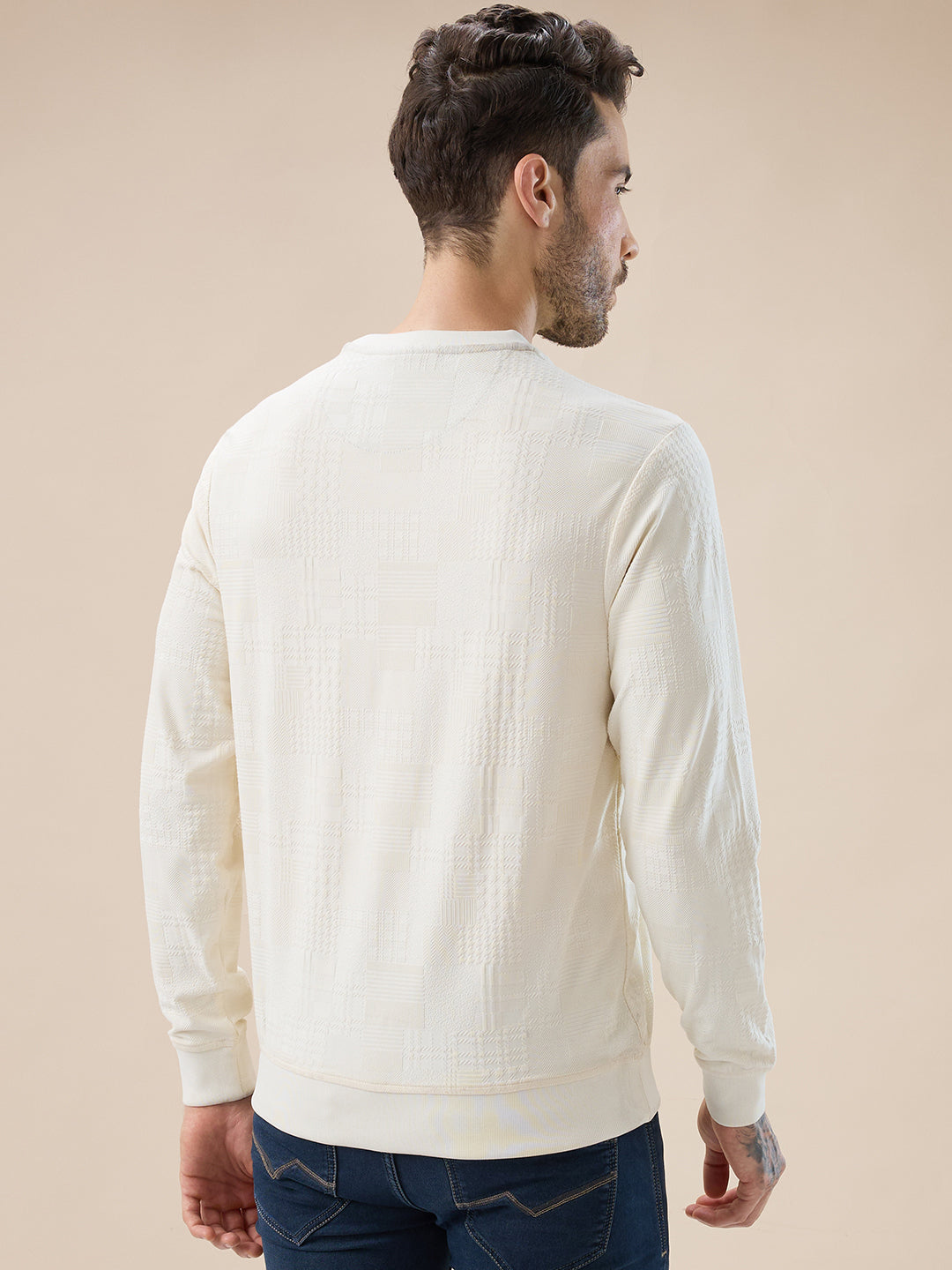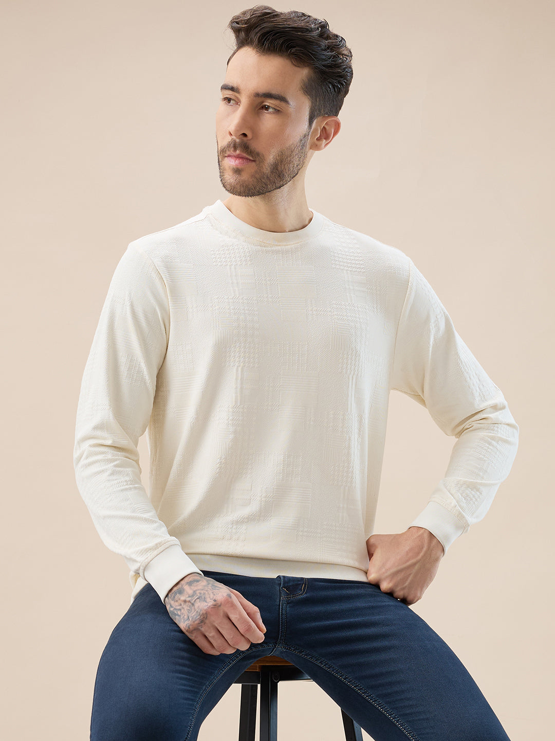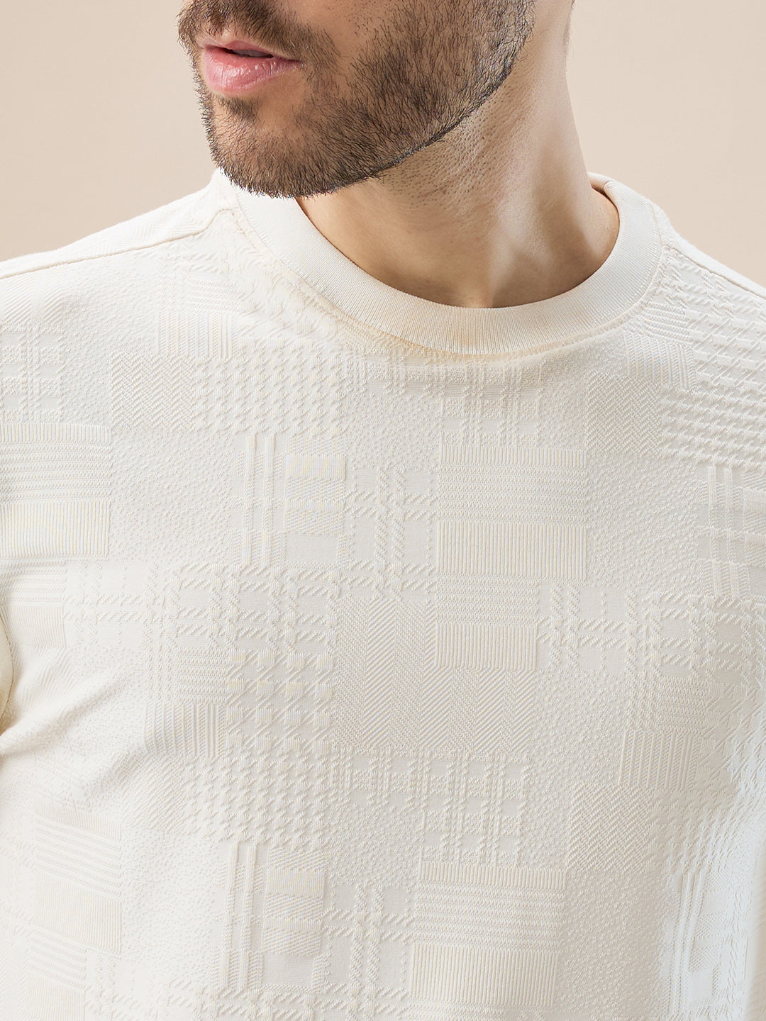 OFF WHITE Men's Geometric Textured Round Neck Full Sleeve Regular Fit T-Shirt