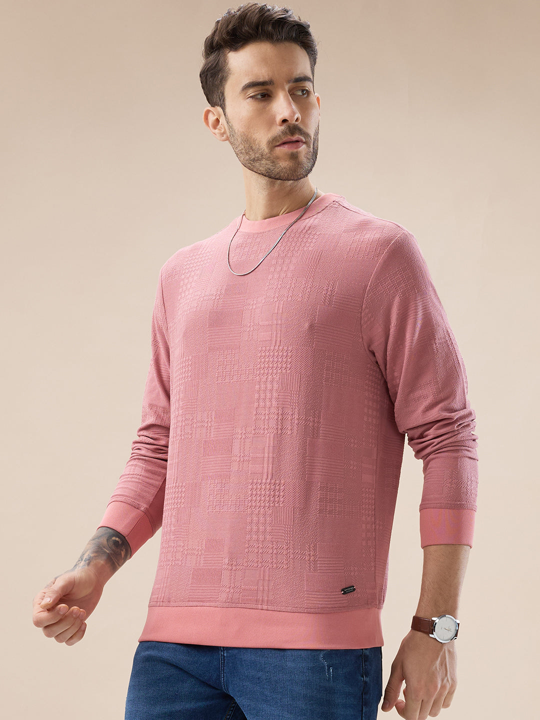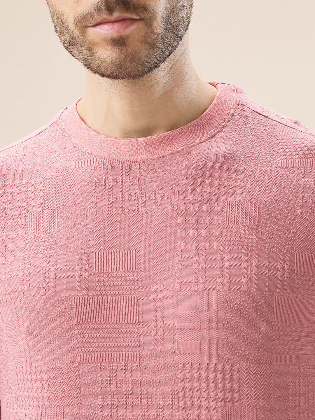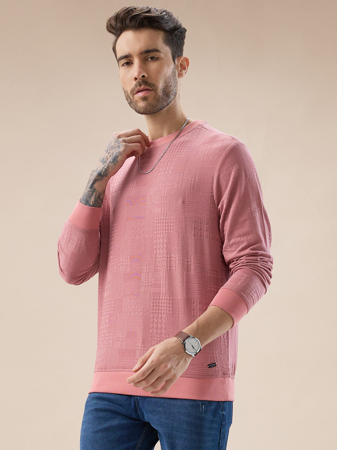 ROSE GOLD Men's Geometric Textured Round Neck Full Sleeve Regular Fit T-Shirt