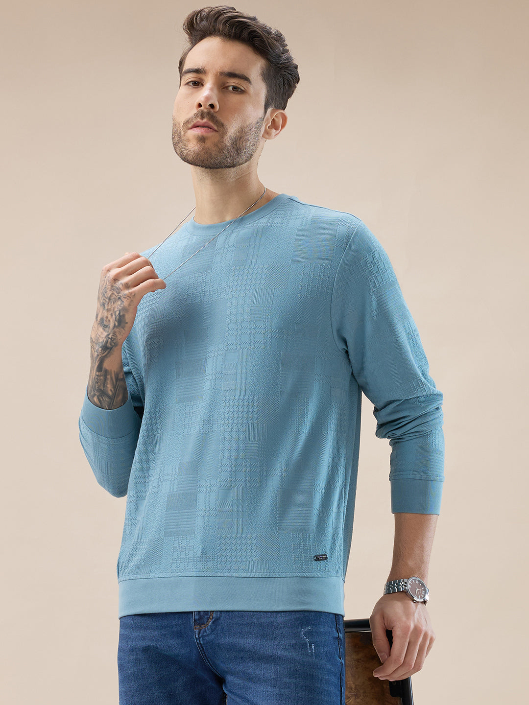 S.BLUE Men's Geometric Textured Round Neck Full Sleeve Regular Fit T-Shirt