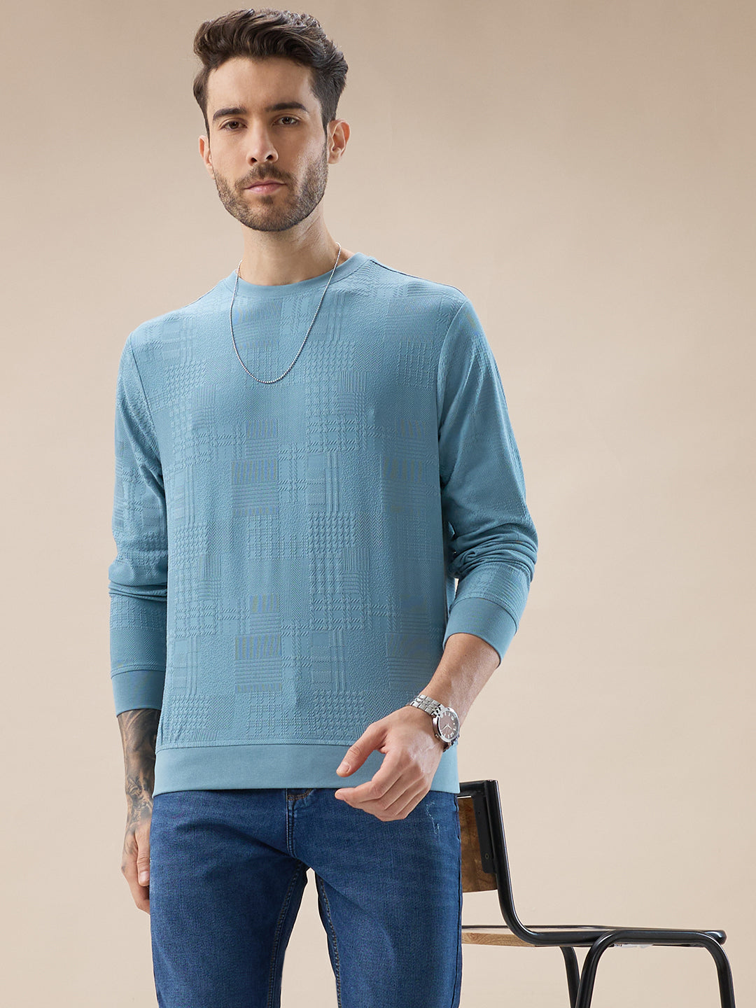 S.BLUE Men's Geometric Textured Round Neck Full Sleeve Regular Fit T-Shirt