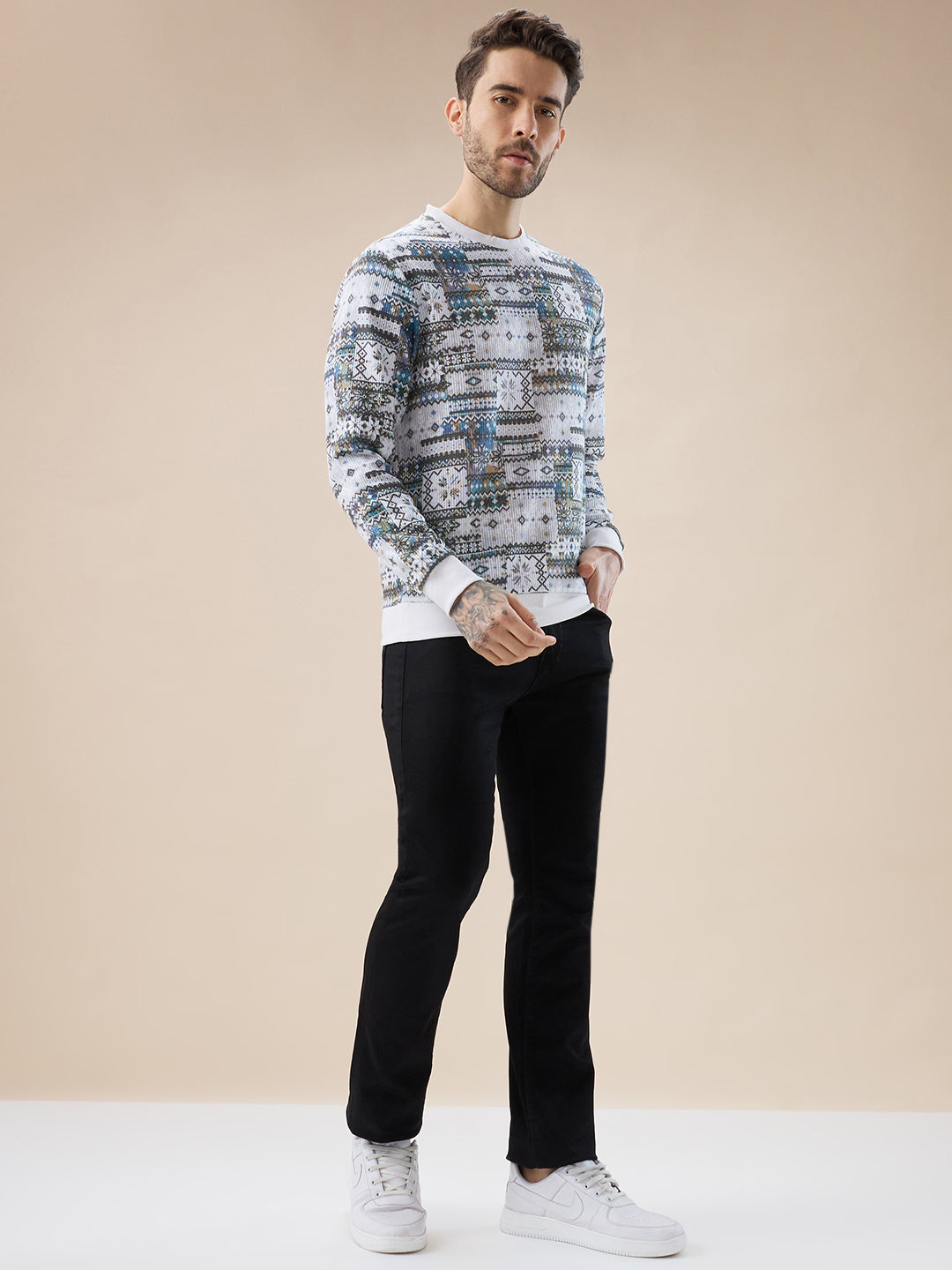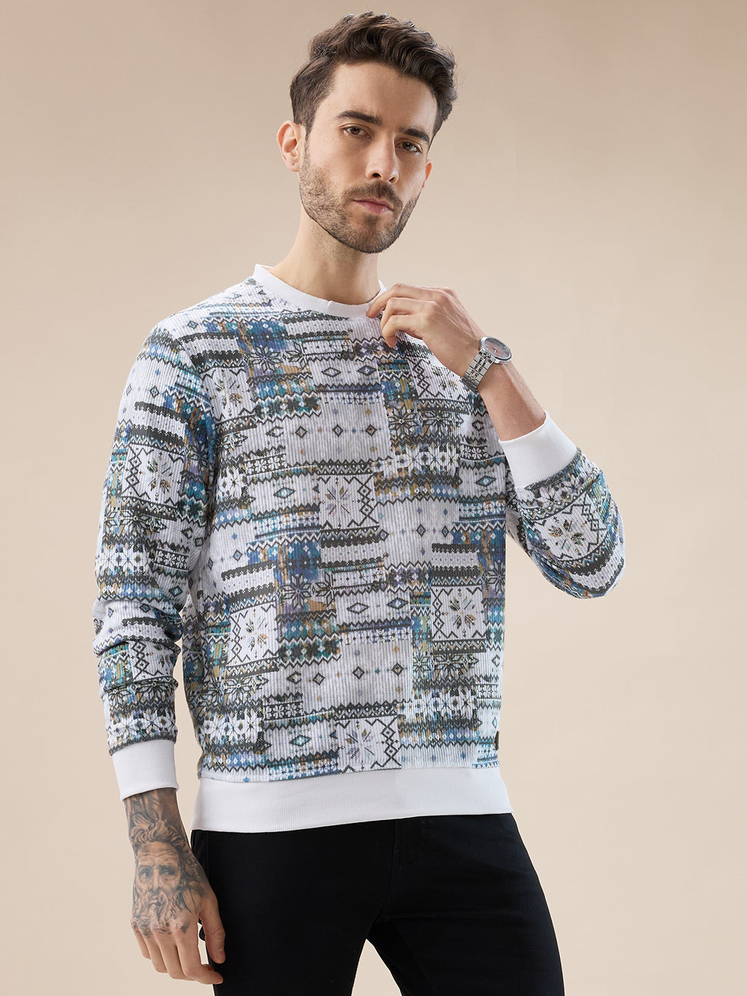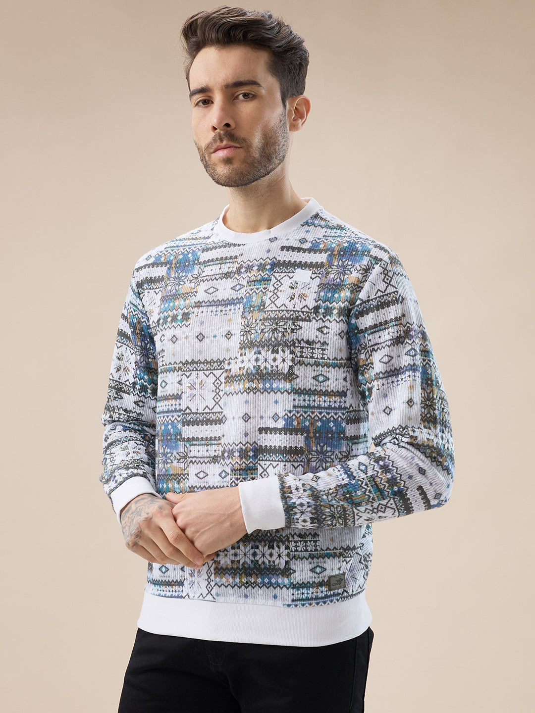 RUST Men's Abstract Geometric Print Round Neck Full Sleeves T-Shirt