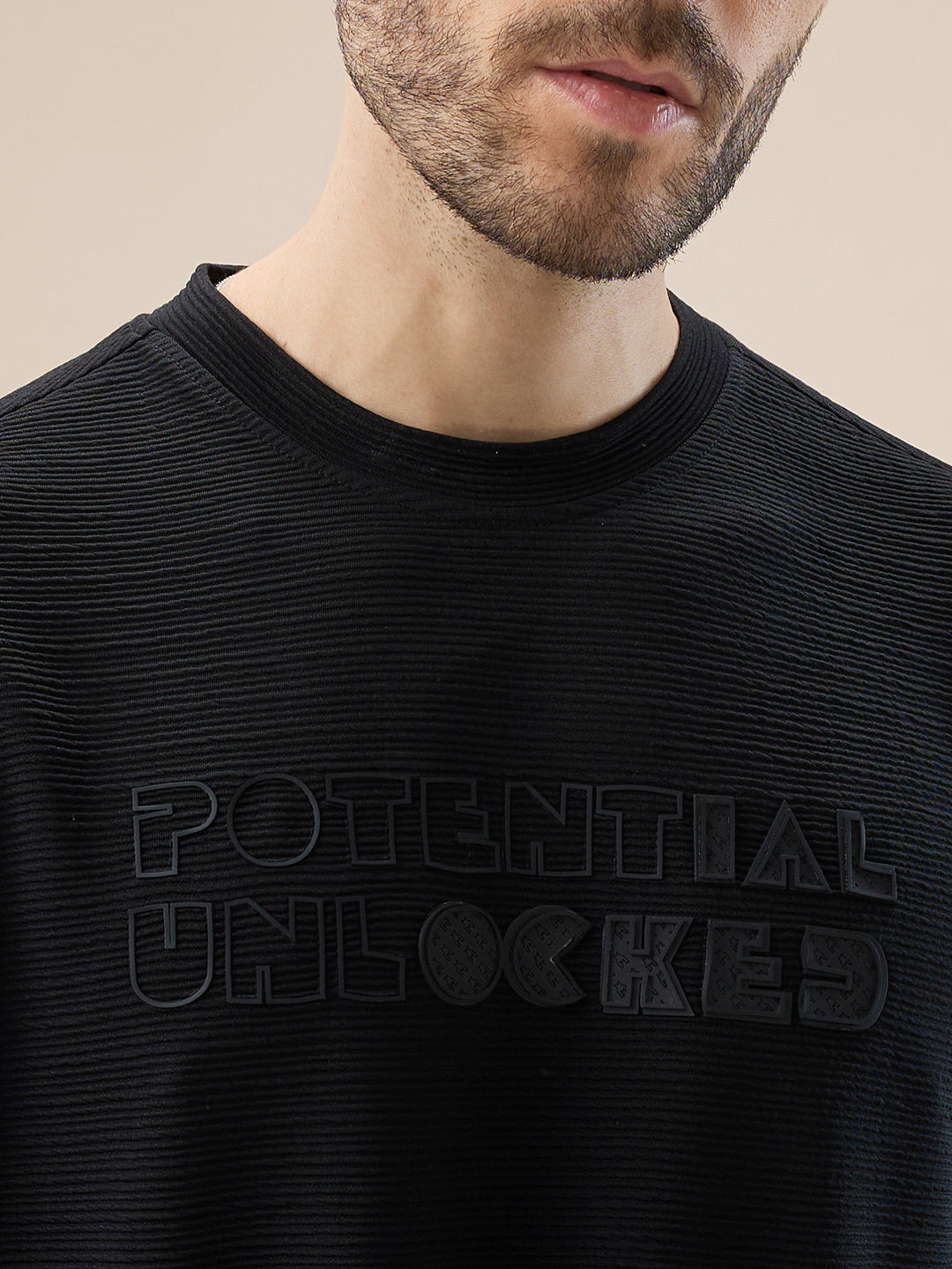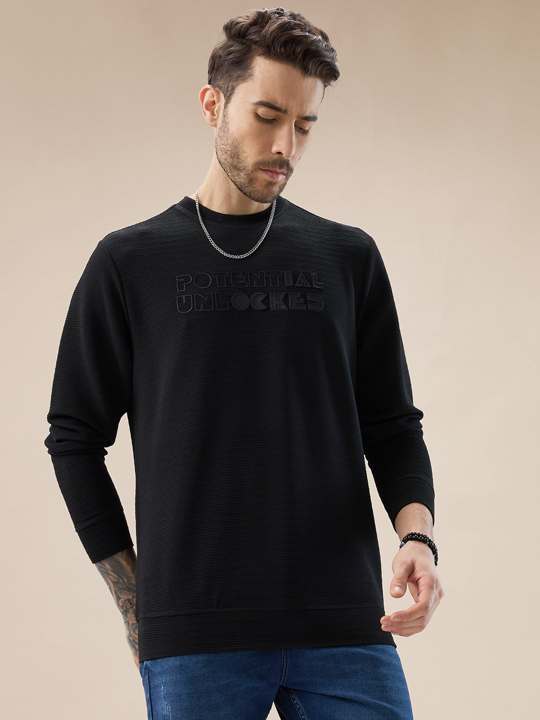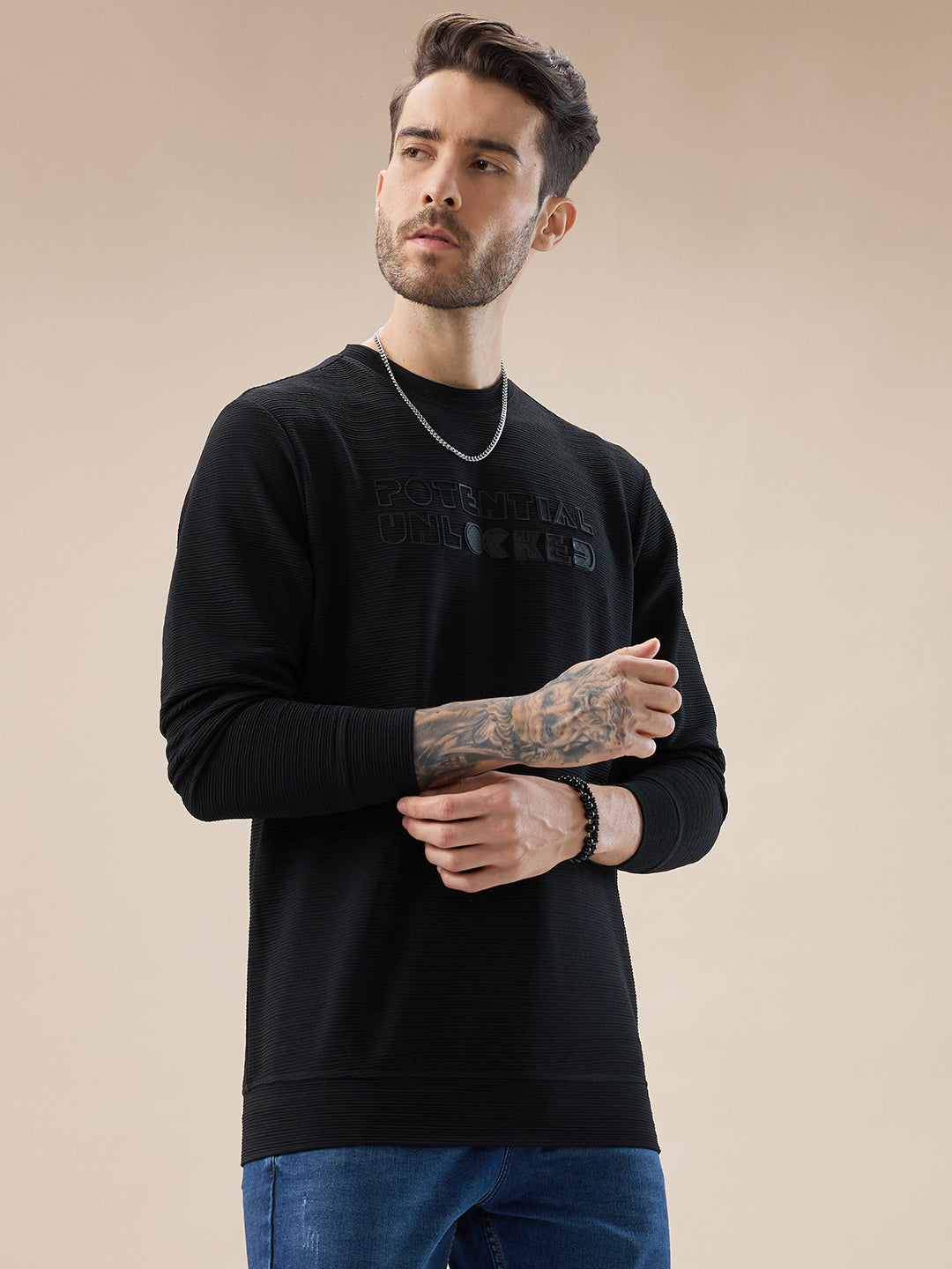 BLACK Men's Solid Textured Chest Typography Round Neck Ful Sleeves T-Shirt