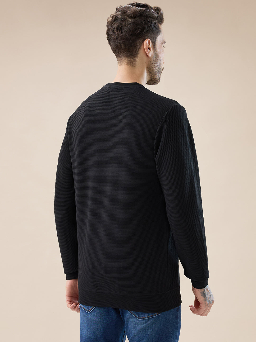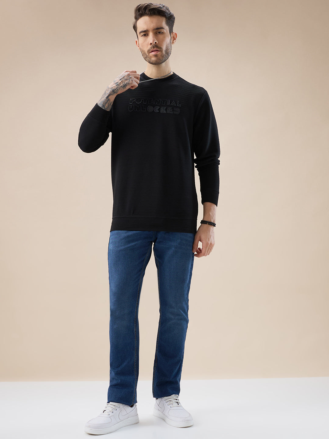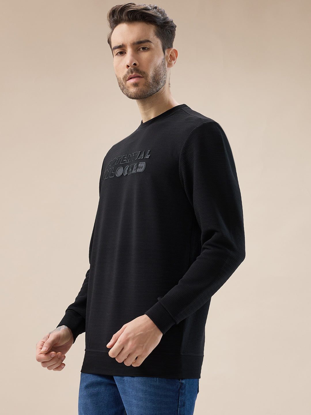BLACK Men's Solid Textured Chest Typography Round Neck Ful Sleeves T-Shirt