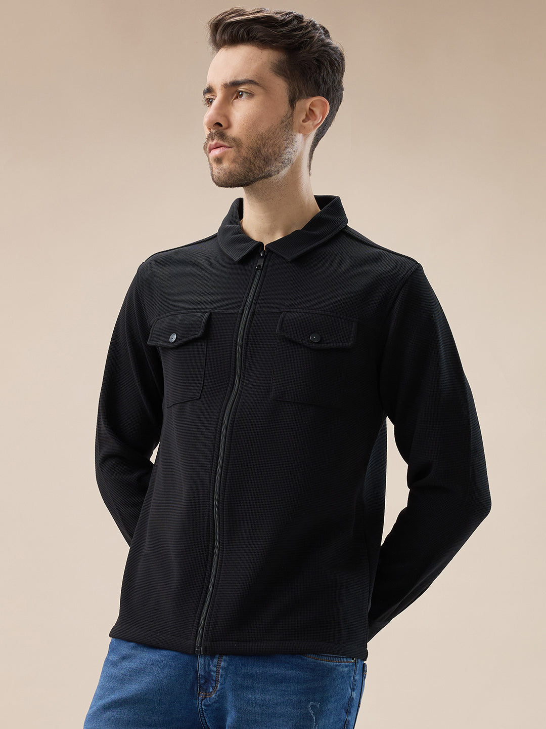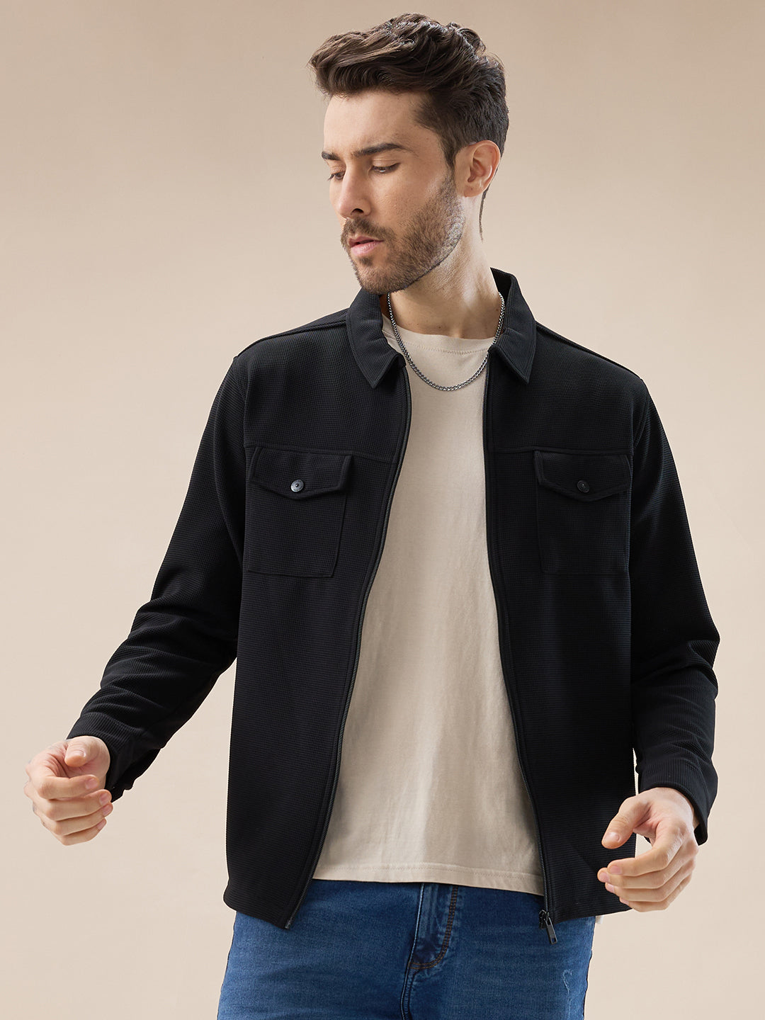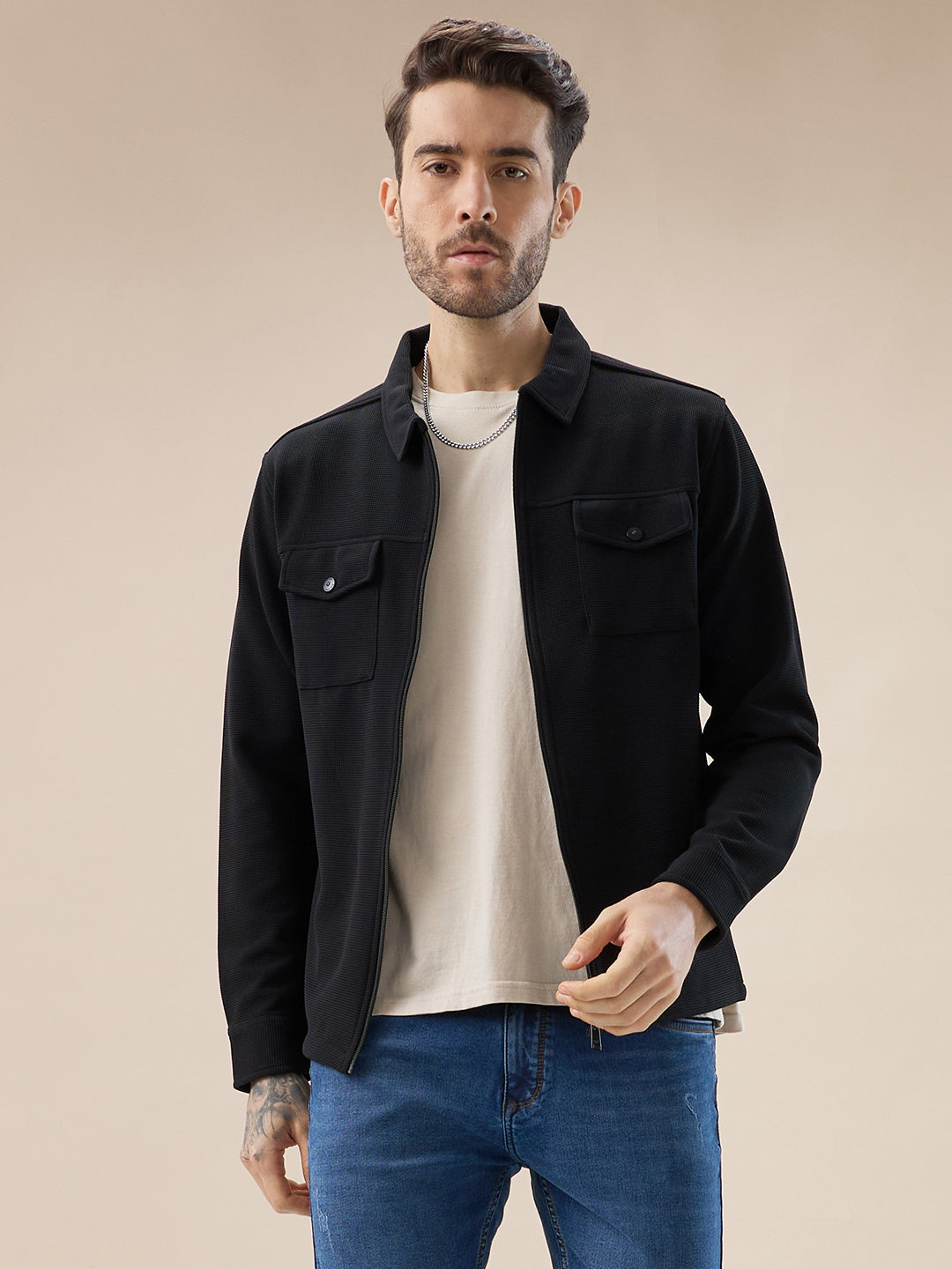 BLACK Men's Solid Textured Regular Fit Shacket with Zipper Clouser