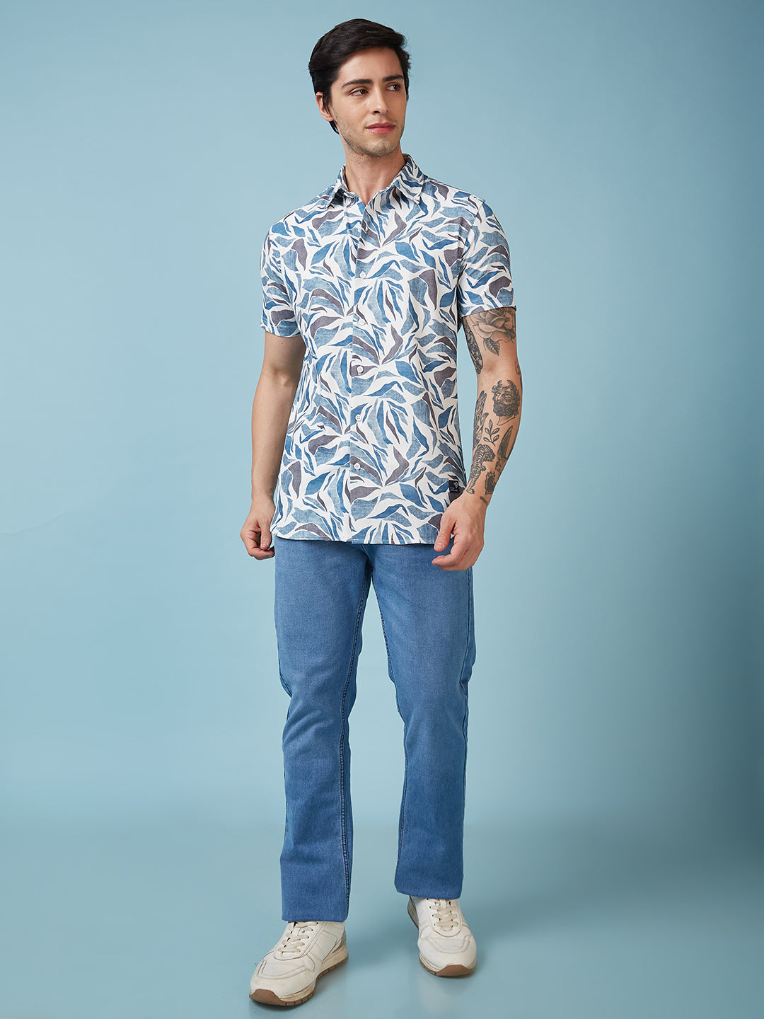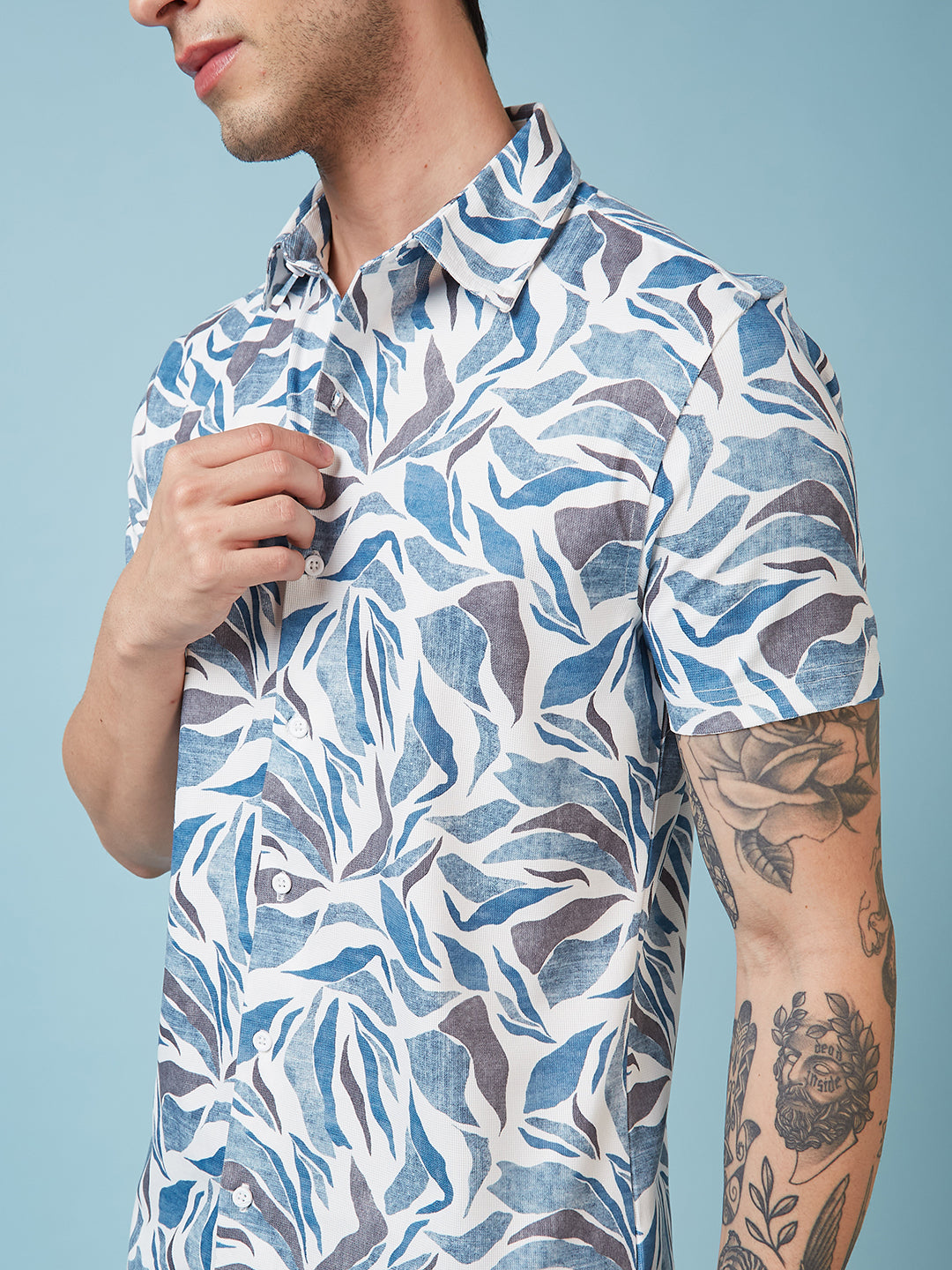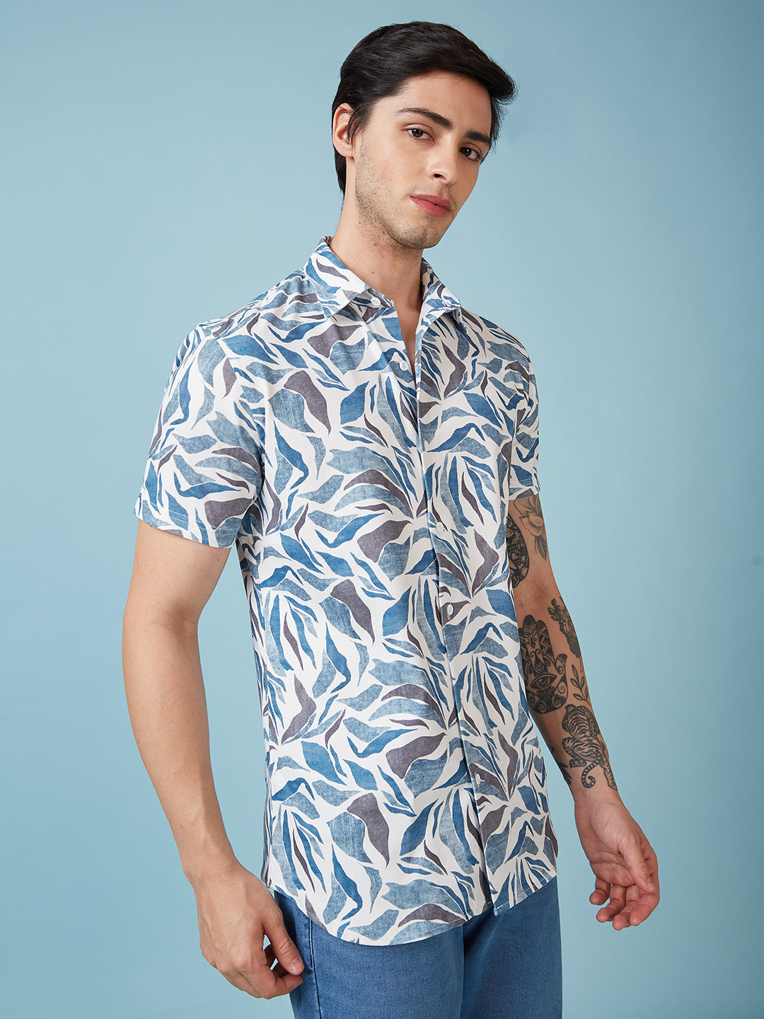 White/Blue Mens Printed Half Sleeves Shirt