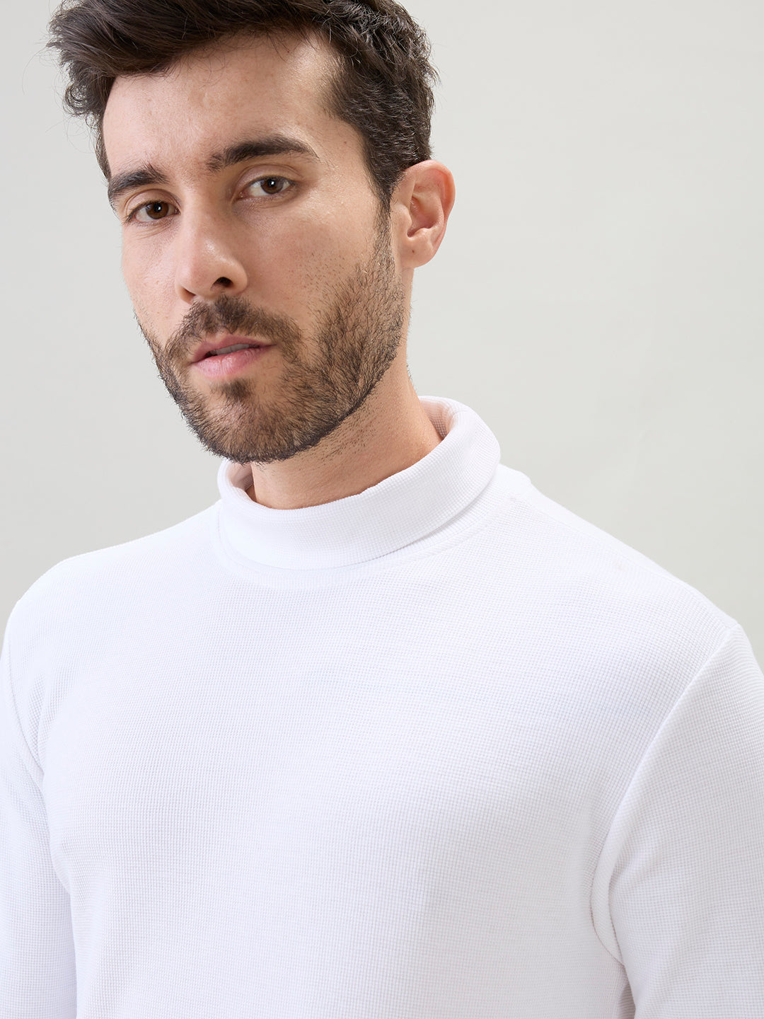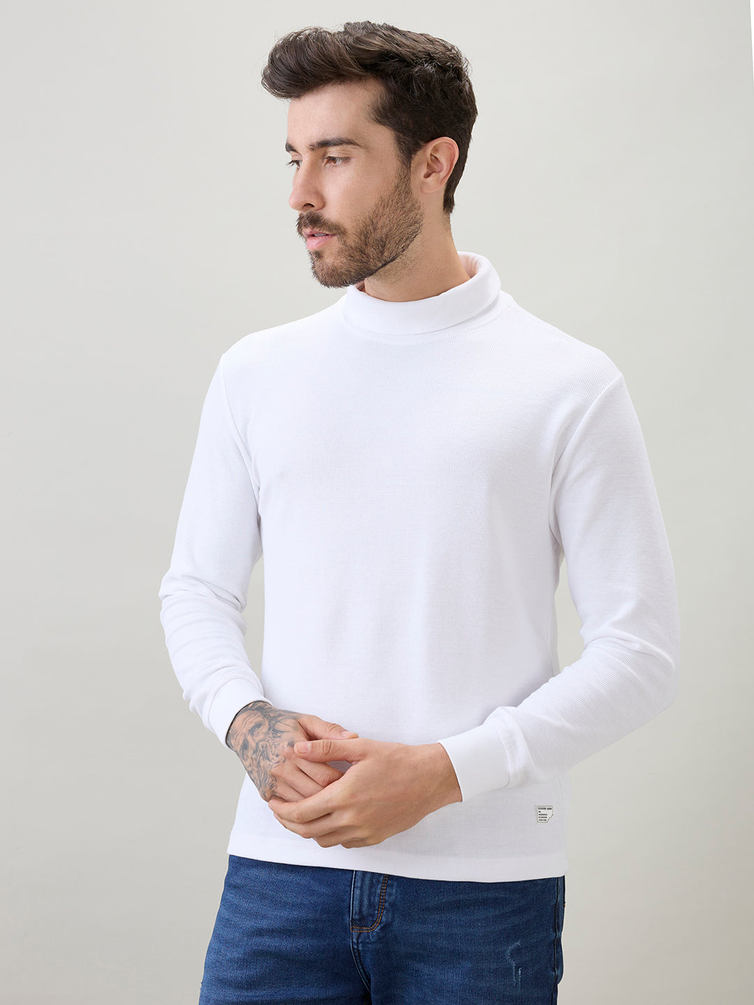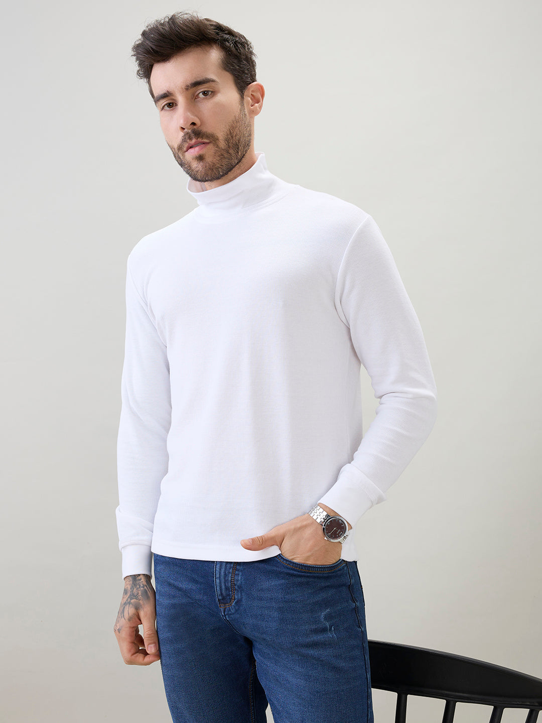 WHITE Men's Solid High Neck Full Sleeve Regular Fit T-Shirt
