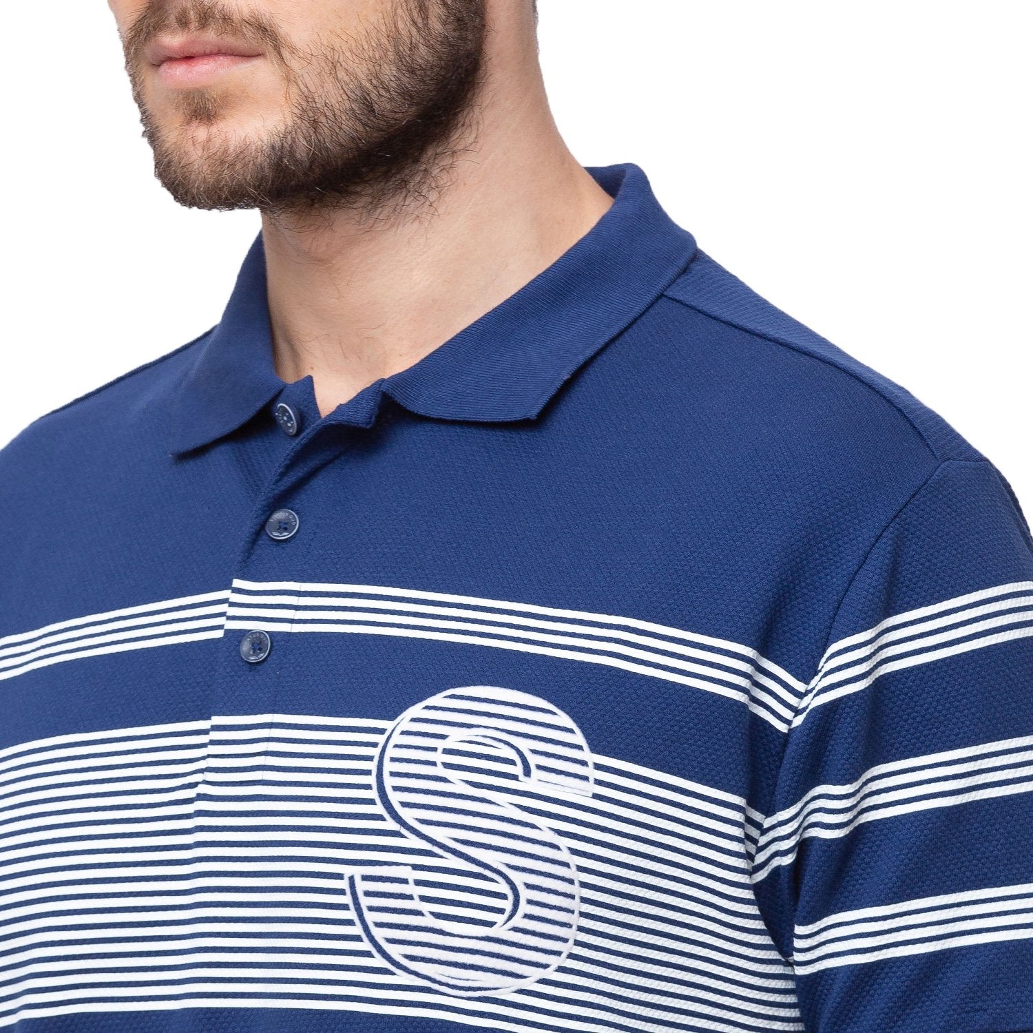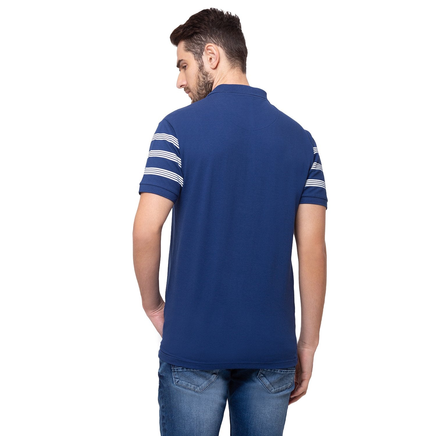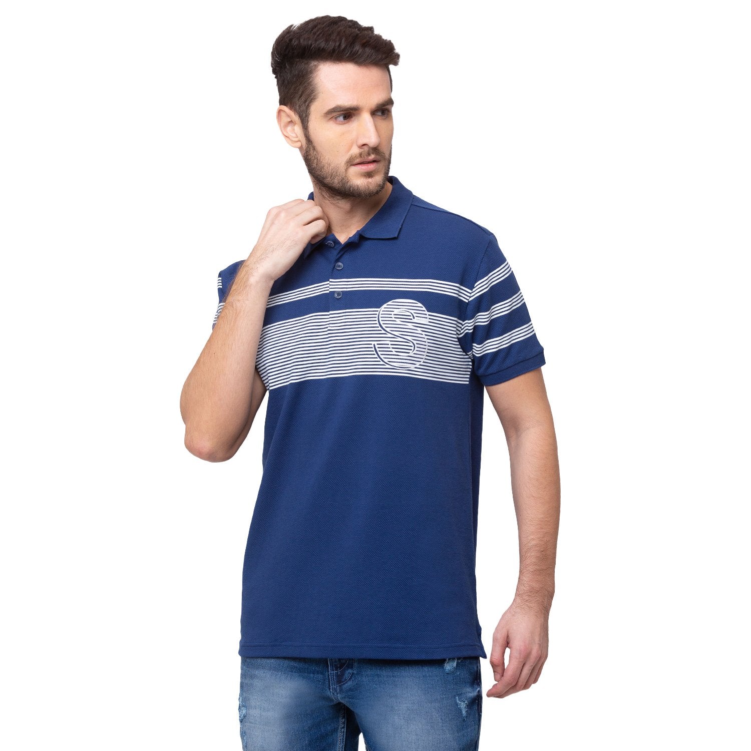 INDIGO Horizontal Stripes Collar Neck T-Shirt has a Transfer Print , half sleeves.